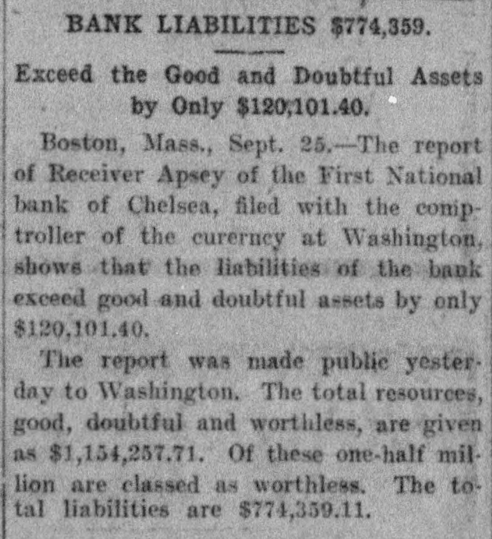BANK LIABILITIES $774,359. Exceed the Good and Doubtful Assets by Only $120,101.40. Boston, Mass., Sept. 25.-The report of Receiver Apsey of the First National bank of Chelsea, filed with the comptroller of the curerney at Washington, shows that the liabilities of the bank exceed good and doubtful assets by only $120,101.40. The report was made public yesterday to Washington. The total resources, good, doubtful and worthless, are given as $1,154,257.71. Of these one-half million are classed as worthless, The total liabilities are $774,359.11.