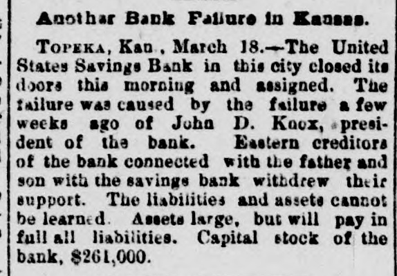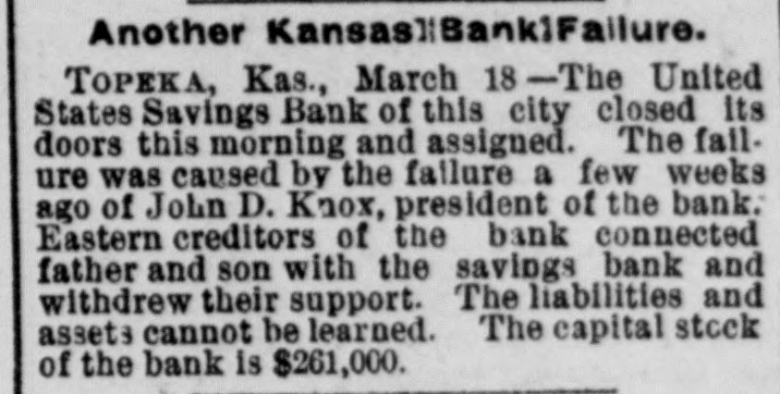 Another Kansas]BankiFailure. TOPEKA, Kas., March 18 - -The United States Savings Bank of this city closed its doors this morning and assigned. The failure was caused by the failure a few weeks ago of John D. Knox, president of the bank. Eastern creditors of the bank connected father and son with the savings bank and withdrew their support. The liabilities and assets cannot be learned. The capital stock of the bank is $261,000.