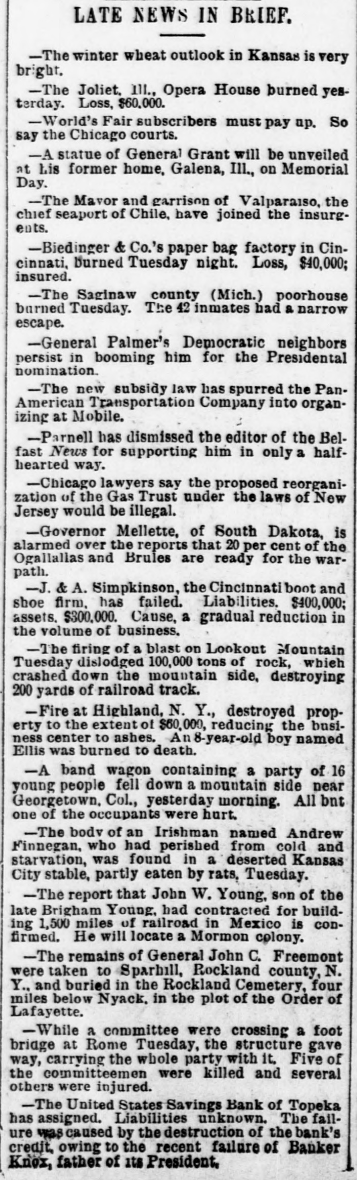 LATE NEWS IN BRIEF. -The winter wheat outlook in Kansas is very bright. -The Joliet. III., Opera House burned yesterday. Loss, $60,000. -World's Fair subscribers must pay up. So say the Chicago courts. -A statue of General Grant will be unveiled at Lis former home, Galena, Ill., on Memorial Day. -The Mavor and garrison of Valparaiso, the chief seaport of Chile, have joined the insurgents. -Biedinger & Co.'s paper bag factory in Cincinnati, burned Tuesday night. Loss, $40,000; insured. -The Saginaw county (Mich.) poorhouse burned Tuesday. The 42 inmates had a narrow escape. -General Palmer's Democratic neighbors persist in booming him for the Presidental nomination. -The new subsidy law has spurred the PanAmerican Transportation Company into organizing at Mobile. -Parnell has dismissed the editor of the Belfast News for supporting him in only a halfhearted way. -Chicago lawyers say the proposed reorganization of the Gas Trust under the laws of New Jersey would be illegal. -Governor Mellette, of South Dakota, is alarmed over the reports that 20 per cent of the Ogallallas and Brules are ready for the warpath. -J. & A. Simpkinson, the Cincinnati boot and shoe firm, has failed. Liabilities. $400,000; assets. $300,000. Cause, a gradual reduction in the volume of business. -The firing of a blast on Lookout Mountain Tuesday dislodged 100,000 tons of rock, which crashed down the mountain side, destroying 200 yards of railroad track. -Fire at Highland, N. Y., destroyed property to the extent of $60,000, reducing the business center to ashes. An 8-year-old boy named Ellis was burned to death. -A band wagon containing a party of 16 young people fell down a mountain side near Georgetown. Col., yesterday morning. All but one of the occupants were hurt. -The bodv of an Irishman named Andrew Finnegan, who had perished from cold and starvation, was found in a deserted Kansas City stable, partly eaten by rats, Tuesday. -The report that John W. Young, son of the late Brigham Young, had contracted for building 1,500 miles of railroad in Mexico is confirmed. He will locate a Mormon colony. -The remains of General John C. Freemont were taken to Sparhill, Rockland county, N. Y., and buried in the Rockland Cemetery, four miles below Nyack. in the plot of the Order of Lafayette. -While a committee were crossing a foot bridge at Rome Tuesday, the structure gave way, carrying the whole party with it. Five of the committeemen were killed and several others were injured. -The United States Savings Bank of Topeka has assigned. Liabilities unknown. The failure was caused by the destruction of the bank's credit, owing to the recent failure of Banker Knox, father of its President.