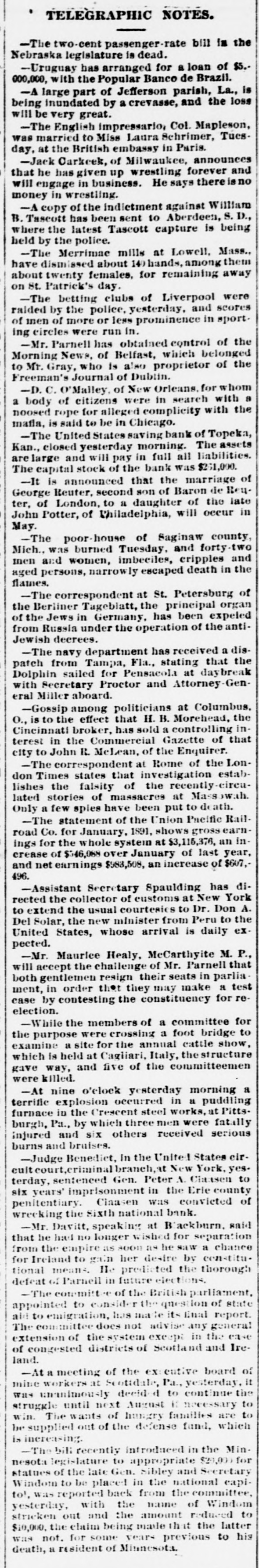 TELEGRAPHIC NOTES. -The two-cent passenger-rate bill in the Nebraska legislature is dead. -Uruguay has arranged for a loan of $5.000,000, with the Popular Banco de Brazil. -A large part of Jefferson parish, La., is being inundated by a crevasse, and the loss will be very great. -The English impressario, Col. Mapleson, was married to Miss Laura Schrimer, Tuesday, at the British embassy in Paris. -Jack Oarkeek, of Milwaukee, announces that he has given up wrestling forever and will engage in business. He says there is no money in wrestling. -A copy of the indictment against William B. Tascott has been sent to Aberdeen, S. D., where the latest Tascott capture is being held by the police. -The Merrimae mills at Lowell, Mass., have dismissed about 140hands, among them about twenty females, for remaining away on St. Patrick's day. -The betting clubs of Liverpool were raided by the police, yesterday, and scores of men of more or less prominence in sporting circles were run in. -Mr. Parnell has obtained control of the Morning News, of Belfast, which belonged to Mr. Gray, who is also proprietor of the Freeman's Journal of Dubtin. -D. C. O'Malley, of New Orleans. for whom a body of citizens were in search with a noosed rope for alleged complicity with the mafla, is said to be in Chicago. -The United States saving bank of Topeka, Kan., closed yesterday morning. The assets are large and will pay in full all liabilities. The capital stock of the bank was $261,000. -It is announced that the marriage of George Reuter, second son of Baron de Reuter, of London, to a daughter of the late John Potter, of Philadelphia, will occur in May. -The poor-house of Saginaw county, Mich., was burned Tuesday, and forty-two men and women, imbeciles, cripples and aged persons, narrowly escaped death in the flames. -The correspondent at St. Petersburg of the Berliner Tageblatt, the principal organ of the Jews in Germany, has been expeled from Russia under the operation of the antiJewish decrees. -The navy department has received a dispatch from Tampa, Fla., stating that the Dolphin sailed for Pensacola at daybreak with Secretary Proctor and Attorney-General Miller aboard. -Gossip among politicians at Columbus. O., is to the effect that H. B. Morehead, the Cincinnati broker, has sold a controlling interest in the Commercial Gazette of that city to John R. McLean, of the Enquirer. -The correspondent at Rome of the London Times states that investigation establishes the falsity of the recently circulated stories of massacres at Mass owah. Only a few spies have been put to de ath. -The statement of the Union Pacific Railroad Co. for January, 1891, shows gross earnings for the whole system at $3,115,376, an increase of $546,088 over January of last year, and net earnings $983,508, an increase of $607,496. -Assistant Secretary Spaulding has directed the collector of customs at New York to extend the usual courtesies to Dr. Don A. Del Solar, the new minister from Peru to the United States, whose arrival is daily expected. -Mr. Maurice Healy, McCarthyite M. P., will accept the chailenge of Mr. Parnell that both gentlemen resign their seats in parliament, in order that they may make a test case by contesting the constituency for reelection. -While the members of a committee for the purpose were crossing a foot bridge to examine a site for the annual cattle show, which is held at Cagliari, Italy, the structure gave way, and five of the committeemen were killed. -At nine o'clock yesterday morning a terrific explosion occurred in a puddling furnace in the Crescent steel works, at Pitts. burgh, Pa., by which three men were fatally injured and six others received serious burns and bruises. -Judge Benedict, in the United States circuit court,criminal branch, at New York, yes. terday, sentenced Gen. Peter A. Classen to six years' imprisonment in the Erie county penitentiary. Claasen was convicted of wreeking the Sixth national bank. -Mr. Davitt, speaking at Blackburn, said that he had no longer wished for separation from the empire as soon as he saw a chance for Ireland to gain her desire by constitutional means. He predicted the thorough defeat of Parnell in future elections. -The committ of the British parliament, appointed to consider the question of state aid to emigration, has na te its Enal report. The committee does not advise any general extension of the system except in the case of congested districts of Scotland and Ireland. -At a meeting of the ex: cutive board of mine workers at Scottdale, Pa., yesterday, it was unanimously decid d to continue the struggle until next August If necessary to win. The wants of hungry families are to be supplied out of the defense fund, which is increasing. -The bill recently introduced in the Min. nesota legislature to appropriate $20,000 for statues of the late Gen. Sibley and Secretary Windom to be placed in the national capi-
