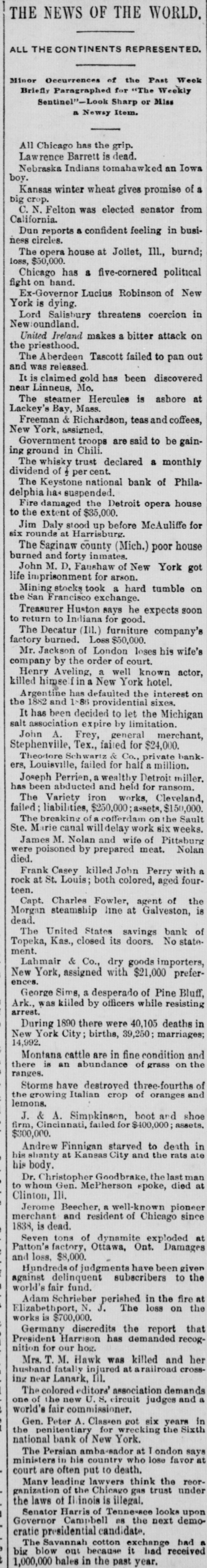 THE NEWS OF THE WORLD. ALL THE CONTINENTS REPRESENTED. Minor Occurrences of the Past Week Briefly Paragraphed for "The Weekly Sentinel"-Look Sharp or Miss a Newsy Item. All Chicago has the grip. Lawrence Barrett is dead. Nebraska Indians tomahawked an Iowa boy. Kansas winter wheat gives promise of a big crop. C. N. Felton was elected senator from California. Dun reports a confident feeling in business circles. The opera house at Joliet, Ill., burnd; loss, $50,000. Chicago has a five-cornered political fight on hand. Ex-Governor Lucius Robinson of New York is dying. Lord Salisbury threatens coercion in New oundland. United Ireland makes a bitter attack on the priesthood. The Aberdeen Tascott failed to pan out and was released. It is claimed gold has been discovered near Linneus, Mo. The steamer Hercules is ashore at Lackey's Bay, Mass. Freeman & Richardson, teas and coffees, New York, assigned. Government troops are said to be gaining ground in Chili. The whisky trust declared a monthly dividend of 1 per cent. The Keystone national bank of Philadelphia has suspended. Fire damaged the Detroit opera house to the extent of $35,000. Jim Daly stood up before McAuliffe for six rounds at Harrisburg. The Saginaw county (Mich.) poor house burned and forty inmates. John M. D. Faushaw of New York got life imprisonment for arson. Mining stocks took a hard tumble on the San Francisco exchange. Treasurer Huston says he expects soon to return to Indiana for good. The Decatur (III.) furniture company's factory burned. Loss $50,000. Mr. Jackson of London loses his wife's company by the order of court. Henry Aveling, a well known actor, killed himse f in a New York hotel. Argentine has defaulted the interest on the 1882 and 1886 providential sixes. It has been decided to let the Michigan salt association expire by limitation. John A. Frey, general merchant, Stephenville, Tex., failed for $24,000. Theodore Schwartz & Co., private bankers, Louisville, failed for half a million. Joseph Perrien,a wealthy Detroit miller. has been abducted and held for ransom. The Variety iron works, Cleveland, failed; liabilities, $250,000 assets, $150,000. The breaking of a cofferdam on the Sault Ste. Marie canal will delay work six weeks. James M. Nolan and wife of Pittsburg were poisoned by prepared meat. Nolan died. Frank Casey killed John Perry with a rock at St. Louis; both colored, aged fourteen. Capt. Charles Fowler, agent of the Morgan steamship line at Galveston, is dead. The United States savings bank of Topeka, Kas., closed its doors. No statement. Lahmair & Co., dry goods importers, New York, assigned with $21,000 preferences. George Sims, a desperado of Pine Bluff, Ark., was killed by officers while resisting arrest. During 1890 there were 40,105 deaths in New York City; births, 39,250; marriages; 14,992. Montana cattle are in fine condition and there is an abundance of grass on the ranges. Storms have destroyed three-fourths of the growing Italian crop of oranges and lemons. J. & A. Simpkinson, boot and shoe firm, Cincinnati, failed for $400,000; assets. $300,000. Andrew Finnigan starved to death in his shanty at Kansas City and the rats ate his body. Dr. Christopher Goodbrake, the last man to whom Gen. McPherson spoke, died at Clinton, III. Jerome Beecher, a well-known pioneer merchant and resident of Chicago since 1838, is dead. Seven tons of dynamite exploded at Patton's factory, Ottawa, Ont. Damages and loss, $8,000. Hundreds of judgments have been given against delinquent subscribers to the world's fair fund. Adam Schrieber perished in the fire at Elizabethport, N. J. The loss on the works is $700,000. Germany discredits the report that President Harrison has demanded recognition for our hog. Mrs. T. M. Hawk was killed and her husband fatally injured at arailroad crossing near Lanark, III. The colored editors' association demands one of the new U. S. circuit judges and a world's fair commissioner. Gen. Peter A. Classen got six years in the penitentiary for wrecking the Sixth national bank of New York. The Persian amba-sador at T ondon says ministers in his country who lose favor at court are often put to death. Many leading lawyers think the reorganization of the Chicago gas trust under the laws of Illinois is illegal. Senator Harris of Tennessee looks upon