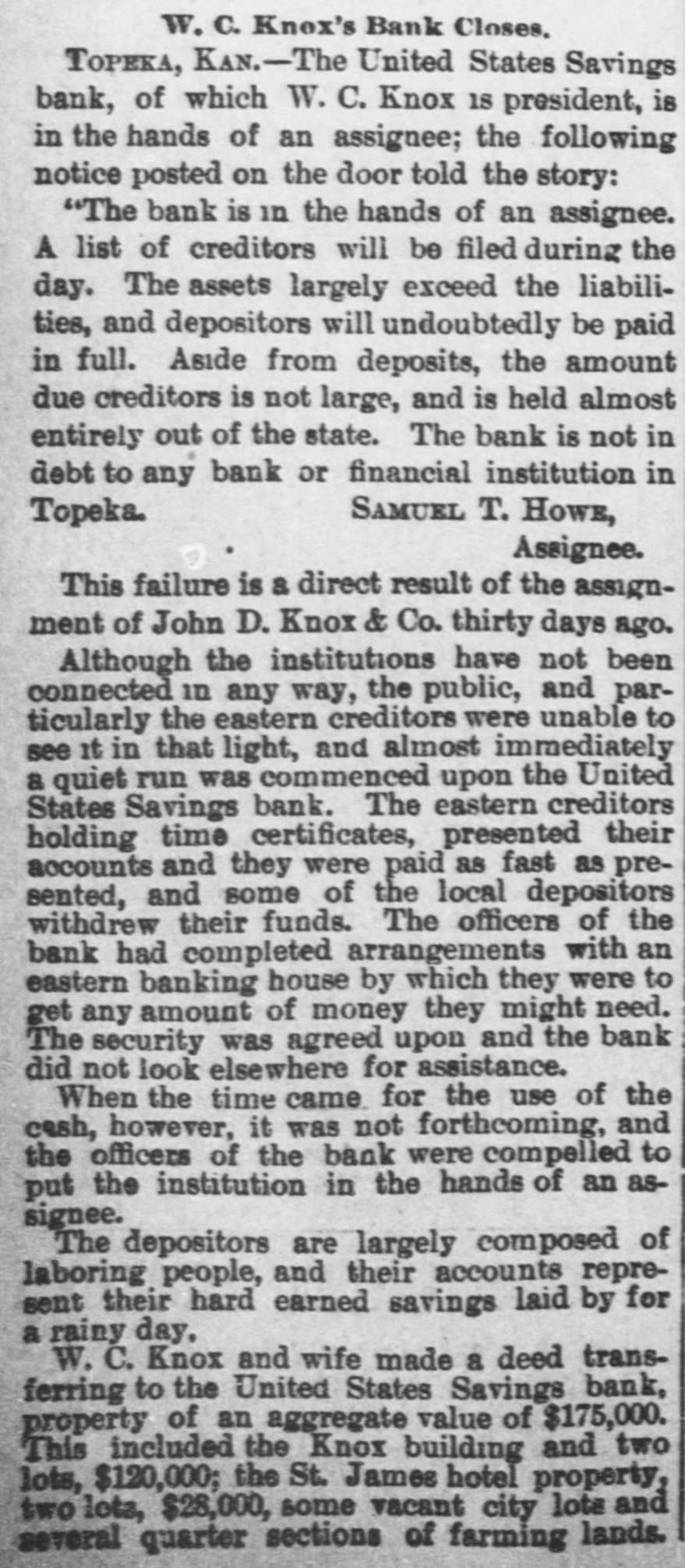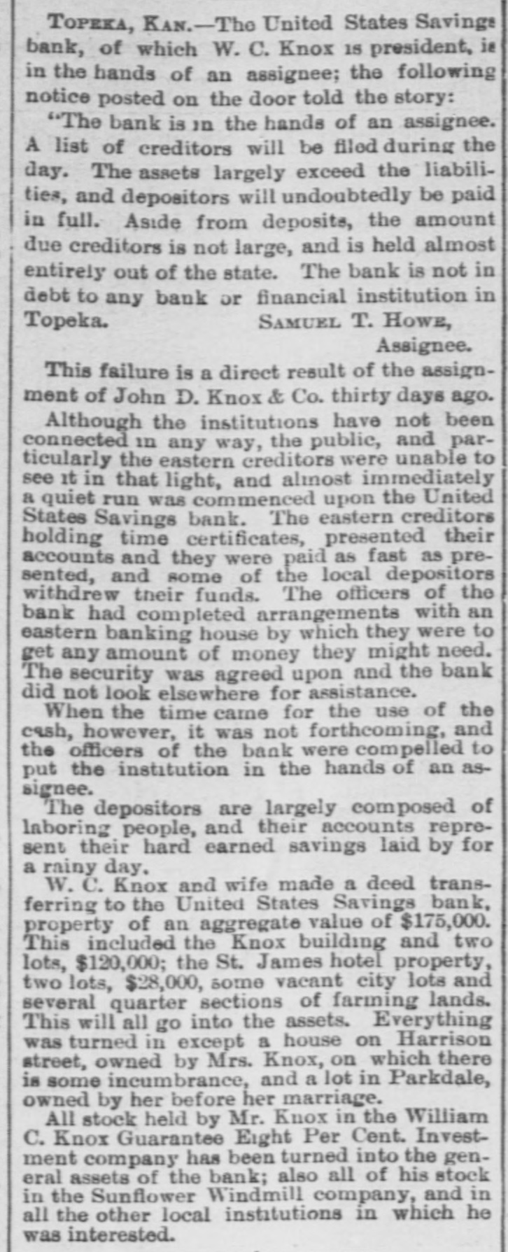 TOPEKA, KAN.-Tho United States Savings bank, of which W. C. Knox 18 president, is in the hands of an assignee; the following notice posted on the door told the story: "The bank is in the hands of an assignee. A list of creditors will be filed during the day. The assets largely exceed the liabilities, and depositors will undoubtedly be paid in full. Aside from deposits, the amount due creditors is not large, and is held almost entirely out of the state. The bank is not in debt to any bank or financial institution in SAMUEL T. HOWE, Topeka. Assignee. This failure is a direct result of the assignment of John D. Knox & Co. thirty days ago. Although the institutions have not been connected in any way, the public, and particularly the eastern creditors were unable to see it in that light, and almost immediately a quiet run was commenced upon the United States Savings bank. The eastern creditors holding time certificates, presented their accounts and they were paid as fast as presented, and some of the local depositors withdrew their funds. The officers of the bank had completed arrangements with an eastern banking house by which they were to get any amount of money they might need. The security was agreed upon and the bank did not look elsewhere for assistance. When the time came for the use of the cash, however, it was not forthcoming, and the officers of the bank were compelled to put the institution in the hands of an assignee. The depositors are largely composed of laboring people, and their accounts represent their hard earned savings laid by for a rainy day. W. C. Knox and wife made a deed transferring to the United States Savings bank, property of an aggregate value of $175,000. This included the Knox building and two lots, $120,000; the St. James hotel property, two lots, $28,000, some vacant city lots and several quarter sections of farming lands. This will all go into the assets. Everything was turned in except a house on Harrison street, owned by Mrs. Knox, on which there is some incumbrance, and a lot in Parkdale, owned by her before her marriage. All stock held by Mr. Knox in the William C. Knox Guarantee Eight Per Cent. Investment company has been turned into the general assets of the bank; also all of his stock in the Sunflower Windmill company, and in all the other local institutions in which he was interested.