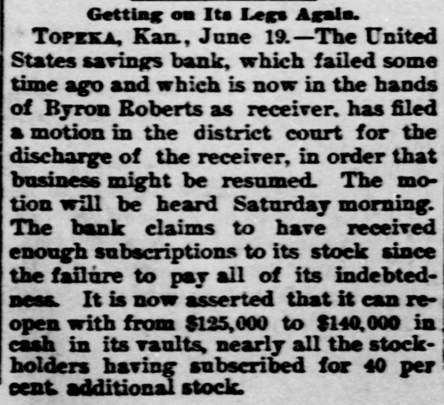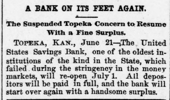 A BANK ON ITS FEET AGAIN. The Suspended Topeka Concern to Resume With a Fine Surplus. TOPEKA, KAN., June 21-The United States Savings Bank, one of the oldest institutions of the kind in the State, which failed during the stringency in the money markets, will re-open July 1. All depositors will be paid in full, and the bank will start over again with a handsome surplus.