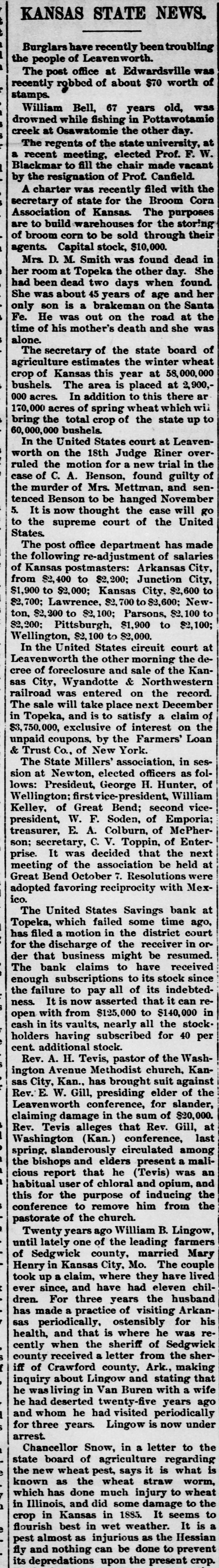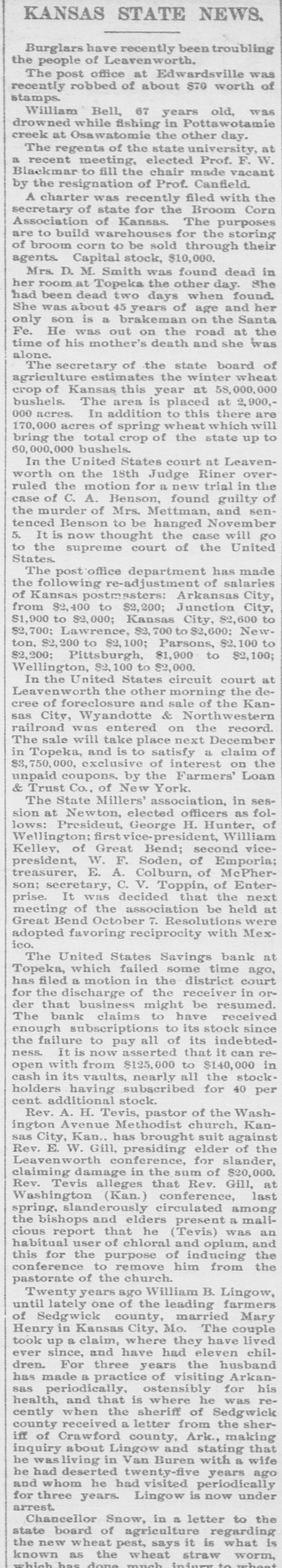 KANSAS STATE NEWS. Burglars have recently been troubling the people of Leavenworth. The post office at Edwardsville was recently robbed of about $70 worth of stamps. William Bell, 67 years old, was drowned while fishing in Pottawotamie creek at Osawatomie the other day. The regents of the state university, at a recent meeting, elected Prof. F. W. Blackmar to fill the chair made vacant by the resignation of Prof. Canfield. A charter was recently filed with the secretary of state for the Broom Corn Association of Kansas. The purposes are to build warehouses for the storing of broom corn to be sold through their agents. Capital stock, $10,000. Mrs. D. M. Smith was found dead in her room at Topeka the other day. She had been dead two days when found. She was about 45 years of age and her only son is a brakeman on the Santa Fe. He was out on the road at the time of his mother's death and she was alone. The secretary of the state board of agriculture estimates the winter wheat crop of Kansas this year at 58,000,000 bushels. The area is placed at 2,900,000 acres. In addition to this there are 170,000 acres of spring wheat which will bring the total crop of the state up to 60,000,000 bushels. In the United States court at Leavenworth on the 18th Judge Riner overruled the motion for a new trial in the case of C. A. Benson, found guilty of the murder of Mrs. Mettman, and sentenced Benson to be hanged November 5. It is now thought the case will go to the supreme court of the United States. The post office department has made the following re-adjustment of salaries of Kansas postmasters: Arkansas City, from $2,400 to $2,200; Junction City, $1,900 to $2,000; Kansas City, $2,600 to $2,700; Lawrence, $2, 700 to $2,600; New. ton, $2,200 to 100; Parsons, $2,100 to $2,200; Pittsburgh, $1,900 to $2,100; Wellington, $2,100 to $2,000. In the United States circuit court at Leavenworth the other morning the decree of foreclosure and sale of the Kansas City, Wyandotte & Northwestern railroad was entered on the record. The sale will take place next December in Topeka, and is to satisfy a claim of $8,750,000, exclusive of interest on the unpaid coupons, by the Farmers' Loan & Trust Co., of New York. The State Millers' association, in session at Newton, elected officers as follows: President, George H. Hunter, of Wellington; firstvice-president, William Kelley, of Great Bend; second vicepresident, W. F. Soden, of Emporia; treasurer, E. A. Colburn, of McPherson; secretary, C. V. Toppin, of Enterprise. It was decided that the next meeting of the association be held at Great Bend October 7. Resolutions were adopted favoring reciprocity with Mexico. The United States Savings bank at Topeka, which failed some time ago, has filed a motion in the district court for the discharge of the receiver in order that business might be resumed. The bank claims to have received enough subscriptions to its stock since the failure to pay all of its indebtedness. It is now asserted that it can reopen with from $125,000 to $140,000 in cash in its vaults, nearly all the stockholders having subscribed for 40 per cent. additional stock. Rev. A. H. Tevis, pastor of the Washington Avenue Methodist church, Kansas City, Kan., has brought suit against Rev. E. W. Gill, presiding elder of the Leavenworth conference, for slander, claiming damage in the sum of $20,000. Rev. Tevis alleges that Rev. Gill, at Washington (Kan.) conference, last spring, slanderously circulated among the bishops and elders present a malicious report that he (Tevis) was an habitual user of chloral and opium, and this for the purpose of inducing the conference to remove him from the pastorate of the church. Twenty years ago William B. Lingow, until lately one of the leading farmers of Sedgwick county, married Mary Henry in Kansas City, Mo. The couple took up a claim, where they have lived ever since, and have had eleven children. For three years the husband has made a practice of visiting Arkansas periodically, ostensibly for his health, and that is where he was recently when the sheriff of Sedgwick county received a letter from the sheriff of Crawford county, Ark., making inquiry about Lingow and stating that he wasliving in Van Buren with a wife he had deserted twenty-five years ago and whom he had visited periodically for three years. Lingow is now under arrest. Chancellor Snow, in a letter to the state board of agriculture regarding the new wheat pest, says it is what is known as the wheat straw worm, which has done much injury to wheet