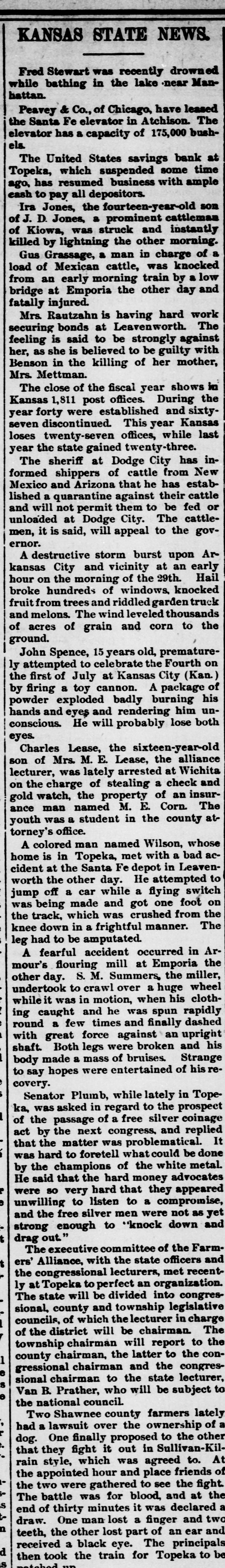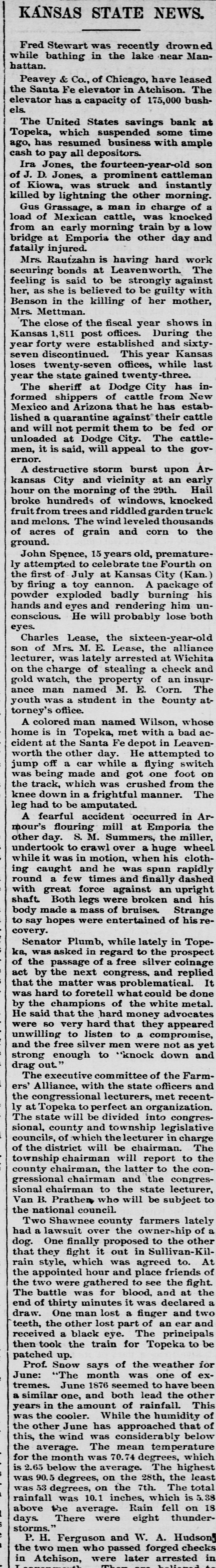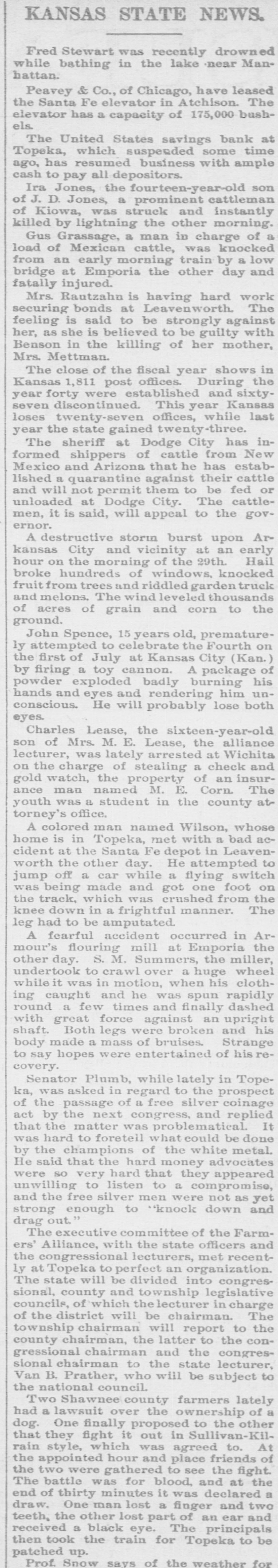 KANSAS STATE NEWS. Fred Stewart was recently drowned while bathing in the lake near Manhattan. Peavey & Co., of Chicago, have leased the Santa Fe elevator in Atchison. The elevator has a capacity of 175,000 bushels. The United States savings bank at Topeka, which suspended some time ago, has resumed business with ample cash to pay all depositors. Ira Jones, the fourteen-year-old son of J. D. Jones, a prominent cattleman of Kiowa, was struck and instantly killed by lightning the other morning. Gus Grassage, a man in charge of a load of Mexican cattle, was knocked from an early morning train by a low bridge at Emporia the other day and fatally injured. Mrs. Rautzahn is having hard work securing bonds at Leavenworth. The feeling is said to be strongly against her, as she is believed to be guilty with Benson in the killing of her mother, Mrs. Mettman. The close of the fiscal year shows in Kansas 1,811 post offices. During the year forty were established and sixtyseven discontinued. This year Kansas loses twenty-seven offices, while last year the state gained twenty-three. The sheriff at Dodge City has informed shippers of cattle from New Mexico and Arizona that he has established a quarantine against their cattle and will not permit them to be fed or unloaded at Dodge City. The cattlemen, it is said, will appeal to the governor. A destructive storm burst upon Arkansas City and vicinity at an early hour on the morning of the 29th. Hail broke hundreds of windows, knocked fruit from trees and riddled garden truck and melons. The wind leveled thousands of acres of grain and corn to the ground. John Spence, 15 years old, prematurely attempted to celebrate the Fourth on the first of July at Kansas City (Kan.) by firing a toy cannon. A package of powder exploded badly burning his hands and eyes and rendering him unconscious. He will probably lose both eyes. Charles Lease, the sixteen-year-old son of Mrs. M. E. Lease, the alliance lecturer, was lately arrested at Wichita on the charge of stealing a check and gold watch, the property of an insurance man named M. E. Corn. The youth was a student in the county attorney's office. A colored man named Wilson, whose home is in Topeka, met with a bad accident at the Santa Fe depot in Leavenworth the other day. He attempted to jump off a car while a flying switch was being made and got one foot on the track, which was crushed from the knee down in a frightful manner. The leg had to be amputated. A fearful accident occurred in Armour's flouring mill at Emporia the other day. S. M. Summers, the miller, undertook to crawl over a huge wheel while it was in motion, when his clothing caught and he was spun rapidly round a few times and finally dashed with great force against an upright shaft. Both legs were broken and his body made a mass of bruises. Strange to say hopes were entertained of his recovery. Senator Plumb, while lately in Topeka, was asked in regard to the prospect of the passage of a free silver coinage act by the next congress, and replied that the matter was problematical. It was hard to foretell what could be done by the champions of the white metal. He said that the hard money advocates were so very hard that they appeared unwilling to listen to a compromise, and the free silver men were not as yet strong enough to "knock down and drag out. The executive committee of the Farmers' Alliance, with the state officers and the congressional lecturers, met recently at Topeka to perfect an organization. The state will be divided into congressional, county and township legislative councils, of which the lecturer in charge of the district will be chairman. The township chairman will report to the county chairman, the latter to the congressional chairman and the congressional chairman to the state lecturer, Van B. Prather who will be subject to the national council. Two Shawnee county farmers lately had a lawsuit over the ownership of a dog. One finally proposed to the other that they fight it out in Sullivan-Kilrain style, which was agreed to. At the appointed hour and place friends of the two were gathered to see the fight. The battle was for blood, and at the end of thirty minutes it was declared a draw. One man lost a finger and two teeth, the other lost part of an ear and received a black eye. The principals then took the train for Topeka to be patched up. Prof. Snow says of the weather for June: "The month was one of extremes. June 1876 seemed to have been a similar one, and both lead the other years in the amount of rainfall. This was the cooler. While the humidity of the other June has approached that of this, the wind was considerably below the average. The mean temperature for the month was 70.74 degrees, which is 2.65 below the average. The highest was 90.5 degrees, on the 28th, the least was 53 degrees, on the 7th. The total rainfall was 10.1 inches, which is 5. 38