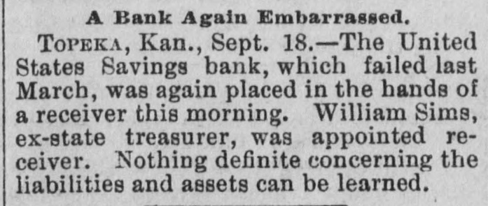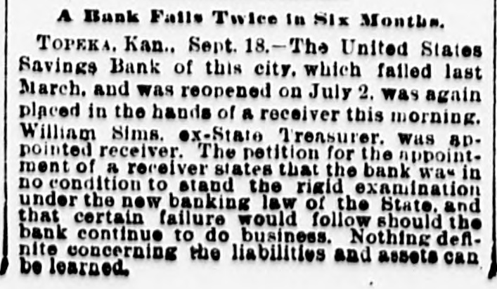 A Bank Fails Twice In Six Months. TOPEKA. Kan.. Sept. 18.-The United States Savings Bank of this city, which failed last March. and was reopened on July 2. was again placed in the hands of a receiver this morning. William Sims. ex-State Treasurer. was appointed receiver. The petition for the appointment of a receiver states that the bank was in no condition to stand the rigid examination under the new banking law of the State. and that certain failure would follow should the bank continue to do business. Nothing definite concerning the liabilities and assets can be learned.