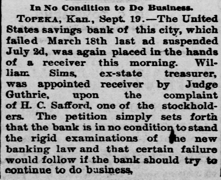 In No Condition to Do Business. TOPEKA, Kan., Sept. 19.-The United States savings bank of this city, which failed March 18th last ad suspended July 2d, was again placed in the hands of a receiver this morning. William Sims, ex-state treasurer, was appointed receiver by Judge Guthrie, upon the complaint of H. C. Safford, one of the stockholders. The petition simply sets forth that the bank is in no condition to stand the rigid examinations of the new banking law and that certain failure would follow if the bank should try to continue to do business,