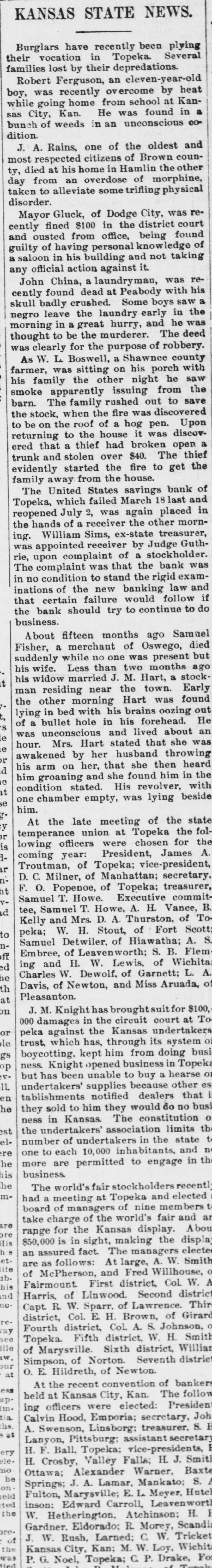 kansas STATE NEWS. their Burglars have recently been families vocation in Topeka. Several plying lost by their depredations. Robert Ferguson, an eleven-year-old boy, while was recently overcome by heat sas City, going home from school at bunch Kan. He was found Kandition. of weeds in an unconscious in CO- a J. A. Rains, one of the oldest ty, most died respected citizens of Brown and day at his home in Hamlin the countaken from an overdose of other disorder. to alleviate some trifling morphine, physical Mayor Gluck, of Dodge City, cently and fined $100 in the district was reguilty ousted from office, being court a saloon of having personal knowledge found action against it. any official in his building and not taking of John China, a laundryman, skull cently found dead at Peabody was renegro badly crushed. Some boys with his morning leave the laundry early saw a thought in a great hurry, and in the was to be the murderer. The he was As clearly W. for the purpose of robbery. deed farmer, L. Boswell, a Shawnee his was sitting on his porch county smoke family the other night he with barn. apparently issuing from saw the The family rushed out to the to be stock, when the fire was discovered save returning on the roof of a hog pen. ered to the house it was Upon trunk that a thief had broken discovand stolen over $40. The open a evidently family started the fire to get thief the away from the house. The United States savings Topeka, reopened which failed March 18 bank last of the hands July 2, was again placed and ing. of a receiver the other in was William Sims, ex-state mornrie, appointed receiver by Judge treasurer, The upon complaint of a stockholder. Guthin complaint was that the bank inations no condition to stand the rigid was that of the new banking law examthe certain failure would and business. bank should try to continue follow to do if Fisher, About fifteen months ago suddenly a merchant of Oswego, Samuel his wife. while no one was died his widow Less than two months present but t man married J. M. Hart, ago the residing near the town. a stocklying other in morning Hart was Early of a bullet bed with his brains found S was hole in his forehead. oozing out e hour. unconscious and lived about He e awakened Mrs. Hart stated that she an r his by her husband was d him arm on her, that she then throwing e condition groaning and she found him heard it se one chamber stated. His revolver, in the him. empty, was lying beside with y At the late meeting of the r is temperance lowing union at Topeka state coming officers were chosen the fol. r Troutman, year: for the D. C. of at F. O. Milner, of THE Samuel Popenoe, : d tee, Samuel T. Howe. Executive Kelly T. Howe, A. H. commitpeka; and Mrs. D. A. Thurston, Vance, of B. to Samuel W. H. Tonff Embree, Scott; ed Charles and Flem ne ing Detwiler, THE A. S. th Davis, W. Dewolf, of Garnett; at Pleasanton. of Newton, and Miss Aruada, L. A. of on 000 J. M. Knight has brought suit for or peka damages in the circuit $100, le trust, against the Kansas court at To which has, through its undertakers gs pp ness. boycotting, kept him from doing system oi : but has Knight opened business in busi been unable to buy a Topeka 11. en undertakers' supplies because hearse or he they tablishments notified dealers other es ness sold in to him they would do that st the Kansas. The constitution no busi number undertakers' association limits o re one to of undertakers in the the he more each 10,000 inhabitants, state to is business. are permitted to engage and in the n he à had The world's fair stockholders board a meeting at Topeka and recentl take of managers of nine elected charge of the world's fair members t re Iis range $50,000 for the Kansas display. and an 8 an is in sight, making the Abou et. are assured as fact. The managers displa life of follows: At large, A. W. elected the McPherson, and Fred Willhouse, Smith nd Harris, Fairmount. First district, Col. 10. Capt. R. of Linwood. Second W. A district, W. Sparr. of Lawrence. district ay Fourth Col. E. H. Brown, of Thire ce Topeka. district, Col. A. S. Girard Ille of Fifth district, W. Johnson, H. o W. our Simpson, Marysville. Sixth district, Smith at O. E. of Norton. Seventh Willian district Hildreth, of Newton. At the recent convention of ip. m. held ing at Kansas City, Kan. The bankers a. Calvin officers were elected: follow hs. A. Hood, Emporia; secretary, President at Lanyon, Swenson, Linsborg: treasurer. Joh H. F. Pittsburg: assistant S. H ery Ne. H. Ball, Topeka; vice-presidents, secretary no Ottawa; Crosby, Valley Falls; H. J. P he Alexander Warner, Smith Springs; Fulton J. A. Lamar, Mankato: Baxte S eld