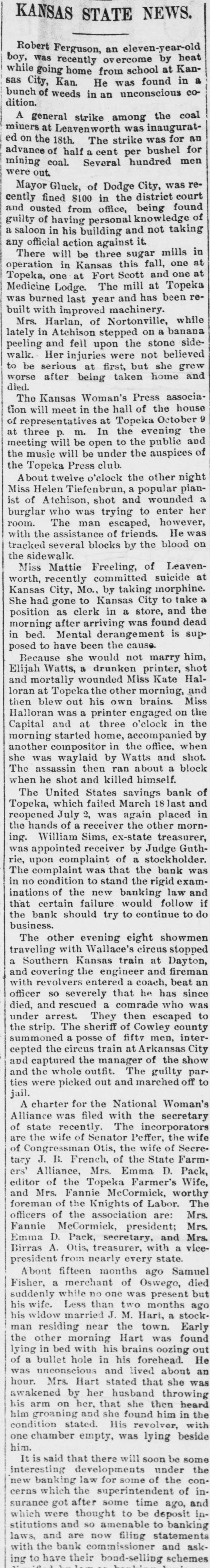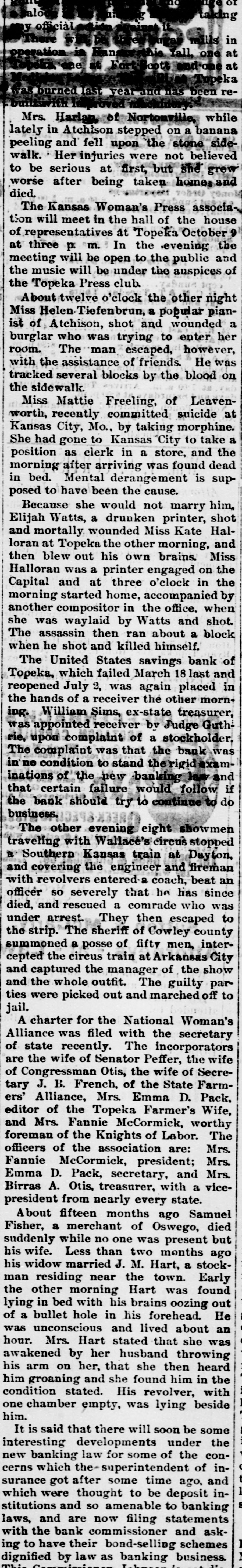 in at at been reMrs. Harlan, of Nortonville, while lately in Atchison stepped on a banana peeling and fell upon the stone sidewalk. Her injuries were not believed to be serious at first, but she grew worse after being taken home, and died. The Kansas Woman's Press association will meet in the hall of the house of representatives at Topeka October 9 at three p. m. In the evening the meeting will be open to the public and the music will be under the auspices of the Topeka Press club. About twelve o'clock the other night Miss Helen Tiefenbrun, a popular pianist of Atchison, shot and wounded a burglar who was trying to enter her room. The man escaped, however, with the assistance of friends. He was tracked several blocks by the blood on the sidewalk. Miss Mattie Freeling, of Leavenworth, recently committed suicide at Kansas City, Mo., by taking morphine. She had gone to Kansas "City to take a position as clerk in a store, and the morning after arriving was found dead in bed. Mental derangement is supposed to have been the cause. Because she would not marry him, Elijah Watts, a drunken printer, shot and mortally wounded Miss Kate Halloran at Topeka the other morning, and then blew out his own brains. Miss Halloran was a printer engaged on the Capital and at three o'clock in the morning started home, accompanied by another compositor in the office. when she was waylaid by Watts and shot. The assassin then ran about a block when he shot and killed himself. The United States savings bank of Topeka, which failed March 18 last and reopened July 2, was again placed in the hands of a receiver the other morning. William Sims, ex-state treasurer, was appointed receiver by Judge Guthrie, upon complaint of a stockholder. The complaint was that the bank was in no condition to stand therigid examinations of the new banking law and that certain failure would follow if the bank should try to continue to do business. The other evening eight showmen traveling with Wallace's circus stopped a Southern Kansas train at Dayton, and covering the engineer and fireman with revolvers entered a coach, beat an officer so severely that be has since died, and rescued a comrade who was under arrest. They then escaped to the strip. The sheriff of Cowley county summoned a posse of fifty men, intercepted the circus train at Arkansas City and captured the manager of the show and the whole outfit. The guilty parties were picked out and marched off to jail. A charter for the National Woman's Alliance was filed with the secretary of state recently. The incorporators are the wife of Senator Peffer, the wife of Congressman Otis, the wife of Secretary J. B. French, of the State Farmers' Alliance, Mrs. Emma D. Pack, editor of the Topeka Farmer's Wife, and Mrs. Fannie McCormick, worthy foreman of the Knights of Labor. The officers of the association are: Mrs. Fannie McCormick, president; Mrs. Emma D. Pack, secretary, and Mrs. Birras A. Otis, treasurer, with a vicepresident from nearly every state. About fifteen months ago Samuel Fisher, a merchant of Oswego, died suddenly while no one was present but his wife. Less than two months ago his widow married J. M. Hart, a stockman residing near the town. Early the other morning Hart was found lying in bed with his brains oozing out of a bullet hole in his forehead. He was unconscious and lived about an hour. Mrs. Hart stated that she was awakened by her husband throwing his arm on her, that she then heard him groaning and she found him in the condition stated. His revolver, with one chamber empty, was lying beside him. It is said that there will soon be some interesting developments under the new banking law for some of the concerns which the superintendent of insurance got after some time ago, and which were thought to be deposit inin stitutions and so amenable to banking laws, and are now filing statements with the bank commissioner and ask1 ing to have their bond-selling schemes :6 by law banking business