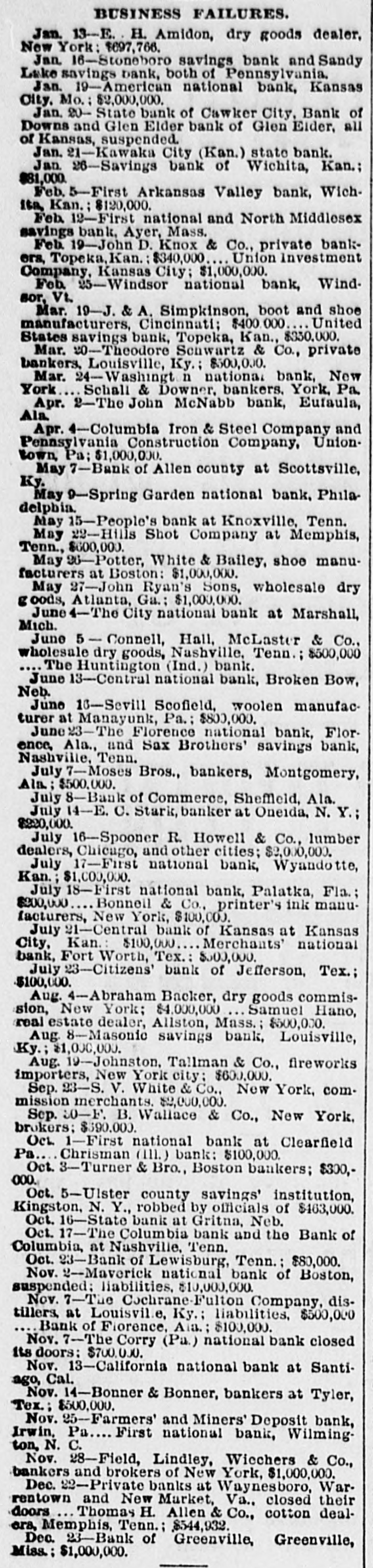 BUSINESS FAILURES. Jan. 13-E. H. Amidon, dry goods dealer, New York: $697,766. Jan. 16-Stoneboro savings bank and Sandy Lake savings bank, both of Pennsylvania. Jan. 19-American national bank, Kansas City. Mo.: $2,000,000. Jan. 20- State bank of Cawker City, Bank of Downs and Glen Elder bank of Glen Eider, all of Kansas, suspended. Jan. 21-Kawaka City (Kan.) state bank. Jan. 26-Savings bank of Wichita, Kan.; $81,000. Feb. 5-First Arkansas Valley bank, Wichits, Kan.; $120,000. Feb. 12-First national and North Middlesex savings bank, Ayer, Mass. Feb. 19-John D. Knox & Co., private bankers, Topeka, Kan.: $340,000 Union Investment Company, Kansas City; $1,000,000. Feb. 25-Windsor national bank, Windsor, Vt. Mar. 19-J. & A. Simpkinson, boot and shoe manufacturers, Cincinnati; $400.000. United States savings bank, Topeka, Kan., $330,000. Mar. 20-Theodore Schwartz & Co., private bankers, Louisville, Ky.; $500,000. Mar. 24-Washingt n national bank, New York Schall & Downer, bankers. York, Pa. Apr. 2-The John McNabb bank, Eufaula, Ala. Apr. 4-Columbia Iron & Steel Company and Pennsylvania Construction Company, Uniontown, Pa; $1,000,000. May 7-Bank of Allen county at Scottsville, Ky. May 9-Spring Garden national bank. Philadelphia. May 15-People's bank at Knoxville, Tenn. May 22-Hills Shot Company at Memphis, Tenn., $600,000. May 26-Potter, White & Bailey, shoe manufacturers at Boston: $1,000,000. May 27-John Ryan's Sons, wholesale dry g oods, Atlanta, Ga.: $1,000,000. June 4-The City national bank at Marshall, Mich. June 5 - Connell, Hall, McLaster & Co., wholesale dry goods, Nashville, Tenn.; $500,000 The Huntington (Ind.) bank. June 13-Central national bank, Broken Bow, Neb. June 10-Sevill Scofield, woolen manufacturer at Manayunk, Pa.: $800,000. June23-The Florence national bank, Florence, Ala., and Sax Brothers' savings bank, Nashville, Tenn. July 7-Moses Bros., bankers, Montgomery, Ala; $500,000. July 8-Bank of Commerce, Sheffield, Ala. July 14-E. C. Stark, banker at Oneida, N. Y.; $220,000. July 16-Spooner R. Howell & Co., lumber dealers, Chicago, and other cities; $2,000,000. July 17-First national bank, Wyandotte, Kan. $1,000,000. July 18-First national bank, Palatka, Fla.; $200,000 Bonneil & Co., printer's ink manufacturers, New York, $100,000. July 21-Central bank of Kansas at Kansas City, Kan.: $100,000 Merchants' national bank, Fort Worth, Tex.: $500,000. July 23-Citizens' bank of Jefferson, Tex.; $100,000. Aug. 4-Abraham Backer, dry goods commission, New York; $4,000,000 Samuel Hano, real estate dealer, Allston, Mass.; $500,000. Aug. 8-Masonic savings bank, Louisville, Ky.; $1,000,000. Aug. 19-Johnston, Tallman & Co., flreworks importers, New York city: $600,000. Sep. 23-S. V. White & Co., New York, commission merchants. $2,000,000. Sep. 30-F. B. Wallace & Co., New York, brokers; $390.000. Oct. 1-First national bank at Clearfield Pa... Chrisman (111.) bank: $100,000. Oct. 3-Turner & Bro., Boston bankers; $300,000. Oct. 5-Ulster county savings' institution, Kingston, N. Y., robbed by officials of $463,000. Oct. 16-State bank at Gritna, Neb. Oct. 17-The Columbia bank and the Bank of Columbia, at Nashville, Tenn. Oct. 23-Bank of Lewisburg, Tenn. $80,000. Nov. 2-Maverick national bank of Boston, suspended; liabilities, $10,000,000. Nov. 7-The Cochrane-Fulton Company, distillers, at Louisvil.e, Ky.; liabilities, $500,000 Bank of Fiorence, Aia.; $100,000. Nov. 7-The Corry (Pa.) national bank closed its doors: $700,000. Nov. 13-California national bank at Santiago, Cal. Nov. 14-Bonner & Bonner, bankers at Tyler, Tex.; $500,000. Nov. 25-Farmers' and Miners' Deposit bank, Irwin, Pa First national bank, Wilmington, N. C. Nov. 28-Field, Lindley, Wicchers & Co., bankers and brokers of New York, $1,000,000. Dec. 22-Private banks at Waynesboro, Warrentown and New Market, Va., closed their doors Thomas H. Allen & Co., cotton dealera, Memphis, Tenn.; $544,932. Dec. 23-Bank of Greenville, Greenville, Miss : $1,000,000.