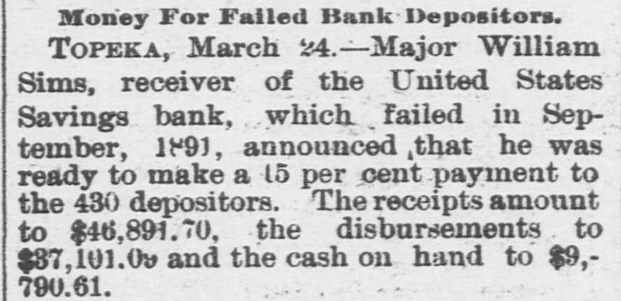 Money For Failed Bank Depositors. TOPEKA, March %4.-Major William Sims, receiver of the United States Savings bank, which failed in September, 1891, announced that he was ready to make a 15 per cent payment to the 430 depositors. The receipts amount to $46,891. 70, the disbursements to $37,101.09 and the cash on hand to $9,790.61.