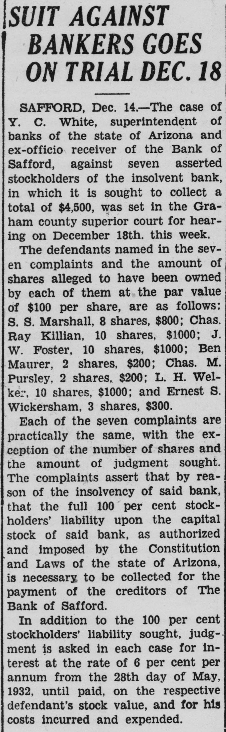 SUIT AGAINST BANKERS GOES ON TRIAL DEC. 18 SAFFORD, Dec. 14.-The case of Y. C. White, superintendent of banks of the state of Arizona and ex-officio receiver of the Bank of Safford, against seven asserted stockholders of the insolvent bank, in which it is sought to collect a total of $4,500, was set in the Graham county superior court for hearing on December 18th. this week. The defendants named in the seven complaints and the amount of shares alleged to have been owned by each of them at the par value of $100 per share, are as follows: S. S. Marshall, 8 shares, $800; Chas. Ray Killian, 10 shares, $1000; J. W. Foster, 10 shares, $1000; Ben Maurer, 2 shares, $200; Chas. M. Pursley, 2 shares, $200; L. H. Welker, 10 shares, $1000; and Ernest S. Wickersham, 3 shares, $300. Each of the seven complaints are practically the same, with the exception of the number of shares and the amount of judgment sought. The complaints assert that by reason of the insolvency of said bank, that the full 100 per cent stockholders' liability upon the capital stock of said bank, as authorized and imposed by the Constitution and Laws of the state of Arizona, is necessary to be collected for the payment of the creditors of The Bank of Safford. In addition to the 100 per cent stockholders' liability sought, judgment is asked in each case for interest at the rate of 6 per cent per annum from the 28th day of May, 1932, until paid, on the respective defendant's stock value, and for his costs incurred and expended.
