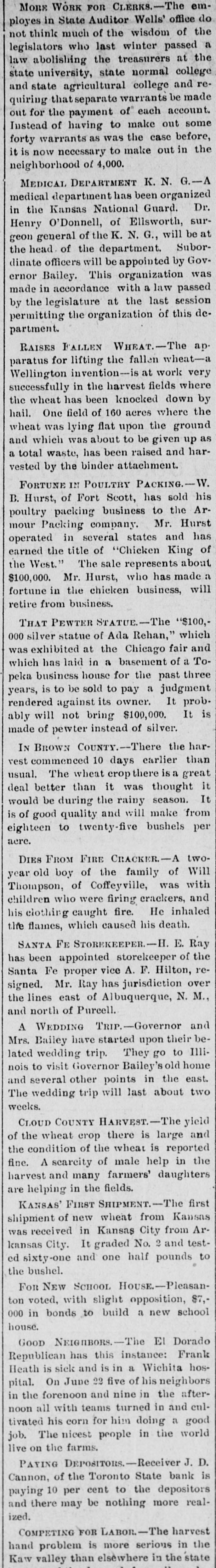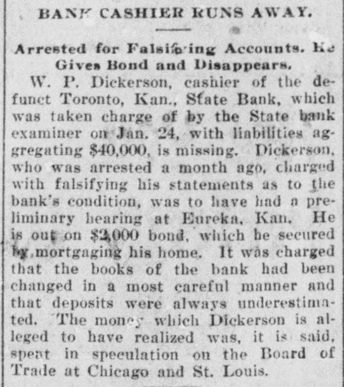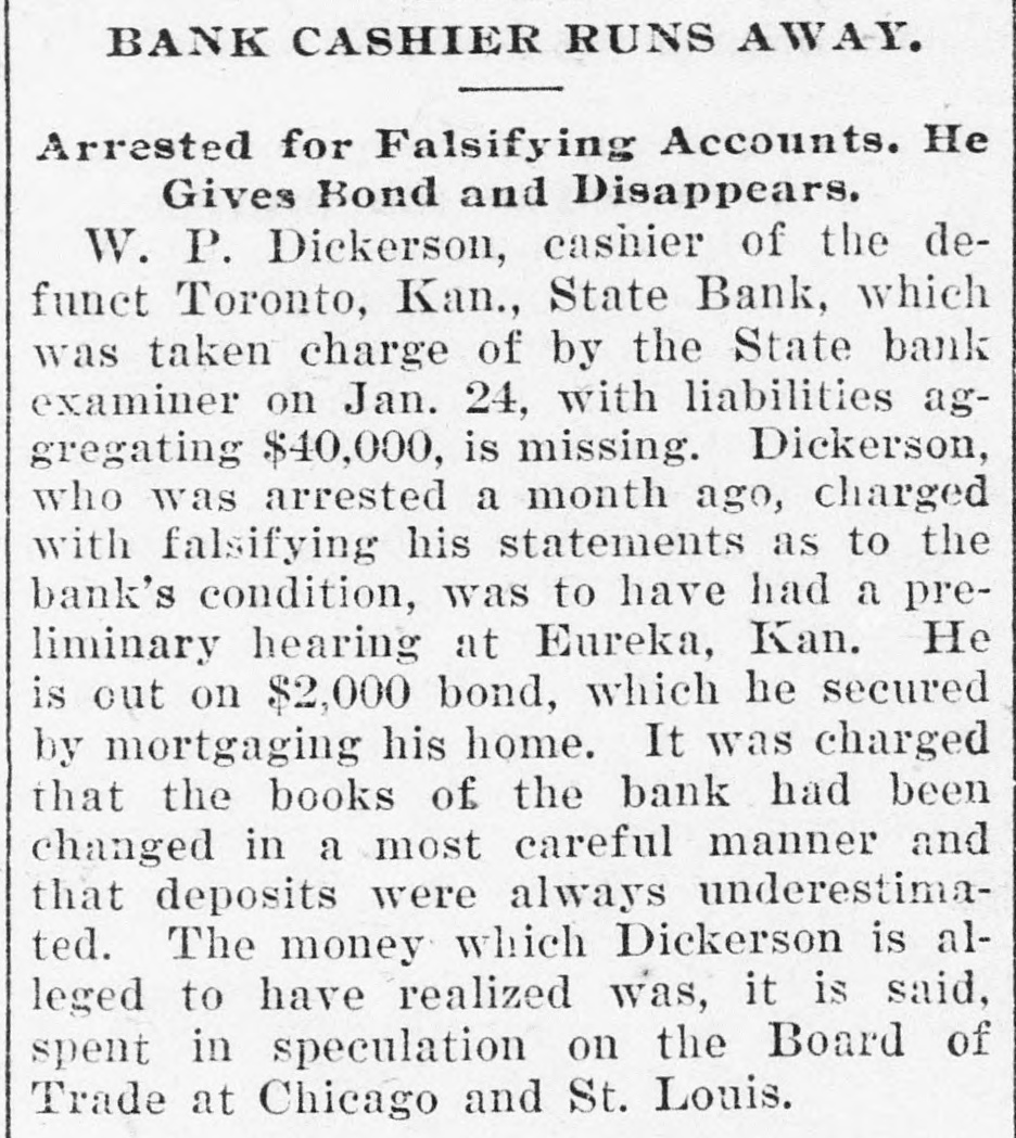 11 UTT UD Ten Per Cent Will Be Given Toronto Bank Depositors. Eureka, Kan., June 30.-Paying off the creditors of the defunct Toronto State bank was begun last Saturday morning. Receiver J. D. Cannon is paying over 10 cents on the dollar and this will probably be the extent of the deposits realized. Willis P. Dickerson, who ruined the institution and then left the country, is now located in Mexico with his family. He left southern Kansas shortly after his arrest for embezzlement and until a few weeks ago had not been heard from. A few weeks after her husband left Toronto, Mrs. Dickerson and the three children, who were visiting relatives in Fort Scott. disappeared and presumably went to Mexico, where they joined the husband and father. The Torento State bank, of which Willis P. Dickerson was cashier and president, failed January 24. State Bank Commissioner Clark had spent several days in Toronto examining the books of the bank. He was thoroughly convinced that crooked work had been used in the transaction of business and he promptly ordered all business to cease. Three weeks after the blinds were drawn, Dickerson was arrested on two indictments. A justice of the peace at Toronto, before whom he was taken, fixed his bond at $5,000. Dickerson asked permission to go to Yates Center to consult his attorneys. The request was granted and in custody of a constable he was taken to the county seat town. Here Dickerson was again taken before a justice and the bond cut down to $2.000. Dickerson managed to give this bond and a few days. later left the country. When it was rumored he had fled. a number of the creditors of the defunct bank met and twenty more indictments were filed. but the officers were unable to locate their man. A reward was offered, but it has yet to be claimed and it is probable that Dickerson will never be brought back to Kansas. January 1, this year, there was perhaps not a man in Toronto who was considered more of a leading citizen ara ideal business man than Dickerson. When the bank closed its doors the depositors were slow to realize that the man whom they had known and trusted ) since a boy had committed a wrong. They could not believe that the earnings of years had been stolen from under their very eyes, and not until the books had been placed before the public. did they comprehend the real situation. When Dickerson was arrested February 14, few people believed him guilty. He had for years been a leader in the community. His bank had deposits upwards of $50,000. Of this amount $9,400 were county deposits, secured by strong bondsmen. As Dickerson was school district and city treasurer, he derived considerable deposits from these sources; but neither county, school district nor E the little municipality lost their money I when the institution closed. The losers were the business men of the little town of 600 and the farmers along the Verdigris and Walnut rivers, who trusted Dickerson with their entire savings. Dickerson was a hard religious worker and the deacons of the Methodist church relied much on what he said. He possessed marked musical talent and led the church choir. besides instructing the home band and booming local business ventures. He was the foremost promoter of the Toronto Gas and Oil company and during his leisure hours had dabbled in politics to the extent that he was twice clerk of the district court in Woodson county. Dickerson's banking concern, an individual institution, was 12 years old when it failed. It had for years been the only bank in the town, and did a "land office business. The extent of the business, however. was not known to the general public until after it closed. The banker had played with the animals in the grain pits of St. Louis and Chicago, and when the bottom fell out of the big corn market, two years ago. Dickerson was little better than a "busted community." He had for several years invested in grain futures and watched the market quotations in an apparently listless manner. But when corn commenced to excite the entire country. Dickerson was among those to make a wild seramble for the grain. He joined forces with the bulls. and through his commission merchant placed all that he owned on the board of trade. and also bought corn with a part of the money in the bank. A few weeks later the bears overcame the market and the banker was left with little but debts to show for his plunging,
