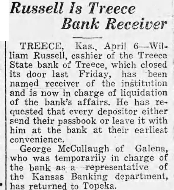 Russell Is Treece Bank Receiver TREECE, Kas., April liam Russell, cashier of the Treece State bank of Treece, which closed its door last Friday, been named receiver of the institution and now charge of liquidation the bank's affairs. He has requested that every depositor either send their passbook leave with him at the bank at their earliest convenience. George McCullaugh of Galena, was temporarily in charge the bank as of the Kansas department, returned to Topeka.