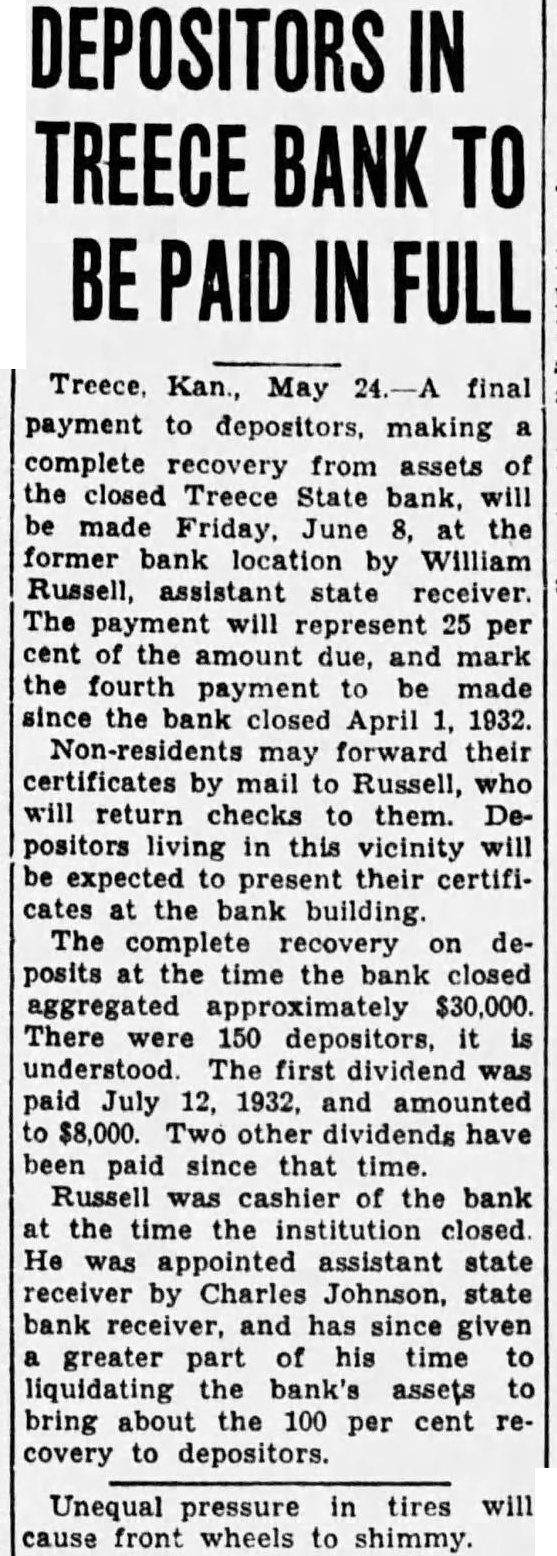 DEPOSITORS IN TREECE BANK TO BE PAID IN FULL Treece. Kan., May 24.-A final payment to depositors, making complete recovery from assets of the closed Treece State bank, will be made Friday, June 8, at the former bank location by William Russell, assistant state receiver. The payment will represent 25 per cent of the amount due, and mark the fourth payment to be made since the bank closed April 1, 1932. Non-residents may forward their certificates by mail to Russell, who will return checks to them. Depositors living in this vicinity will be expected to present their certificates at the bank building. The complete recovery on deposits at the time the bank closed aggregated approximately $30,000. There were 150 depositors, it is understood. The first dividend was paid July 12, 1932, and amounted to $8,000. Two other dividends have been paid since that time. Russell was cashier of the bank at the time the institution closed He was appointed assistant state receiver by Charles Johnson, state bank receiver, and has since given a greater part of his time to liquidating the bank's assets to bring about the 100 per cent recovery to depositors. Unequal pressure in tires will cause front wheels to shimmy.