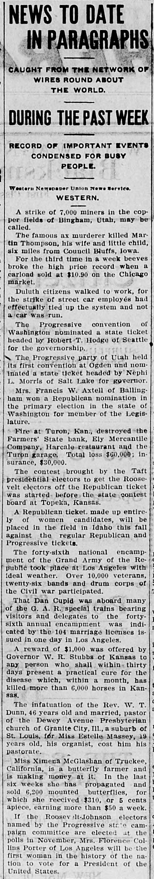 NEWS TO DATE IN PARAGRAPHS CAUGHT FROM THE NETWORK OF WIRES ROUND ABOUT THE WORLD. DURING THE PAST WEEK RECORD OF IMPORTANT EVENTS CONDENSED FOR BUSY PEOPLE. Western Newspaper Union News Service. WESTERN. A strike of 7,000 miners in the copper fields of Bingham, Utah, may be called. The famous ax murderer killed Martin Thompson, his wife and little child, six miles from Council Bluffs, Iowa. time in a For the the third high week when beeves broke price record a carload sold at $10.90 on the Chicago market. Duluth citizens walked to work, for the strike of street car employés had effectually tied up the system and not a car was run. The Progressive convention of Washington nominated a state ticket headed by Robert T. Hodge of Seattle for the governorship. Progressive party of Utah held convention at its The first Ogden and Nephi nominated a state ticket headed by L. Morris of Salt Lake for governor. Mrs. Francis W. Axtell of Ballinga in the election in of ham primary won Republican nomination the state Washington for member of the Legislature. Fire at Turon, Kan., destroyed the Farmers' State bank, Ely Mercantile Company, cale-restaurant and the Turon garage. Total loss $60,000; insurance, $30,000. The contest brought by the Taft presidential electors to get the Rooseoff the before the was velt electors started- Republican state contest ticket board at Topeka, Kansas. A Republican ticket. made up entirewomen candidates, will be in the field in placed ly of Idaho this and fall against the regular Republican Progressive tickets. The forty-sixth national encamp ment of the Grand Army of the Republic took place at Los Angeles with ideal weather. Over 10,000 veterans, twenty-six bands and drum corps of the Civil war participated. That Dan Cupid was aboard many of A. R. special and to visitors the G. delegates trains the bearing forty- indisixth annual encampment was cated by the 104 marriage licenses issued in one day in Los Angeles. A reward of $1,000 was offered by Governor W. R. Stubbs of Kansas to who shall a cure any days person present practical within for thirty the disease which, within a month, has killed more than 6,000 horses in Kansas. The infatuation of the Rev. W. T. Dunn, 46 years old and married, pastor of the Dewey Avenue Presbyterian church of Granite City, Ill., a suburb of St. Louis, for Miss Estelle Massey, 19 years old, his organist, cost him his pastorate. Miss Ximena McGlashan of Truckee, is a butterfly farmer and at California, is making money it. In the last and six weeks she has propagated sold 6,200 mounted butterflies, for which she received $310, or 5 cents apiece, earning more than $50 a week. If the Roosev elt-Johnson electors named by the Progressive state campaign committee are elected at the in Mrs. of Los polls lins Porter November, Angeles Florence will be Col- the first woman in the history of the nation to vote for a President of the United States.