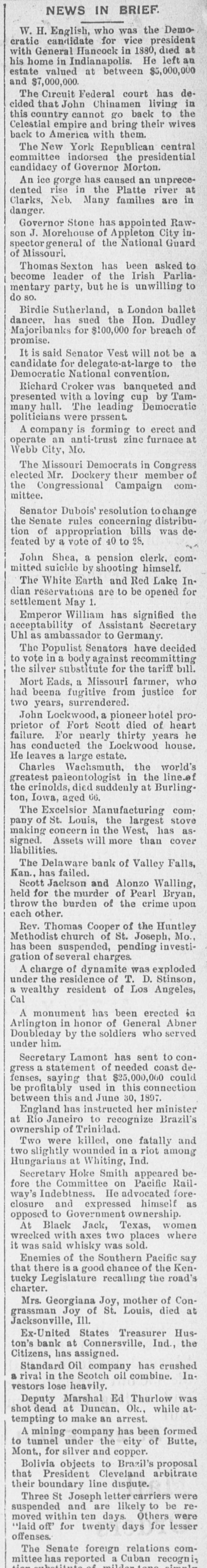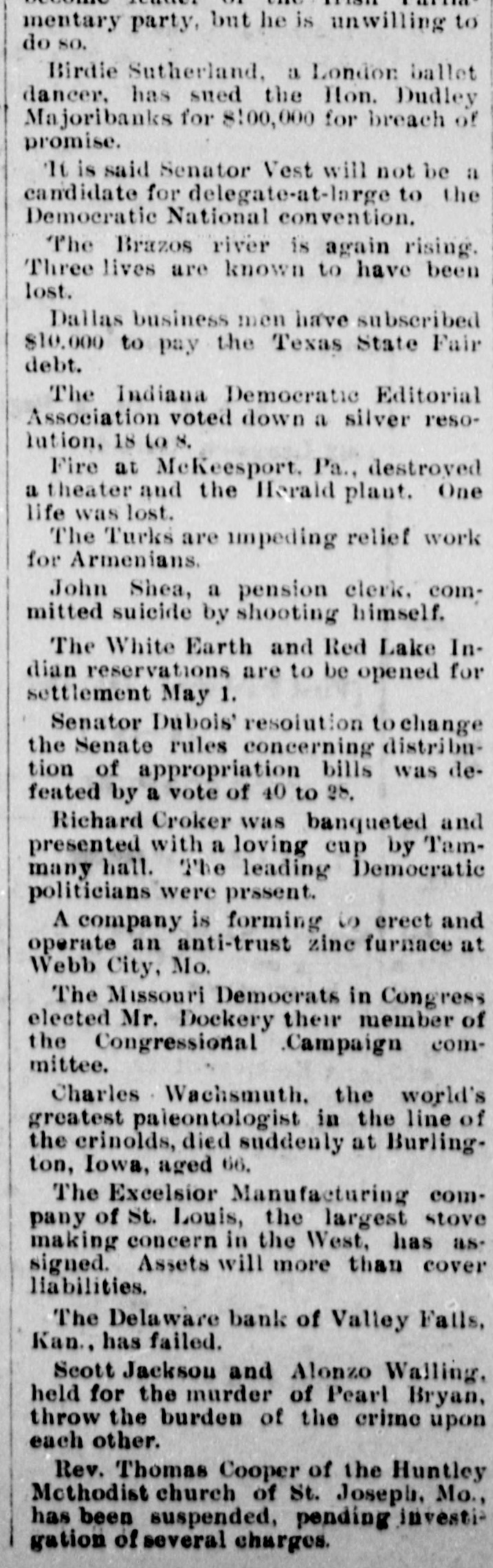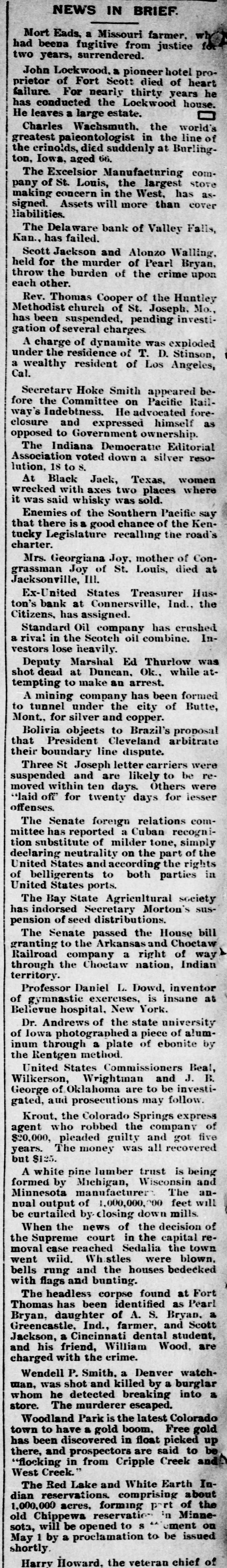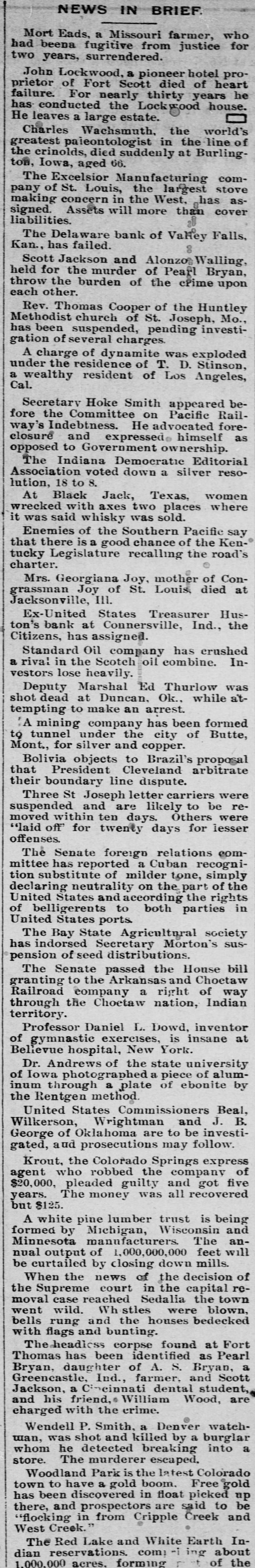NEWS IN BRIEF. Mort Eads, a Missouri farmer. had beena fugitive from justice for two years, surrendered. John Lockwood, a pioneer hotel proprietor of Fort Scott died of heart failure. For nearly thirty years he has conducted the Lockwood house. He leaves a large estate. Charles Wachsmuth. the world's greatest paieontologist in the line of the crinolds, died suddenly at Burlington, Iowa, aged 66. The Excelsior Manufacturing company of St. Louis, the largest stove making concern in the West, has assigned. Assets will more than cover liabilities. The Delaware bank of Valley Falls, Kan., has failed. Scott Jackson and Alonzo Walling, held for the murder of Pearl Bryan, throw the burden of the crime upon each other. Rev. Thomas Cooper of the Huntley Methodist church of St. Joseph, Mo., has been suspended, pending investigation of several charges. A charge of dynamite was exploded under the residence of T. D. Stinson, a Cal. wealthy resident of Los Angeles, Secretary Hoke Smith appeared before the Committee on Pacific Railway's Indebtness. He advocated foreelosure and expressed himself as opposed to Government ownership. The Indiana Democratic Editorial Association voted down a silver resoS of SI [niton At Black Jack, Texas, women wrecked with axes two places where it was said whisky was sold. Enemies of the Southern Pacific say that there is a good chance of the Kentucky Legislature recalling the road's charter. Mrs. Georgiana Joy, mother of Congrassman Joy of St. Louis, died at 'III Ex-United States Treasurer Huston's bank at Connersville, Ind., the Citizens, has assigned. Standard Oil company has crushed a rival in the Scotch oil combine. Investors lose heavily. Deputy Marshal Ed Thurlow was shot dead at Duncan, Ok., while attempting to make an arrest. A mining company has been formed to tunnel under the city of Butte, Mont., for silver and copper. Bolivia objects to Brazil's proposal that President Cleveland arbitrate their boundary line dispute. Three St Joseph letter carriers were suspended and are likely to be removed within ten days. Others were "laid off" for twenty days for lesser offenses. The Senate foreign relations committee has reported a Cuban recognition substitute of milder tone, simply declaring neutrality on the part of the United States and according the rights of belligerents to both parties in United States ports. The Bay State Agricultural society has indorsed Secretary Morton's suspension of seed distributions. The Senate passed the House bill granting to the Arkansas and Choctaw Railroad company a right of way through the Choctaw nation, Indian territory. Professor Daniel L. Dowd, inventor of gymnastic exercises, is insane at Bellevue hospital, New York. Dr. Andrews of the state university of Iowa photographed a piece of aluminum through a plate of ebonite by the Rentgen method. United States Commissioners Beal, Wilkerson, Wrightman and J. B. George of Oklahoma are to be investigated, aud prosecutions may follow. Krout. the Colorado Springs express agent who robbed the company of $20,000, pleaded guilty and got five years. The money was all recovered but $125. A white pine lumber trust is being formed by Michigan, Wisconsin and Minnesota manufacturer The annual output of 1,000,000,000 feet will be curtailed by. closing down mills. When the news of the decision of the Supreme court in the capital removal case reached Sedalia the town went wild. Whistles were blown. bells rung and the houses bedecked puu spey 47!M The headless corpse found at Fort Thomas has been identified as Pearl E S 'V JO Bryan Greencastle, Ind., farmer, and Scott Jackson, a Cincinnati dental student, and his friend, William Wood, are charged with the crime. Wendell P. Smith, a Denver watchman, was shot and killed by a burglar whom he detected breaking into a store. The murderer escaped. Woodland Park is the latest Colorado town to have a gold boom, Free gold has been discovered in float picked up there, and prospectors are said to be "flocking in from Cripple Creek and West Creek.' The Red Lake and White Earth Indian reservations. comprising about 1,000,000 acres, forming part of the old Chippewa reservation in Minnesota. will be opened to S ement on