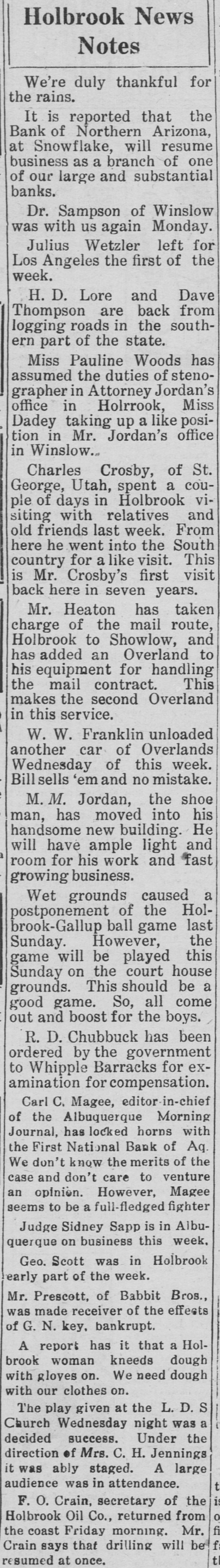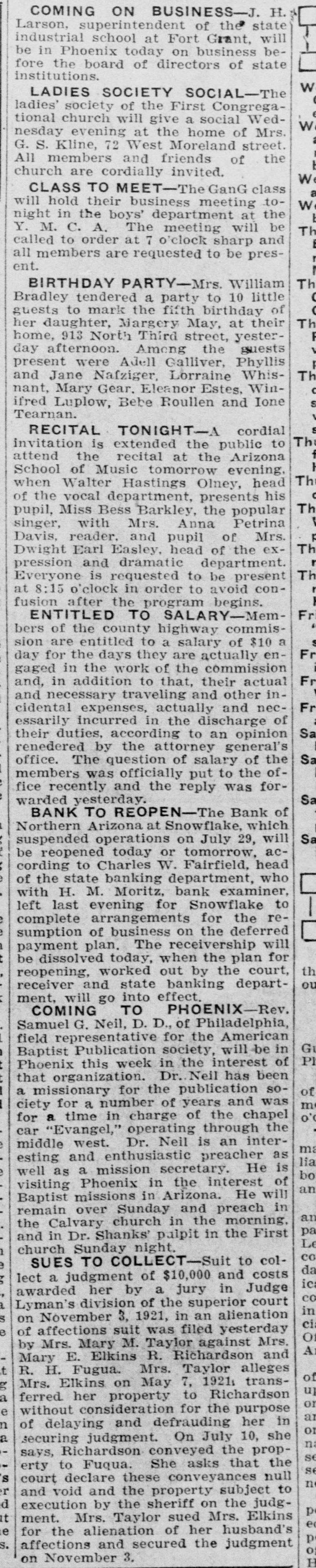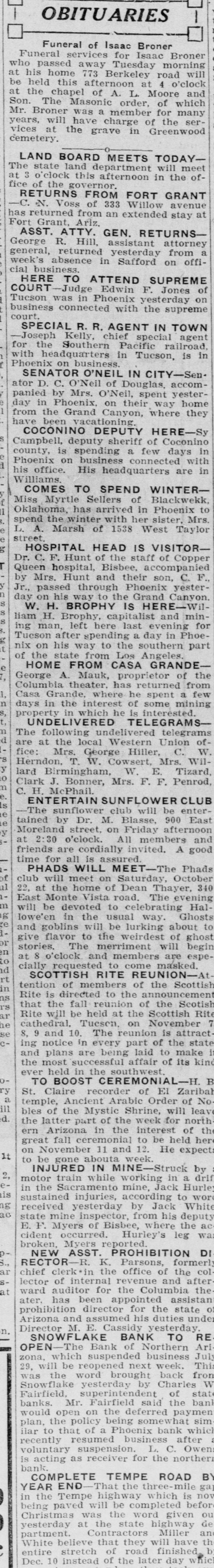 OBITUARIES Funeral of Isaac Broner Funeral services for Isaac Broner who passed away Tuesday morning will his home 773 Berkeley road at be held this afternoon at 4 o'clock and at the chapel of A. L. Moore Son. The Masonic order, of which many Mr. Broner was a member for will have charge of the sercemetery. years, vices at the grave in Greenwood LAND BOARD MEETS TODAY- meet The state land department will ofat 3 o'clock this afternoon in the fice of the governor. RETURNS FROM FORT GRANT N. Voss of 333 Willow avenue has returned from an extended stay at Fort Grant, Ariz. ASST. ATTY. GEN. RETURNSR. Hill, assistant attorney a George returned yesterday from general, week's absence in Safford on official business. HERE TO ATTEND SUPREME of COURT-Judge Edwin F. Jones Tucson was in Phoenix yesterday on business connected with the supreme court. SPECIAL R. R. AGENT IN TOWN Joseph Kelly, chief special agent the Southern Pacific railroad, is in with for headquarters in Tucson, Phoenix on business SENATOR O'NEIL IN CITY-SenD. C. O'Neil of Douglas, accomator by Mrs. O'Neil, spent yester- home 1 panied in Phoenix, on their way they from day the Grand Canyon, where been vacationing. S have COCONINO DEPUTY HERE-Sy deputy sheriff of Coconino in e Campbell, is spending a few days with d Phoenix county, on business connected in his office. His headquarters are Williams. COMES TO SPEND WINTERf Myrtle Sellers of Blackwekk, to 11 Miss has arrived in Phoenix Mrs. 3. Oklahoma, the winter with her sister. e e L. spend A. Marsh of 1538 West Taylor g street. HOSPITAL HEAD IS VISITORHunt of the staff of Copper Dr. C. F. hospital, Bisbee, accompanied Queen Mrs. Hunt and their son, y by through Phoenix yesterJr., passed way to the Grand Canyon. day W. on H. his BROPHY IS HERE-Wil- minH. Brophy, capitalist and for liam left here last evening ing man, after spending a day in Phoe- part Tucson nix on his way to the southern Angeles. of the state from Los e HOME FROM CASA GRANDE- of the 7, George A. Mauk, proprietor from theater. has returned few 1, n Columbia Grande, where he spent mining a S, Casa days in the which interest he of is interested. some t property UNDELIVERED in TELEGRAMSd undelivered telegrams ofThe following the local Western Union W. s are at Mrs. George Hiller, C. y fice: Herndon, T. W. Cowsert, Mrs. Tizard, Wilo Birmingham, W. E. Penrod, m Clark lard J. Bonner, Mrs. F. F. Is C. ENTERTAIN H. McPhail. SUNFLOWER CLUB e sunflower club will be enter- East e The by Dr. M. Blasse, 900 y o'clock. Moreland tained street, on All Friday members afternoon and at friends 2:30 are cordially invited. A good time for all is assured. WILL MEET-The Phads 1] PHADS meet on Saturday, October club will the home of Dean Thayer, 340 m 22, at Monte Vista road. The evening HalEast devoted to celebrating g will be in the usual way. Ghosts to lowe'en goblins will be lurking about ghost and flavor to the weirdest of n give The merriment will begin espeto stories. 8 o'clock and members masked. are d at requested to come rt cially SCOTTISH RITE REUNION-A Scottish in of members of the as Rite tention is directed to the announcement Scotish rs the fall reunion of the Rite ar he that will be held at the Scottish November 7 se Rite cathedral. Tueson, on attract 10. The reunion is state c8. 9 and in every part of the ing notice plans are being laid to of make its kind it and the most successful affair in the southwest. ry ever TO held BOOST CEREMONIAL-H. Zaribah B a Claire recorder of El of No. ill St. Ancient Arabic Order leav d. bles temple, of the Mystic Shrine, for will north part of the week the latter Arizona in the interest of here the ern fall ceremonial to be held expects it great November 11 and 12. He on abouta week. : 2, to INJURED be gone IN MINE-Struck by train while working in a Hurley drif is motor Sacramento mine, Jack wor 1g in the injuries, according to White ac sustained received yesterday by Jack deputy mine inspector, from his the ac state Myers of Bisbee, where was E F. occurred. Hurley's leg cident Myers reported. broken. ASST. PROHIBITION DI NEW K. Parsons, formerl an RECTOR-R. the office of the colSchief clerk in revenue and after at lector auditor of internal for the Columbia the ward has been appointed assistan state of ater, director for the er prohibition assumed his duties unde n. Arizona and M. E Cassidy yesterday. Director SNOWFLAKE BANK TO RE Bank of Northern Ari OPEN-The which suspended business This July zona, will be reopened next week. from 29. word brought back W was the yesterday by Charles state Snowflake superintendent of bank Fairfield, Fairfield said the banks. Mr. on the deferred payment would the open policy being somewhat which sim plan, that of a Phoenix bank a ilar to resumed business after recently suspension. L. C. northern Owen voluntary is acting as receiver for the bank. COMPLETE TEMPE ROAD gaj BY YEAR END That highway the three-n which is nov in the paved Tempe will be completed given befor ou being was the word de Christmas at the state highway an yesterday Contractors Miller have th partment. believe that they will b White road finished 10 Dec. entire stretch instead of of the later day which