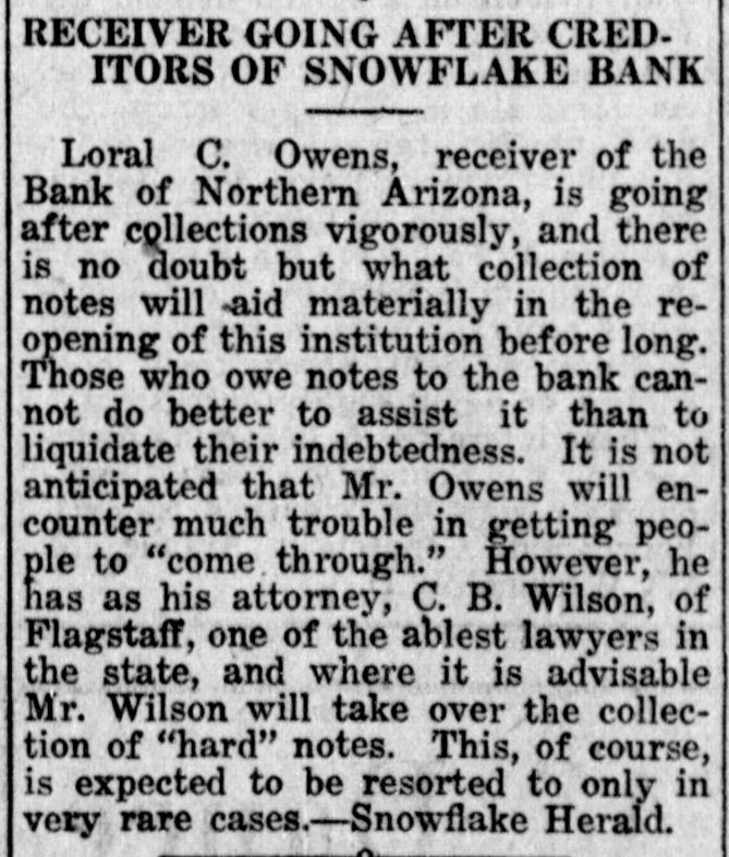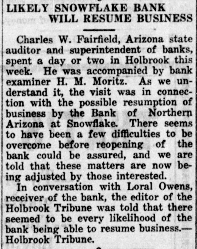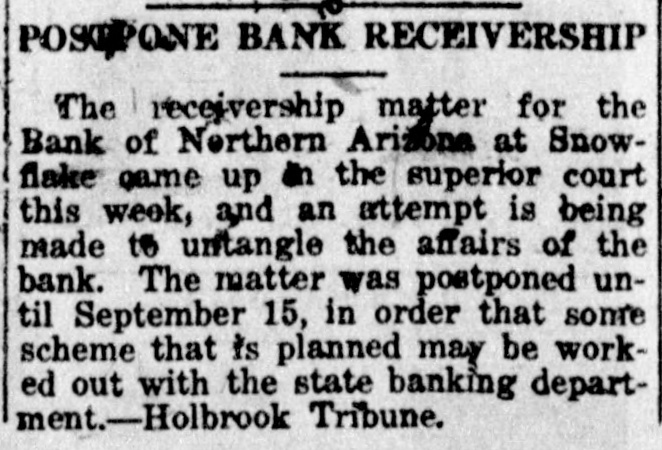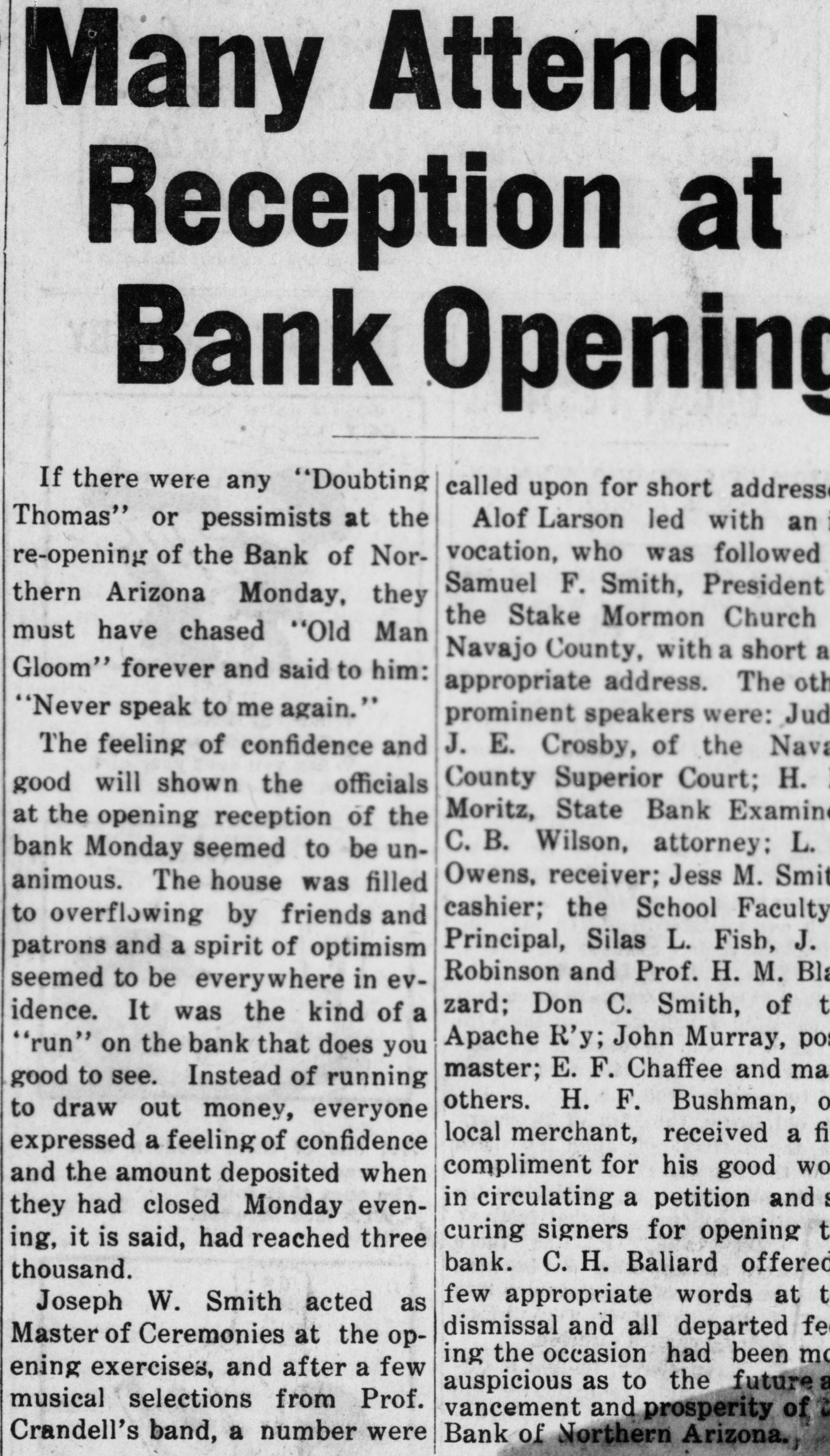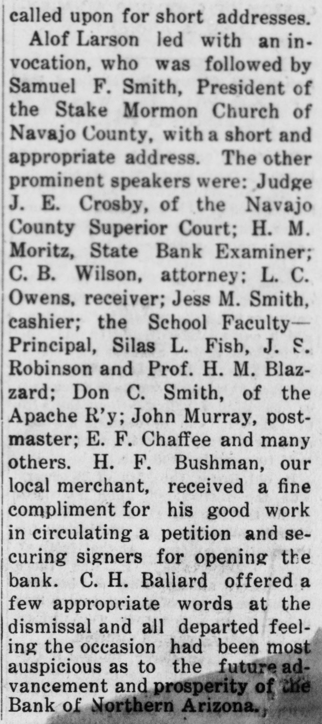 OBITUARIES Funeral of Isaac Broner Funeral services for Isaac Broner who passed away Tuesday morning will his home 773 Berkeley road at be held this afternoon at 4 o'clock and at the chapel of A. L. Moore Son. The Masonic order, of which many Mr. Broner was a member for will have charge of the sercemetery. years, vices at the grave in Greenwood LAND BOARD MEETS TODAY- meet The state land department will ofat 3 o'clock this afternoon in the fice of the governor. RETURNS FROM FORT GRANT N. Voss of 333 Willow avenue has returned from an extended stay at Fort Grant, Ariz. ASST. ATTY. GEN. RETURNSR. Hill, assistant attorney a George returned yesterday from general, week's absence in Safford on official business. HERE TO ATTEND SUPREME of COURT-Judge Edwin F. Jones Tucson was in Phoenix yesterday on business connected with the supreme court. SPECIAL R. R. AGENT IN TOWN Joseph Kelly, chief special agent the Southern Pacific railroad, is in with for headquarters in Tucson, Phoenix on business SENATOR O'NEIL IN CITY-SenD. C. O'Neil of Douglas, accomator by Mrs. O'Neil, spent yester- home 1 panied in Phoenix, on their way they from day the Grand Canyon, where been vacationing. S have COCONINO DEPUTY HERE-Sy deputy sheriff of Coconino in e Campbell, is spending a few days with d Phoenix county, on business connected in his office. His headquarters are Williams. COMES TO SPEND WINTERf Myrtle Sellers of Blackwekk, to 11 Miss has arrived in Phoenix Mrs. 3. Oklahoma, the winter with her sister. e e L. spend A. Marsh of 1538 West Taylor g street. HOSPITAL HEAD IS VISITORHunt of the staff of Copper Dr. C. F. hospital, Bisbee, accompanied Queen Mrs. Hunt and their son, y by through Phoenix yesterJr., passed way to the Grand Canyon. day W. on H. his BROPHY IS HERE-Wil- minH. Brophy, capitalist and for liam left here last evening ing man, after spending a day in Phoe- part Tucson nix on his way to the southern Angeles. of the state from Los e HOME FROM CASA GRANDE- of the 7, George A. Mauk, proprietor from theater. has returned few 1, n Columbia Grande, where he spent mining a S, Casa days in the which interest he of is interested. some t property UNDELIVERED in TELEGRAMSd undelivered telegrams ofThe following the local Western Union W. s are at Mrs. George Hiller, C. y fice: Herndon, T. W. Cowsert, Mrs. Tizard, Wilo Birmingham, W. E. Penrod, m Clark lard J. Bonner, Mrs. F. F. Is C. ENTERTAIN H. McPhail. SUNFLOWER CLUB e sunflower club will be enter- East e The by Dr. M. Blasse, 900 y o'clock. Moreland tained street, on All Friday members afternoon and at friends 2:30 are cordially invited. A good time for all is assured. WILL MEET-The Phads 1] PHADS meet on Saturday, October club will the home of Dean Thayer, 340 m 22, at Monte Vista road. The evening HalEast devoted to celebrating g will be in the usual way. Ghosts to lowe'en goblins will be lurking about ghost and flavor to the weirdest of n give The merriment will begin espeto stories. 8 o'clock and members masked. are d at requested to come rt cially SCOTTISH RITE REUNION-A Scottish in of members of the as Rite tention is directed to the announcement Scotish rs the fall reunion of the Rite ar he that will be held at the Scottish November 7 se Rite cathedral. Tueson, on attract 10. The reunion is state c8. 9 and in every part of the ing notice plans are being laid to of make its kind it and the most successful affair in the southwest. ry ever TO held BOOST CEREMONIAL-H. Zaribah B a Claire recorder of El of No. ill St. Ancient Arabic Order leav d. bles temple, of the Mystic Shrine, for will north part of the week the latter Arizona in the interest of here the ern fall ceremonial to be held expects it great November 11 and 12. He on abouta week. : 2, to INJURED be gone IN MINE-Struck by train while working in a Hurley drif is motor Sacramento mine, Jack wor 1g in the injuries, according to White ac sustained received yesterday by Jack deputy mine inspector, from his the ac state Myers of Bisbee, where was E F. occurred. Hurley's leg cident Myers reported. broken. ASST. PROHIBITION DI NEW K. Parsons, formerl an RECTOR-R. the office of the colSchief clerk in revenue and after at lector auditor of internal for the Columbia the ward has been appointed assistan state of ater, director for the er prohibition assumed his duties unde n. Arizona and M. E Cassidy yesterday. Director SNOWFLAKE BANK TO RE Bank of Northern Ari OPEN-The which suspended business This July zona, will be reopened next week. from 29. word brought back W was the yesterday by Charles state Snowflake superintendent of bank Fairfield, Fairfield said the banks. Mr. on the deferred payment would the open policy being somewhat which sim plan, that of a Phoenix bank a ilar to resumed business after recently suspension. L. C. northern Owen voluntary is acting as receiver for the bank. COMPLETE TEMPE ROAD gaj BY YEAR END That highway the three-n which is nov in the paved Tempe will be completed given befor ou being was the word de Christmas at the state highway an yesterday Contractors Miller have th partment. believe that they will b White road finished 10 Dec. entire stretch instead of of the later day which