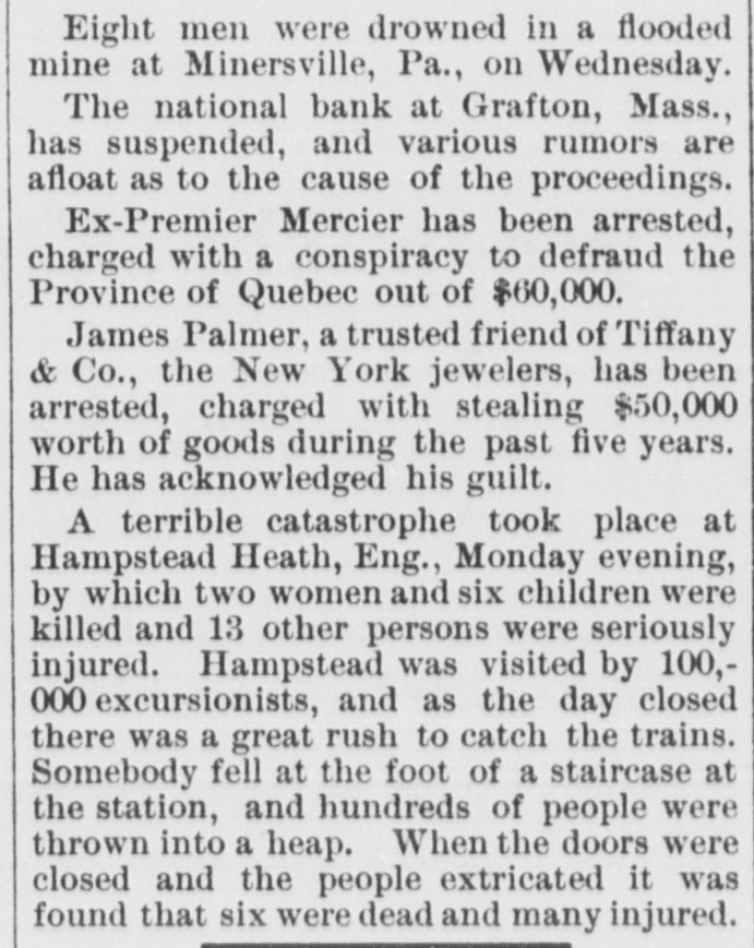Eight men were drowned in a flooded mine at Minersville, Pa., on Wednesday. The national bank at Grafton, Mass., has suspended, and various rumors are afloat as to the cause of the proceedings. Ex-Premier Mercier has been arrested, charged with a conspiracy to defraud the Province of Quebec out of $60,000. James Palmer, a trusted friend of Tiffany & Co., the New York jewelers, has been arrested, charged with stealing $50,000 worth of goods during the past five years. He has acknowledged his guilt. A terrible catastrophe took place at Hampstead Heath, Eng., Monday evening, by which two women and six children were killed and 13 other persons were seriously injured. Hampstead was visited by 100,000 excursionists, and as the day closed there was a great rush to catch the trains. Somebody fell at the foot of a staircase at the station, and hundreds of people were thrown into a heap. When the doors were closed and the people extricated it was found that six were dead and many injured.