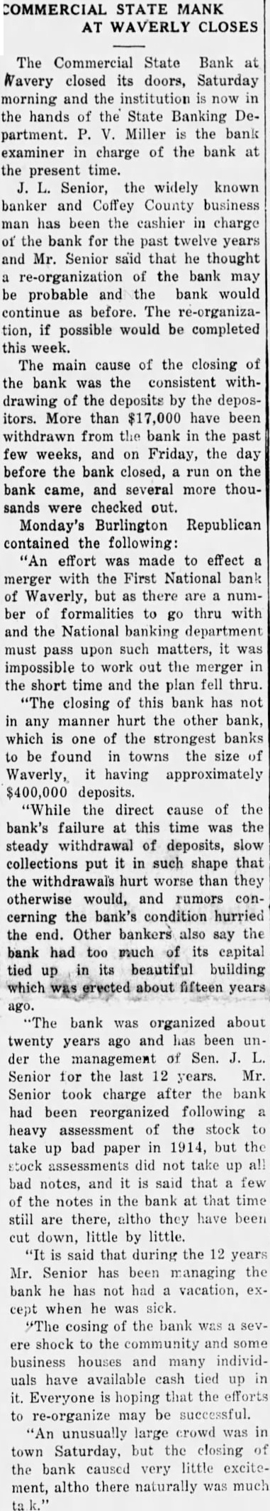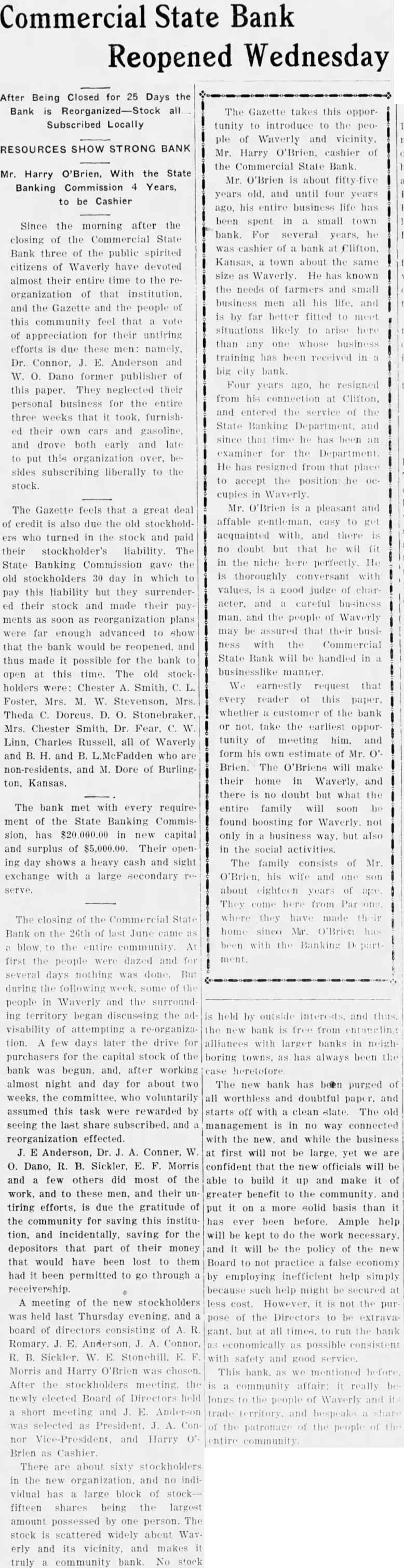 The Gazette takes this opportunity to introduce to the people of Waverly and vicinity. Mr. Harry O'Brien, cashier of the Commercial State Bank Mr. O'Brien is about fifty five years old. and until four years ago, his entire business life has been spent small town bank. For several years, he was cashier of a bank at Clifton. Kansas, town about the same size as Waverly. He has known the needs of farmers and small business men all his life, and is by far better fitted to meet situations likely to arise here than any whose business training has been received in big city bank Four years ago, he resigned from his connection at Clifton, and entered the service of the State Banking Department, and since that time he has been an examiner for the Department He has resigned from that place to accept the position the occupies in Waverly. Mr. O'Brien is pleasant and affable gentleman. easy to get acquainted with, and there is no doubt but that he will fit in the niche here perfectly. He is thoroughly conversant with values, is a good judge of character. and careful business man. and the people of Waverly may be assured that their business with the Commercial State Bank will be handled in businesslike manner. We earnestly request that every reader of this paper, whether a customer of the bank or not. take the earliest opportunity of meeting him. and form his own estimate of Mr. O'Brien. The O'Briens will make their home in Waverly, and there is no doubt but what the entire family will soon be found boosting for Waverly. not only in business way, but also in the social activities. The family consists of Mr. O'Brien, his wife and one son about eighteen years of age. They come here from where they have made home since Mir O'Brich has been with the Banking D part ment. is held by outside interests. and the new bank is free from entangling alliances with larger banks in neighboring towns, as has always been the case heretofore The new bank has been purged of all worthless and doubtful paper and starts off with clean slate. The old management is in no way connected with the new. and while the business at first will not be large, yet we are confident that the new officials will be able to build it up and make it of greater benefit to the community. and put it on more solid basis than it has ever been before. Ample help will be kept to do the work necessary, and it will be the policy of the new Board to not practice false economy by employing inefficient help simply because such help might be secured at less cost. However, it is not the pur pose of the Directors to be extravagant. but at all times. to run the bank economically as possible consistent with safety and good service. This bank. as we mentioned before. community affair: it really longs to the people of Waverly and trade territory. and bespeaks the patronage of the people community