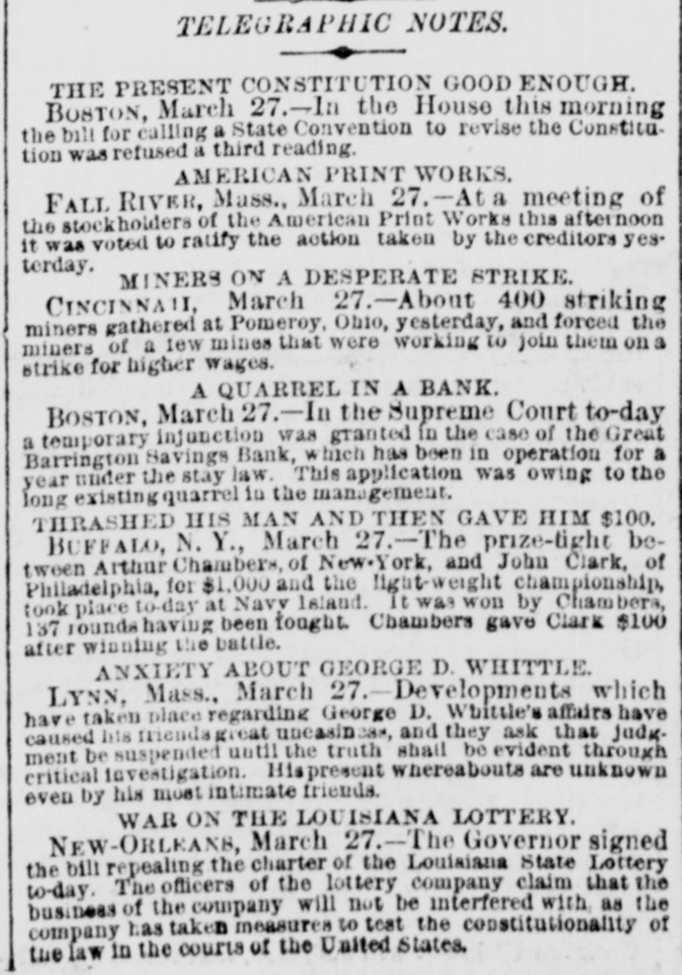 TELEGRAPHIC NOTES. THE PRESENT CONSTITUTION GOOD ENOUGH. BOSTON, March 27.- the House this morning the bill for calling a State Convention to revise the Constitution was refused a third reading. AMERICAN PRINT WORKS. FALL RIVER, Mass., March 27.-At meeting of the stockholders of the American Print Works this afternoon it was voted to ratify the action taken by the creditors yesterday. MINERS ON A DESPERATE STRIKE. CINCINNAII, March 27.-About 400 striking miners gathered at Pomeroy, Ohio, yesterday, and forced the miners of a few mines that were working to join them on a strike for higher wages. A QUARREL IN A BANK. BOSTON, March 27.-In the Supreme Court to-day a temporary injunction was granted in the case of the Great Barrington Savings Bank, which has been in operation for a year under the stay law. This application was owing to the long existing quarrel in the management. THRASHED HIS MAN AND THEN GAVE HIM $100. BUFFALO, N. Y., March 27.-The prize-tight between Arthur Chambers, of New.York, and John Clark, of Philadelphia, for $1,000 and the light-weight championship, took place to-day at Navy Island. It was won by Chambers, 137 rounds having been tought. Chambers gave Clark $100 after winning the battle. ANXIETY ABOUT GEORGE D. WHITTLE. LYNN, Mass., March Developments which have taken place regarding George D. Whittle's affairs have caused his friends great uncasin 388, and they ask that judg. meat be suspended until the truth shall be evident through critical investigation. Hisprement whereabouts are unknown even by his most intimate friends. WAR ON THE LOUISIANA LOTTERY. NEW-ORLEANS, March 27.--The Governor signed the bill repealing the charter of the Louisiana State Lottery to-day. The officers of the lottery company claim that the business of the company will not be interfered with as the company has taken measures to test the constitutionality of the law in the courts of the United States.