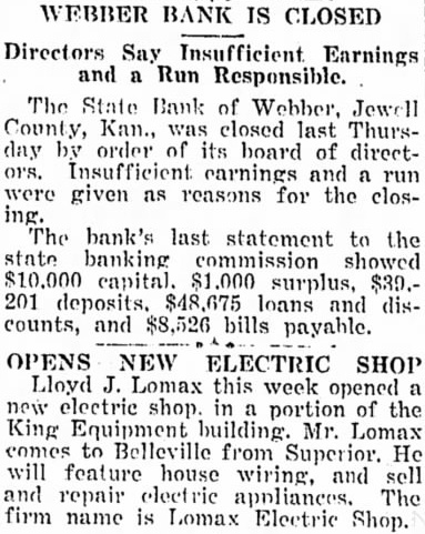 WEBBER BANK IS CLOSED Directors Say Insufficient Earnings and Run Responsible. The State Bank of Webber, County, Kan., was closed last Thursday order board of directearnings and given ns reasons for the bank's last statement to the banking commission showed capital. surplus, 201 deposits. $48,675 loans and counts, and bills payable. OPENS NEW Lloyd Lomax this week opened electric shop. portion of the King Equipment Mr. Lomax to from will feature house wiring, and repair The Electric Shop.