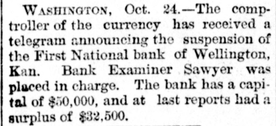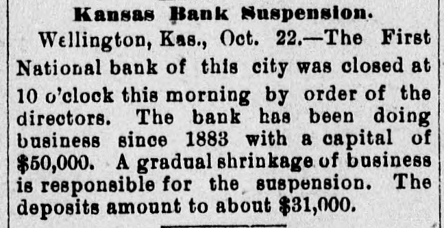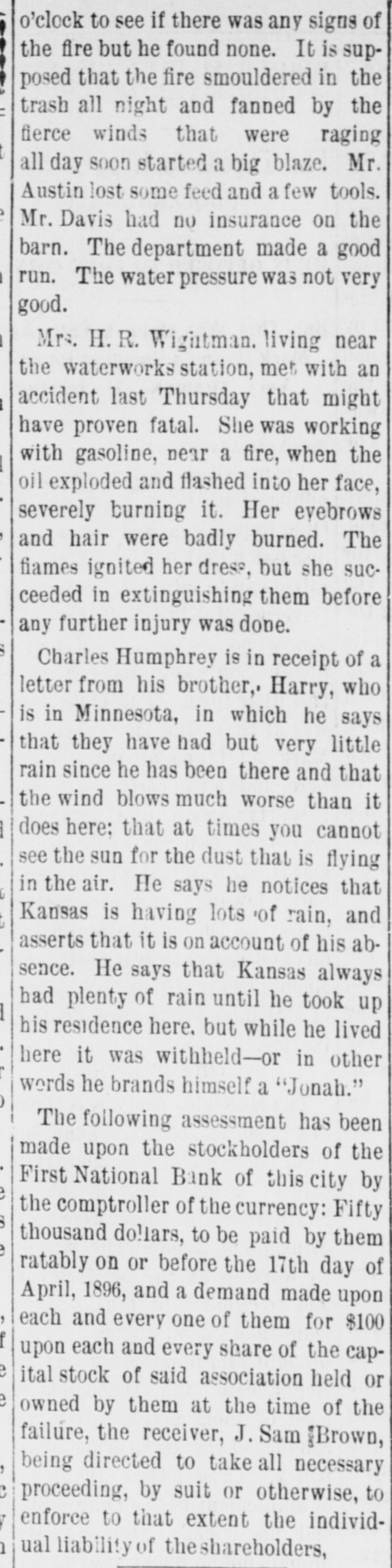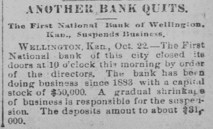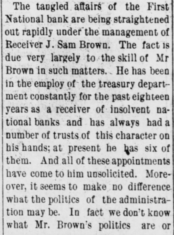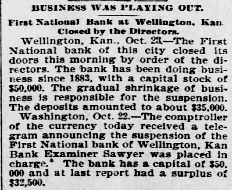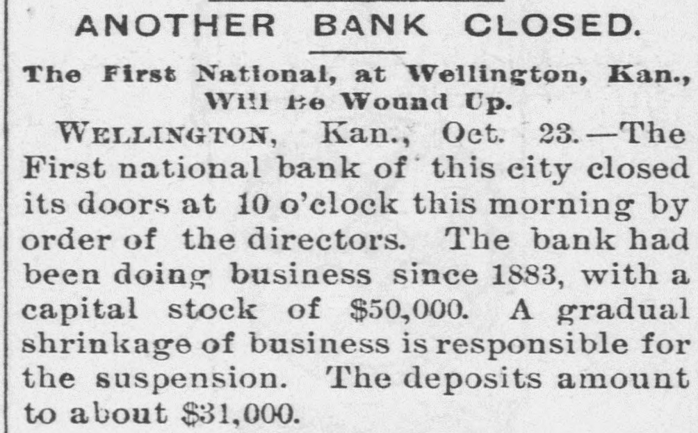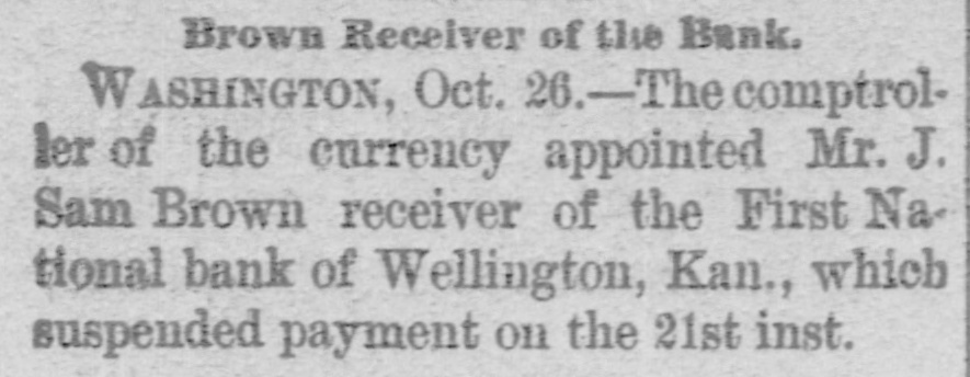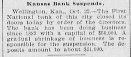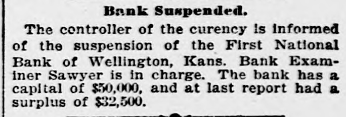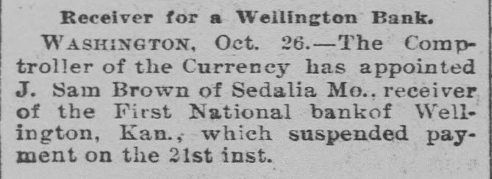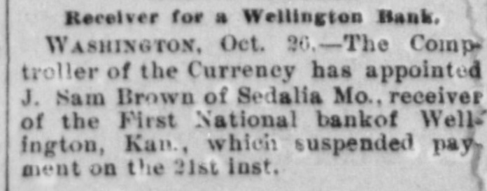 Thursday on account of insufficient papers. They agreed, however, to turn over the property to the Arkansas City bank as ordered. Geo A. Puckett, who was for more than a year manager, assistant editor and foreman of the VOICE, writes us that he is sick of Arkansas, and would like to have a job on some good Kansas paper. George is a good all-round man, and we can cheerfully recommend him. tf J. Sam Brown, receiver of the Sumner National and First National banks of Wellington, and a half dozen others, strange as it may seem, is a Republican. He draws a salary from all of them. A good gold standard Republican and a good gold standard Democrat can get mighty close together these days. The Populist and Free Silver parties at the Wellington township primary, nominated for their township candidates, the following persons for the respective offices: Trustee, Geo. W. Bailey; clerk, A. J. Banks; treasurer, J. F. Ruggles: justices, T. B. Nicholson, J. M. Ready; constables, John Treft, S. F. Utz. The jury in the case between the Stock Exchange bank VS. the Frisco railway, involving the title to the right of way and track of one mile of said road at Blackstone, came in at noon Thursday with a verdict favoring the bank in the sum of $4,851.17. The company would certainly have been wise to have paid off the balance on that mortgage, rather than to have been compelled to buy back this part of their railroad Some of our Republican friends are finding fault with O. P. Hubbard of Chikaskia township, for calling Chester I. Long a "yaller dog." We hope Populists will refrain from using such phrases. The feelings of Republicans are somewhat tender just now and there is no use lacerating tbem un. necessarily. Then, too, Herr Most has joined their party and they have suddenly quit calling us anarchists and repudiators, hence there is no cause for retaliation. Stop it, boys! stop it! A pleasant surprise was given Mrs. R. F. Plummer last Wednesday at her residence four miles northwest of the this city. The occasion was the aniversary of her birth. After a bountiful supply of the inner man the company were highly entertained with music. Mrs. John Dawson presided at the organ and Mr. Upson with the violin; recitations by Misses Lena Fuller and Cora Plummer. Those present were Mr. and Mrs. Andy Banks and father, Mr. and Mrs. John Camp, Mr. and Mrs. Robert Camp, Mr. and Mrs. E. B. Dawson, Mr. and Mrs. John Dawson, Mr. and Mrs. Wm. Dugan, Mr. nd Mrs. J. K. Moore, Mr. and Mrs. Upson, Miss Fuller. Mr. and Mrs. Van Deln, Mr. and Mrs. Dr. Reid, and children galore. At a late hour the guests departed for home after having spent a pleasant evening. In June last, Wm. J. Swartz and wife of Sioux City, Iowa, were here on a visit to Wm. Wise, who is a brother of Mrs. Swartz. Mr. Swartz met a good many people here and will be remembered as an enthusiastic McKinley man at that time. He was an old soldier, serving throughout the war. The St. Louis gold standard platform knocked him out. Mr. Wise received a letter from him a day or two ago which concludes as follows: "I am pleased to know that you are with us on the silver question. 1 will speak here for the candidates nominted at Chicago, and it is possible that I may stump this congressional district. Leave the money issue out of the question, patriotism alone should impel a good citizen to vote for Bryan and Sewell. McKinley and his followers should pull down the stars and stripes and hoist the red cross of St. George. Practically, they stand cap in hand asking John Bull to please determine what shall be the financial policy of the United States,