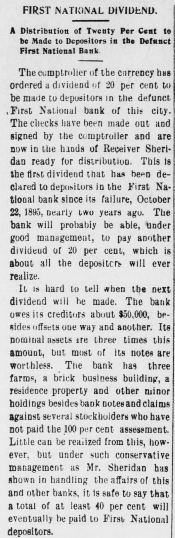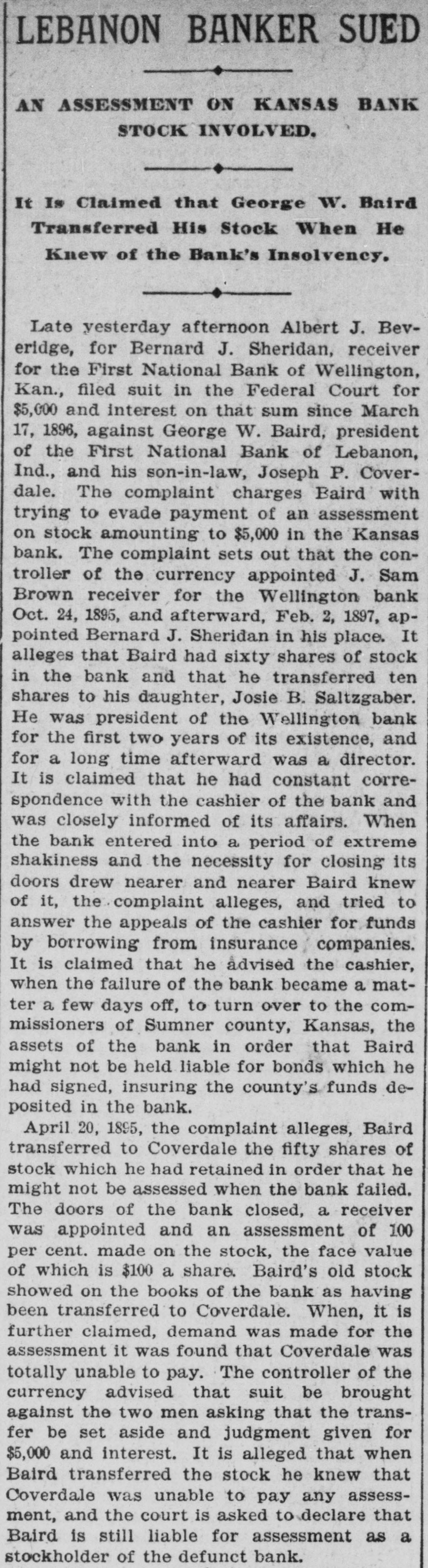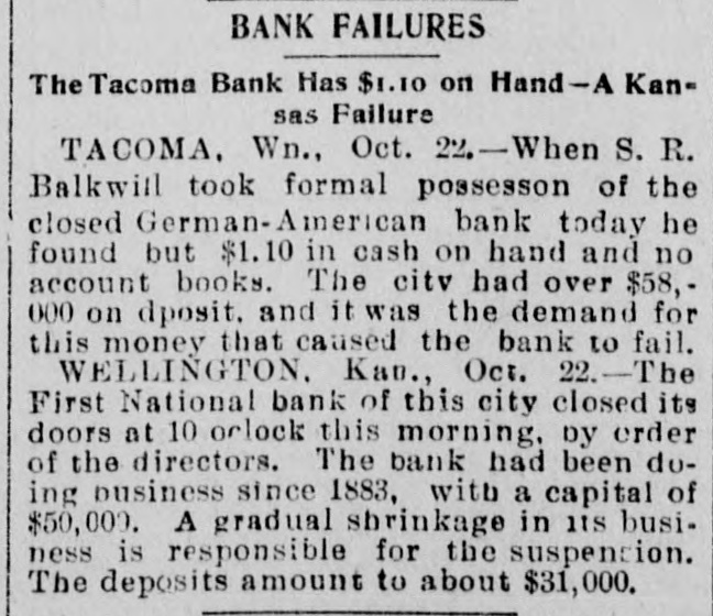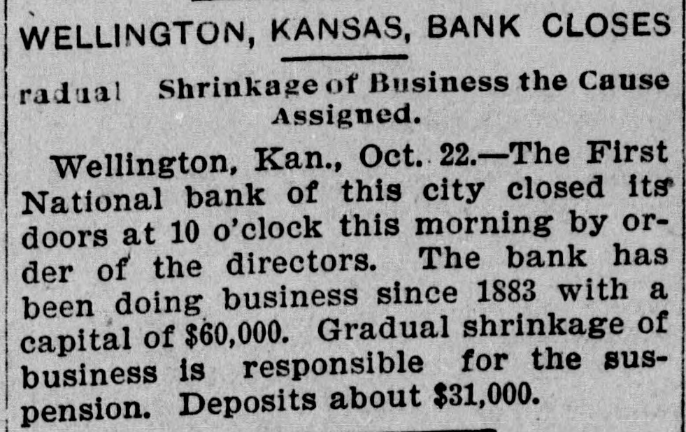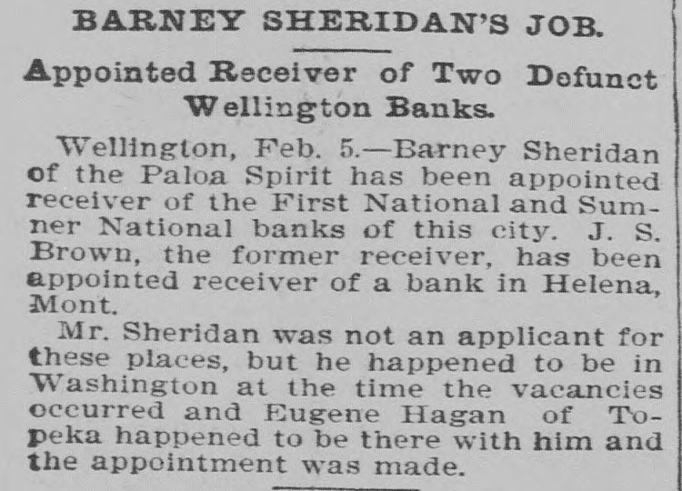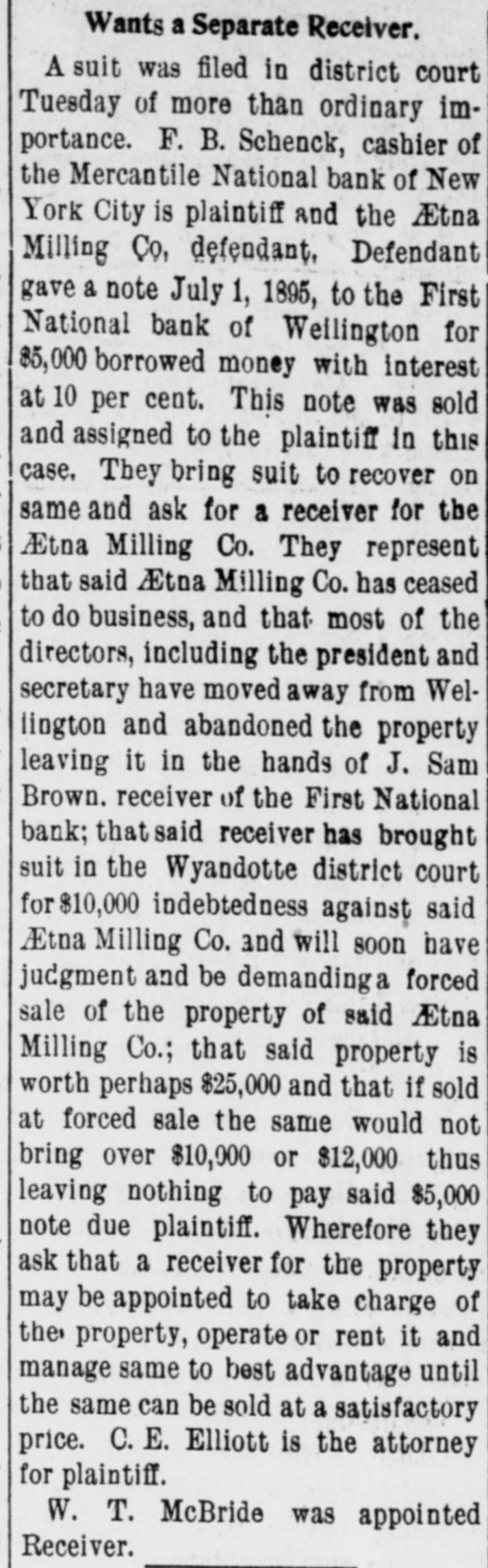 Thursday on account of insufficient papers. They agreed, however, to turn over the property to the Arkansas City bank as ordered. Geo A. Puckett, who was for more than a year manager, assistant editor and foreman of the VOICE, writes us that he is sick of Arkansas, and would like to have a job on some good Kansas paper. George is a good all-round man, and we can cheerfully recommend him. tf J. Sam Brown, receiver of the Sumner National and First National banks of Wellington, and a half dozen others, strange as it may seem, is a Republican. He draws a salary from all of them. A good gold standard Republican and a good gold standard Democrat can get mighty close together these days. The Populist and Free Silver parties at the Wellington township primary, nominated for their township candidates, the following persons for the respective offices: Trustee, Geo. W. Bailey; clerk, A. J. Banks; treasurer, J. F. Ruggles: justices, T. B. Nicholson, J. M. Ready; constables, John Treft, S. F. Utz. The jury in the case between the Stock Exchange bank VS. the Frisco railway, involving the title to the right of way and track of one mile of said road at Blackstone, came in at noon Thursday with a verdict favoring the bank in the sum of $4,851.17. The company would certainly have been wise to have paid off the balance on that mortgage, rather than to have been compelled to buy back this part of their railroad Some of our Republican friends are finding fault with O. P. Hubbard of Chikaskia township, for calling Chester I. Long a "yaller dog." We hope Populists will refrain from using such phrases. The feelings of Republicans are somewhat tender just now and there is no use lacerating tbem un. necessarily. Then, too, Herr Most has joined their party and they have suddenly quit calling us anarchists and repudiators, hence there is no cause for retaliation. Stop it, boys! stop it! A pleasant surprise was given Mrs. R. F. Plummer last Wednesday at her residence four miles northwest of the this city. The occasion was the aniversary of her birth. After a bountiful supply of the inner man the company were highly entertained with music. Mrs. John Dawson presided at the organ and Mr. Upson with the violin; recitations by Misses Lena Fuller and Cora Plummer. Those present were Mr. and Mrs. Andy Banks and father, Mr. and Mrs. John Camp, Mr. and Mrs. Robert Camp, Mr. and Mrs. E. B. Dawson, Mr. and Mrs. John Dawson, Mr. and Mrs. Wm. Dugan, Mr. nd Mrs. J. K. Moore, Mr. and Mrs. Upson, Miss Fuller. Mr. and Mrs. Van Deln, Mr. and Mrs. Dr. Reid, and children galore. At a late hour the guests departed for home after having spent a pleasant evening. In June last, Wm. J. Swartz and wife of Sioux City, Iowa, were here on a visit to Wm. Wise, who is a brother of Mrs. Swartz. Mr. Swartz met a good many people here and will be remembered as an enthusiastic McKinley man at that time. He was an old soldier, serving throughout the war. The St. Louis gold standard platform knocked him out. Mr. Wise received a letter from him a day or two ago which concludes as follows: "I am pleased to know that you are with us on the silver question. 1 will speak here for the candidates nominted at Chicago, and it is possible that I may stump this congressional district. Leave the money issue out of the question, patriotism alone should impel a good citizen to vote for Bryan and Sewell. McKinley and his followers should pull down the stars and stripes and hoist the red cross of St. George. Practically, they stand cap in hand asking John Bull to please determine what shall be the financial policy of the United States,