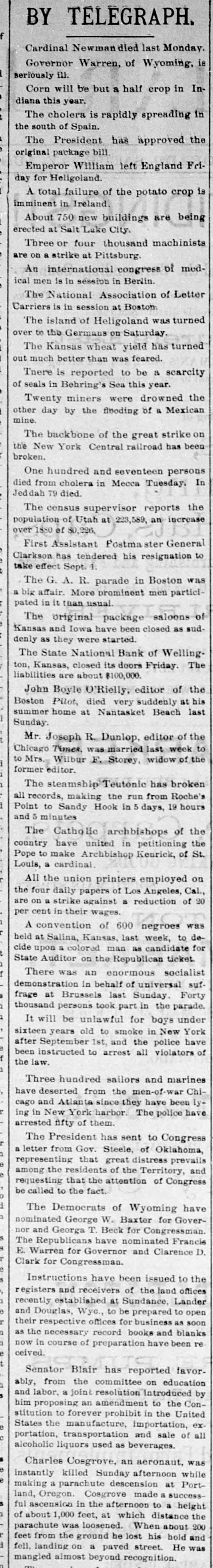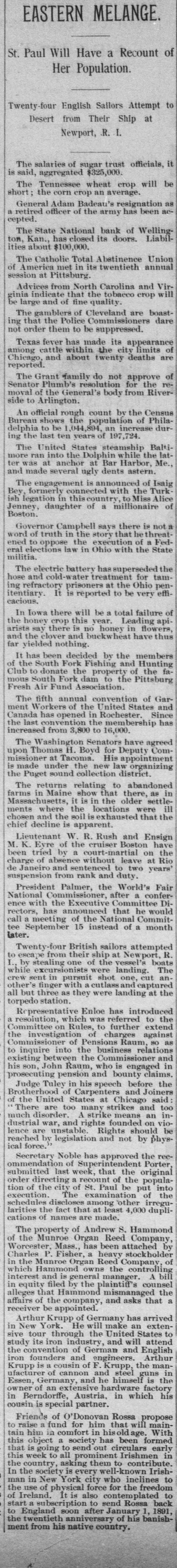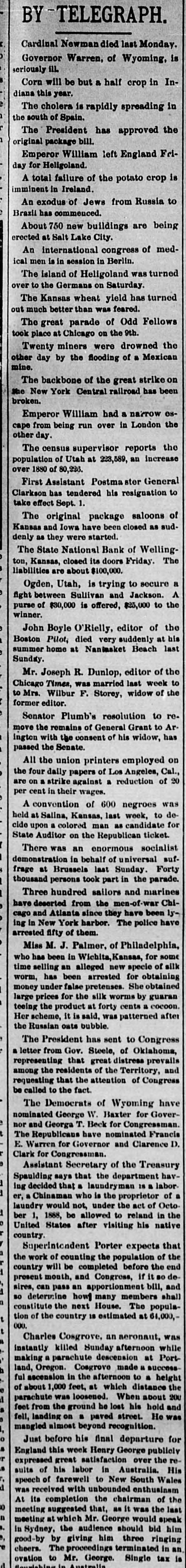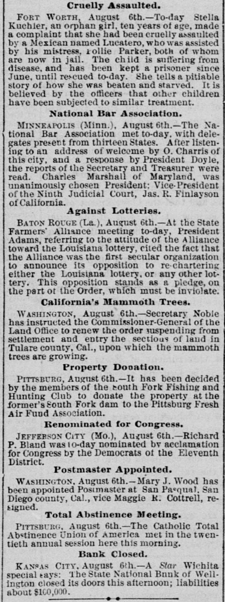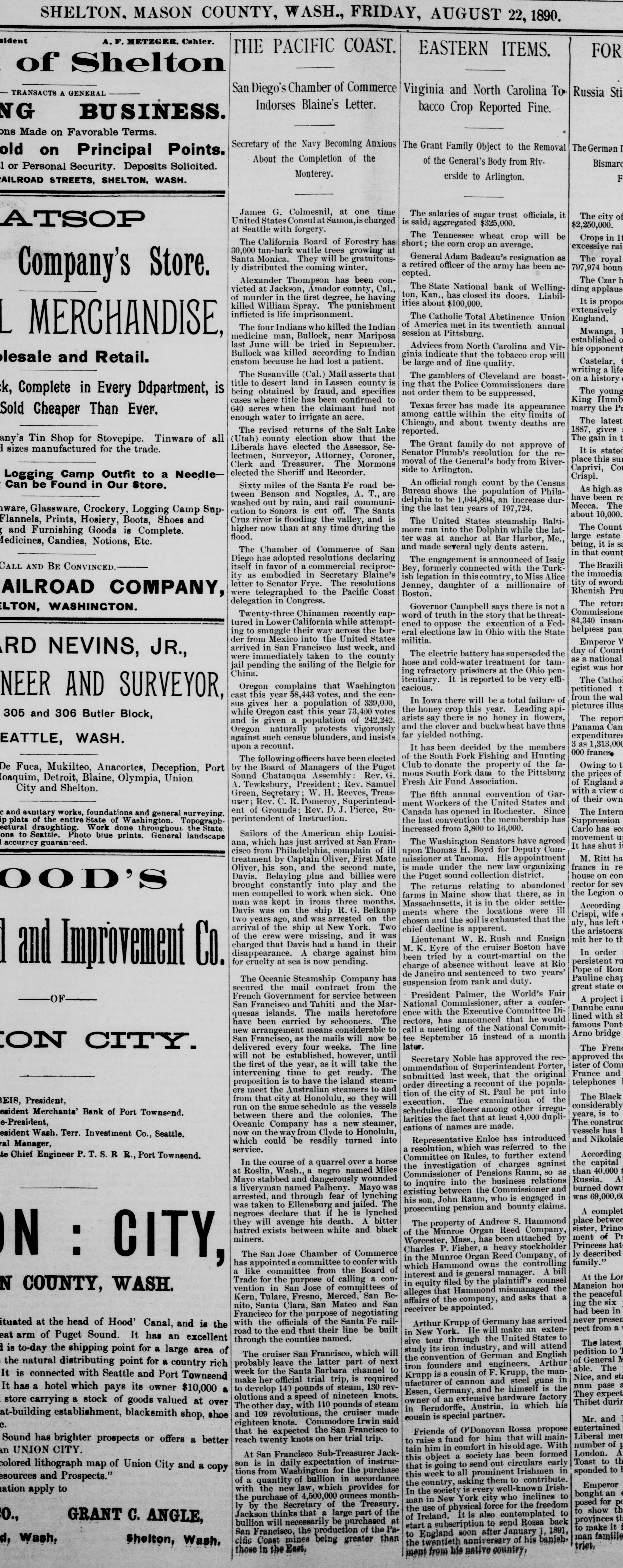 SHELTON, MASON COUNTY, WASH., FRIDAY, AUGUST 22, 1890. sident A. F. METZGER, Cshier. THE PACIFIC COAST. EASTERN ITEMS. FOR of Shelton San Diego's Chamber of Commerce TRANSACTS A GENERAL Russia Sti Virginia and North Carolina To Indorses Blaine's Letter. bacco Crop Reported Fine. NG BUSINESS. ons Made on Favorable Terms. Secretary of the Navy Becoming Anxious The Grant Family Object to the Removal The German I old on Principal Points. About the Completion of the of the General's Body from RivBismarc 1 or Personal Security. Deposits Solicited. Monterey. F erside to Arlington. AILROAD STREETS, SHELTON, WASH. James G. Colmesnil, at one time The salaries of sugar trust officials, it The city of United States Consul at Samoa, is charged ATSOP is said, aggregated $325,000. $2,250,000. at Seattle with forgery. The Tennessee wheat crop will be Crops It The California Board of Forestry has short; the corn crop an average. excessive rai 30,000 tan-bark wattle trees growing at General Adam Badeau's resignation as Santa Monica. They will be gratuitousThe royal a retired officer of the army has been ac797,974 boun ly distributed the coming winter. cepted. Company's Store. The Czar h Alexander Thompson has been conThe State National bank of Wellingvicted at Jackson, Amador county, Cal. ding applaus ton, Kan. has closed its doors. Liabilof murder in the first degree, he having It propos ities about $100,000. killed William Spray. The punishment extensively inflicted is life imprisonment. The Catholic Total Abstinence Union England. of America met in its twentieth annual The four Indians who killed the Indian Mwanga L MERCHANDISE session at Pittsburg. medicine man, Bullock, near Mariposa established last June will be tried in September Advices from North Carolina and Virhis opponent Bullock was killed according to Indian ginia indicate that the tobacco crop will lesale and Retail. Castelar, custom because he had lost a patient. be large and of fine quality. writing life The Susanville (Cal.) Mail asserts that The gamblers of Cleveland are boaston history title to desert land in Lassen county is ing that the Police Commissioners dare is The young being obtained by fraud, and specifies ck, Complete in Every Ddpartment, not order them to be suppressed. cases where title has been confirmed King Humb Texas fever has made its appearance 640 acres when the claimant had not marry the Pr Sold Cheaper Than Ever. among cattle within the city limits of enough water to irrigate an acre. The latest Chicago, and about twenty deaths are 1887, gives The revised returns of the Salt Lake reported. The gain Utah) county election show that the any's Tin Shop for Stovepipe. Tinware of all The Grant family do not approve of Liberals have elected the Assessor, Sed sizes manufactured for the trade. It stated Senator Plumb's resolution for the relectmen, Surveyor, Attorney, Coroner, place this sur moval of the General's body from RiverClerk and Treasurer. The Mormons Caprivi, Co side to Arlington. elected the Sheriff and Recorder. Logging Camp Outfit to a NeedleCrispi. An official rough count by the Census Can be Found in Our Store. Sixty miles of the Santa Fe road beAs high as Bureau shows the population of Philatween Benson and Nogales, A. T., are have been re delphia to be 1,044,894, an increase durwashed out by rain, and rail communiMecca. The ing the last ten years of 197,724. cation to Sonora is cut off. The Santa ware, Glassware, Crockery, Logging Camp Supabout 10,000. Cruz river is flooding the valley, and is Flannels, Prints, Hosiery, Boots, Shoes and The United States steamship BaltiThe Count higher now than at any time during the more ran into the Dolphin while the latand Furnishing Goods is Complete. flood. large estate ter was at anchor at Bar Harbor, Me., Medicines, Candies, Notions, Etc. being, sa and made several ugly dents astern. The Chamber of Commerce of San in that count Diego has adopted resolutions declaring The engagement is announced of Isaig The Brazili CALL AND BE CONVINCED itself in favor of a commercial reciprocBey, formerly connected with the Turk the immediat ity as embodied in Secretary Blaine's ish legation in this country to Miss Alice tity of sword letter to Senator Frye. The resolutions Jenney, daughter of a millionaire of Rhenish Pru Boston. were telegraphed to the Pacific Coast AILROAD COMPANY, delegation in Congress. The return Governor Campbell says there is not LTON, WASHINGTON. Commissione Twenty-three Chinamen recently cap word of truth in the story that he threat84,340 insan tured in Lower California while attemptened to oppose the execution of a Fedhelpiess pau ing to smuggle their way across the bor eral elections law in Ohio with the State der from Mexico into the United States militia. Emperor W arrived in San Francisco last week, and day of Count The electric battery has superseded the RD NEVINS, JR., were immediately taken to the county as national hose and cold-water treatment for tamjail pending the sailing of the Belgie for legist was bor ing refractory prisoners at the Ohio penChina. The Catho itentiary. It is reported to be very effiOregon complains that Washington cacious. petitioned cast this year 58,443 votes. and the NEER AND SURVEYOR, from the wal In Iowa there will be a total failure of sus gives her population of 339,000, pictures illus the honey crop this year. Leading apiwhile Oregon cast this year votes 305 and 306 Butler Block, arists sav there is no honey in flowers The report and is given a population of 242,242. and the elover and buckwheat have thus Panama Can Oregon naturally protests vigorously far yielded nothing. expenditures against such census blunders, and insists EATTLE, WASH. 1,313,000 upon recount. It has been decided by the members 000 francs of the South Fork Fishing and Hunting The following officers have been elected Club to donate the property of the faOwing t by the Board of Managers of the Puget De Fuca, Mukilteo, Anacortes, Deception, Port mou