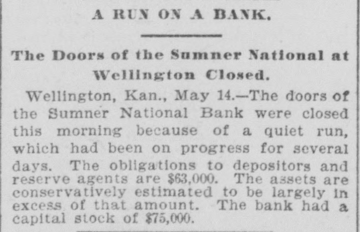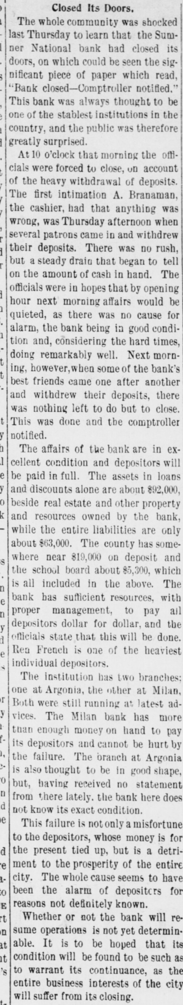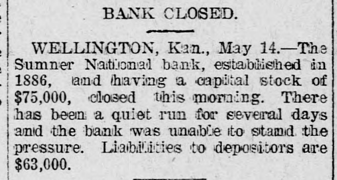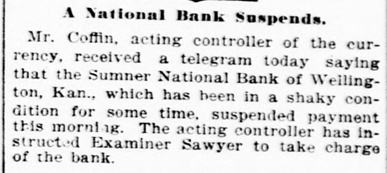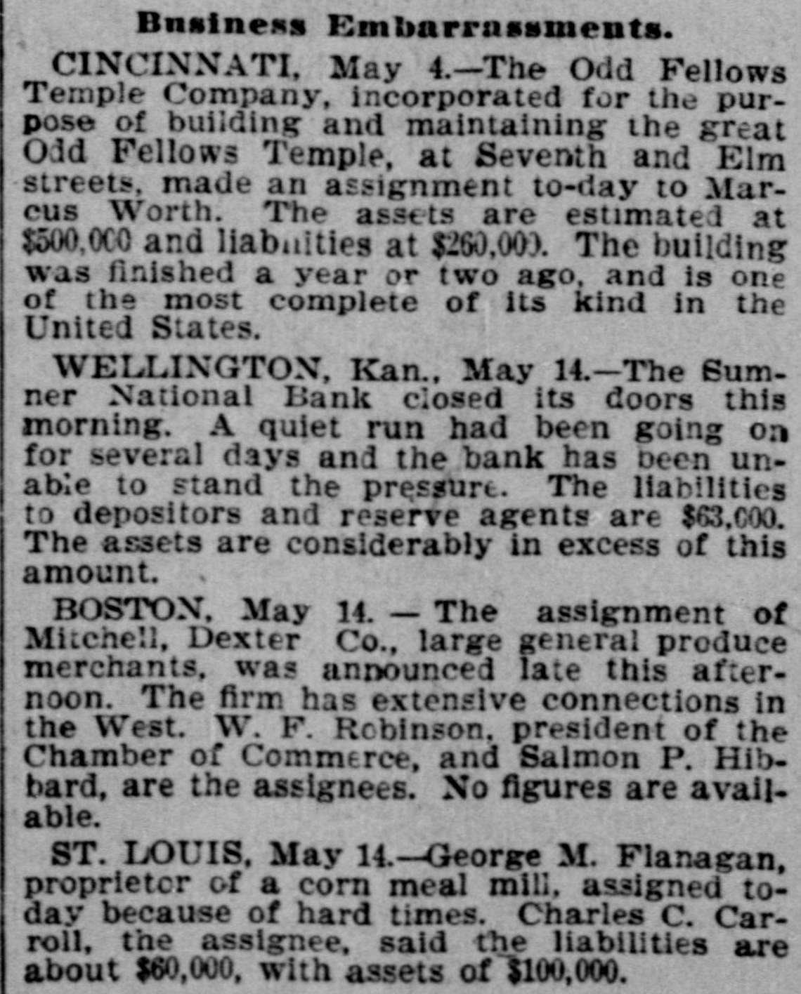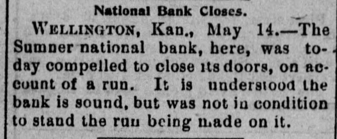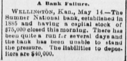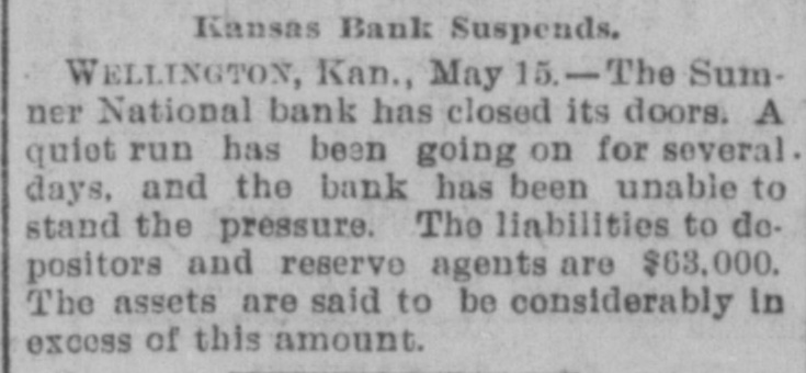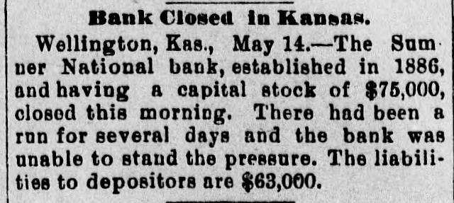 (sound). Pretty honest money mar, he is. The City Treasurer, of Omaha, Neb, has just been fined a large sum and imprisoned for embezz'ement. George Fallet & Co., New York wool dealers, have assigned. Liabili ties $75,000 (sound). The City Treasurer, of Camden, N. J., Frank F. Michellon, is short to the tune of $10,000 (sound). The New Mexico Mining Co, Santa Fe, N. M., is in thehands of a receiver. New York men own it. Liabilities $80,000 (sound). M. B. Tomblin, President, and B. Lancaster, Vice President of the Sherman county, Kan., bank, have been arrested for receiving deposits after the bank was in a failing condition. John Love, formerly cashier of the First National bank at Watkins, N. York, has beenfound guilty of making false returns to the comptroller of cur rency about the condition of the bank, and for stealing $100,000. Such as he talk "sound money" and "honest money." The First National Bank of El Reno, Oklahoma, has failed. Liabilities $50,000 (sound) The Sumner National Bank at Wel lington, Kan, has failed. It is thought it will pay part of the liabilities, which are all "sound." The Alderman Hard ware Co, Wilmington, N. C., has kicked the bucket The liabilities are are all "sound." TO Rockford Watch Company, Rockford, Ill., has assigned. Liabilities $110,000 (sound). Assets said to be $400,000, but owing to the demone tization of silver and other outrages, the assets are far from "sound." The Gilbert-Taylor Lumber Co., Elmwood N. C., is in the hands of a receiver. Liabilities between $10,000 $15,000, mostly due the First National Bank of Salisbury. Major Claude W. Wright, has been indicted in Nansemond county, Va, Superi r Court. The charge is that he stole between six and ten thousand dol lars while he was Treasurer of the city of Suffolk. Hiram Middiebrooks, assistant cash ier of the Fidelity and Trust Banking Co, Atlanta, Ga, is in jail in that city. He wanted honest money 80 bad that he stole $13,000 from the bank, and misapplied notes for $1 400, appropriating the money. He is another fair sample of theaverage goldbug who wants "honest money." W.W. Workman & Co, furniture dealers, Roanoke, Va., have assigned. Liabilities about $4,000 (sound). John Clark, Manchester, N. C., cot ton manufacturer and merchant, as signed one day last week. Liabilities away up in the thousands, and all sound. Assetsare valuable, but under a gold standard. will not bring much