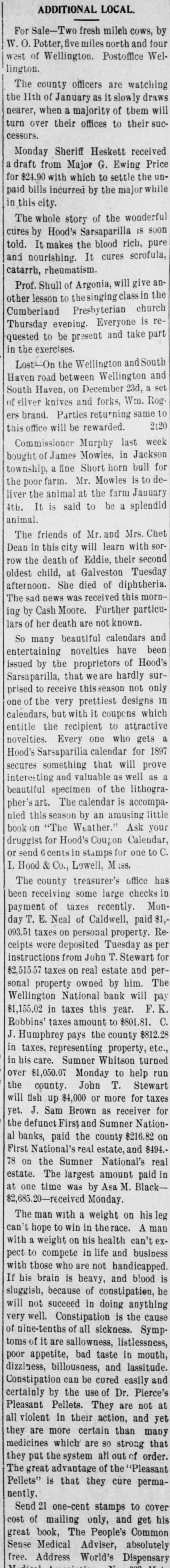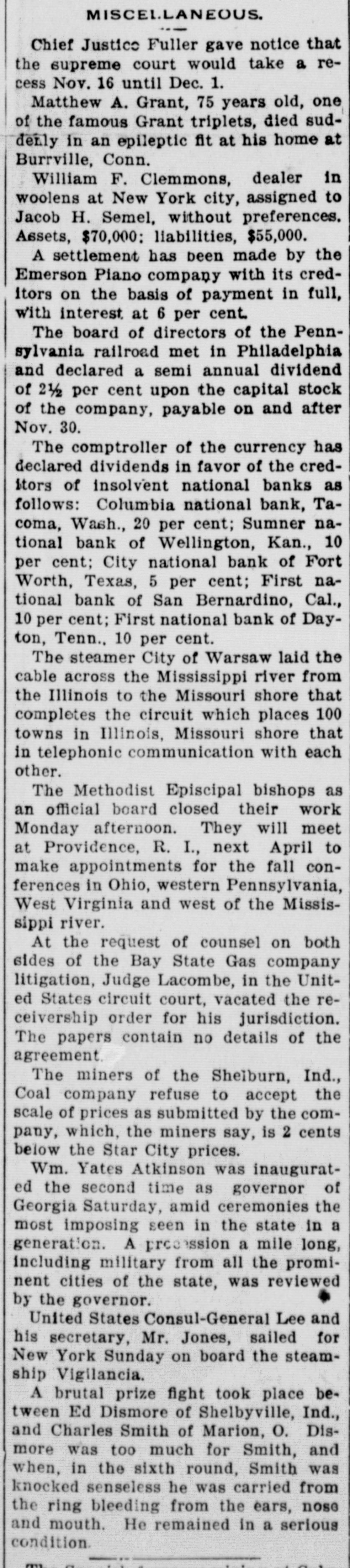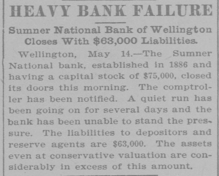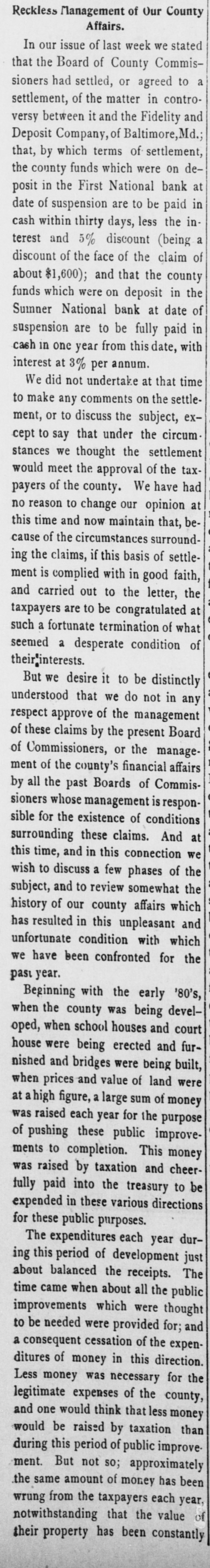 (sound). Pretty honest money mar, he is. The City Treasurer, of Omaha, Neb, has just been fined a large sum and imprisoned for embezz'ement. George Fallet & Co., New York wool dealers, have assigned. Liabili ties $75,000 (sound). The City Treasurer, of Camden, N. J., Frank F. Michellon, is short to the tune of $10,000 (sound). The New Mexico Mining Co, Santa Fe, N. M., is in thehands of a receiver. New York men own it. Liabilities $80,000 (sound). M. B. Tomblin, President, and B. Lancaster, Vice President of the Sherman county, Kan., bank, have been arrested for receiving deposits after the bank was in a failing condition. John Love, formerly cashier of the First National bank at Watkins, N. York, has beenfound guilty of making false returns to the comptroller of cur rency about the condition of the bank, and for stealing $100,000. Such as he talk "sound money" and "honest money." The First National Bank of El Reno, Oklahoma, has failed. Liabilities $50,000 (sound) The Sumner National Bank at Wel lington, Kan, has failed. It is thought it will pay part of the liabilities, which are all "sound." The Alderman Hard ware Co, Wilmington, N. C., has kicked the bucket The liabilities are are all "sound." TO Rockford Watch Company, Rockford, Ill., has assigned. Liabilities $110,000 (sound). Assets said to be $400,000, but owing to the demone tization of silver and other outrages, the assets are far from "sound." The Gilbert-Taylor Lumber Co., Elmwood N. C., is in the hands of a receiver. Liabilities between $10,000 $15,000, mostly due the First National Bank of Salisbury. Major Claude W. Wright, has been indicted in Nansemond county, Va, Superi r Court. The charge is that he stole between six and ten thousand dol lars while he was Treasurer of the city of Suffolk. Hiram Middiebrooks, assistant cash ier of the Fidelity and Trust Banking Co, Atlanta, Ga, is in jail in that city. He wanted honest money 80 bad that he stole $13,000 from the bank, and misapplied notes for $1 400, appropriating the money. He is another fair sample of theaverage goldbug who wants "honest money." W.W. Workman & Co, furniture dealers, Roanoke, Va., have assigned. Liabilities about $4,000 (sound). John Clark, Manchester, N. C., cot ton manufacturer and merchant, as signed one day last week. Liabilities away up in the thousands, and all sound. Assetsare valuable, but under a gold standard. will not bring much