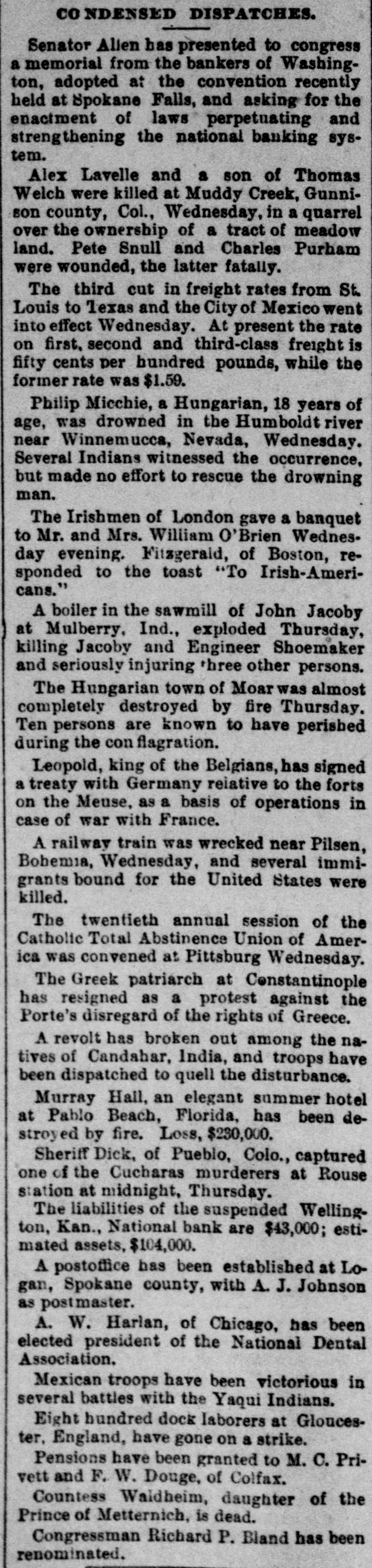 CO NDENSED DISPATCHES. Senator Alien has presented to congress a memorial from the bankers of Washington, adopted at the convention recently held at Spokane Falls, and asking for the enactment of laws perpetuating and strengthening the national banking system. Alex Lavelle and a son of Thomas Welch were killed at Muddy Creek, Gunnison county, Col., Wednesday, in a quarrel over the ownership of a tract of meadow land. Pete Snull and Charles Purham were wounded, the latter fatally. The third cut in freight rates from St. Louis to Texas and the City of Mexico went into effect Wednesday. At present the rate on first. second and third-class freight is fifty cents per hundred pounds, while the former rate was $1.59. Philip Micchie, a Hungarian, 18 years of age, was drowned in the Humboldt river near Winnemucca, Nevada, Wednesday. Several Indians witnessed the occurrence, but made no effort to rescue the drowning man. The Irishmen of London gave a banquet to Mr. and Mrs. William O'Brien Wednesday evening. Fitzgerald, of Boston, responded to the toast "To Irish-Americans." A boiler in the sawmill of John Jacoby at Mulberry, Ind., exploded Thursday, killing Jacoby and Engineer Shoemaker and seriously injuring three other persons. The Hungarian town of Moar was almost completely destroyed by fire Thursday. Ten persons are known to have perished during the con flagration. Leopold, king of the Belgians, has signed a treaty with Germany relative to the forts on the Meuse, as a basis of operations in case of war with France. A railway train was wrecked near Pilsen, Bohemia, Wednesday, and several immigrants bound for the United States were killed. The twentieth annual session of the Catholic Total Abstinence Union of America was convened at Pittsburg Wednesday. The Greek patriarch at Constantinople has resigned as a protest against the Porte's disregard of the rights of Greece. A revolt has broken out among the natives of Candahar, India, and troops have been dispatched to quell the disturbance. Murray Hall, an elegant summer hotel at Pablo Beach, Florida, has been destroyed by fire. Loss, $230,000. Sheriff Dick, of Pueblo, Colo., captured one of the Cucharas murderers at Rouse station at midnight, Thursday. The liabilities of the suspended Wellington, Kan., National bank are $43,000; estimated assets, $104,000. A postoffice has been established at Logan, Spokane county, with A. J. Johnson as postmaster. A. W. Harlan, of Chicago, has been elected president of the National Dental Association. Mexican troops have been victorious in several battles with the Yaqui Indians. Eight hundred dock laborers at Gloucester, England, have gone on a strike. Pensions have been granted to M. C. Privett and F. W. Douge, of Colfax. Countess Waldheim, daughter of the Prince of Metternich, is dead. Congressman Richard P. Bland has been renominated.