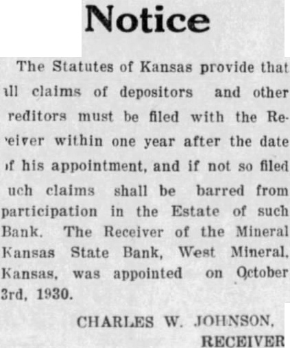 Bank. The Receiver of the Mineral Kansas State Bank, West Mineral, Kansas, was appointed on October