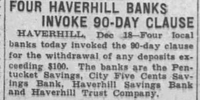 FOUR HAVERHILL BANKS INVOKE 90-DAY CLAUSE today invoked the 90-day clause for the of any deposits ex. ceeding $100. The banks are the Pentucket City Bank, Savings Bank and Haverhill Trust Company.