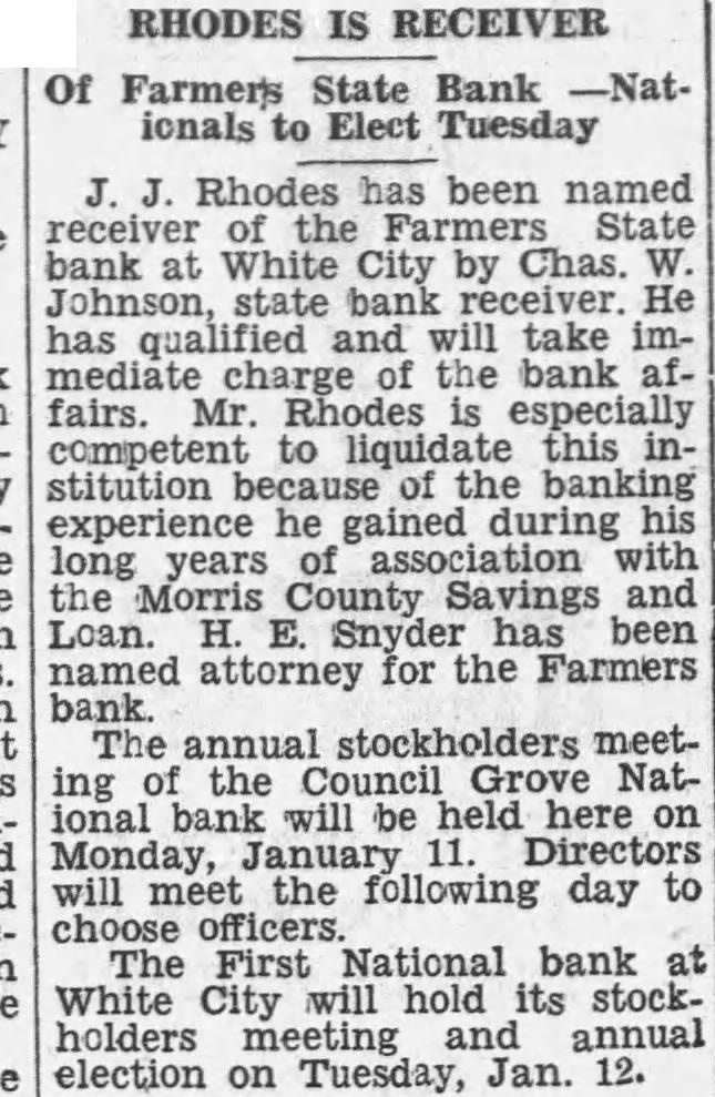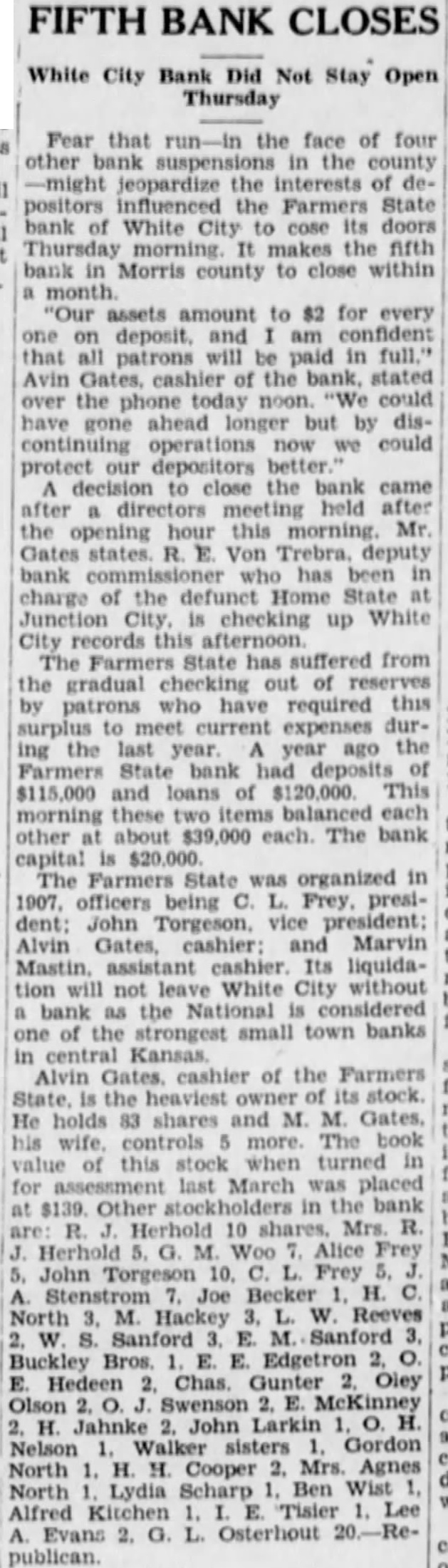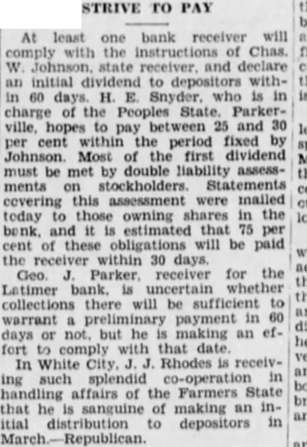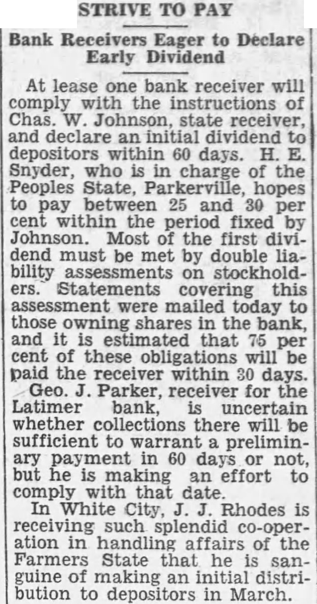 BANK PAY Three stockholders the Farmers State bank at White City have paid their double liability and been released by Johnson, state bank receivE. Sanford. owner of shares of stock paid $300, Ole Olson paid $200 and Alfred Kitchen paid $100.