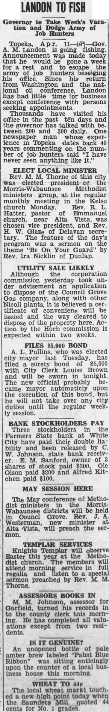 Topeka, Landon going fishing. Announcement was made today that he would be gone week for rest and to escape the army of job hunters beseiging office. Since his return from Washington and the national conference, Landon has had little time for business except conference with persons seeking appointments. Thousands have visited his office in the past ten days and the governor has talked with between 200 and 300 daily. One newspaper man whose experience Topeka dates back years commenting on the number of job hunters said have never seen anything like