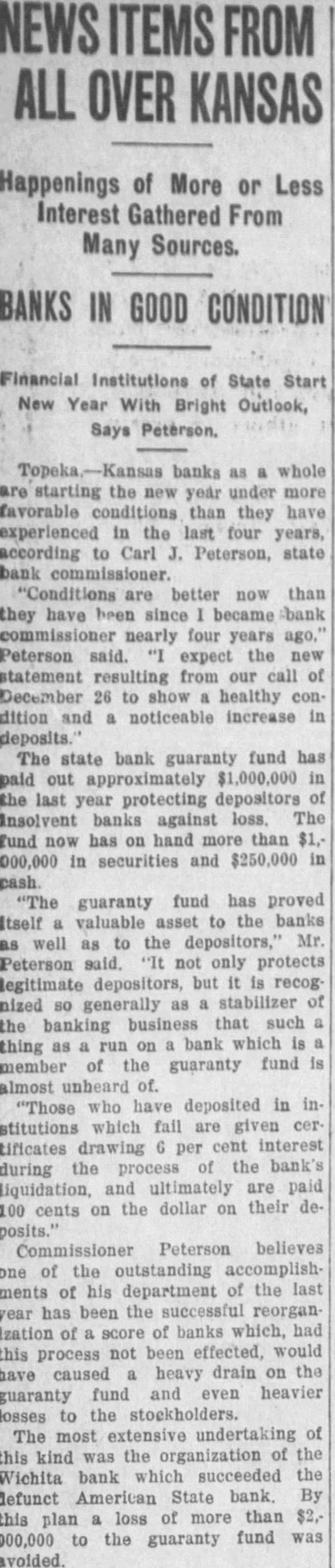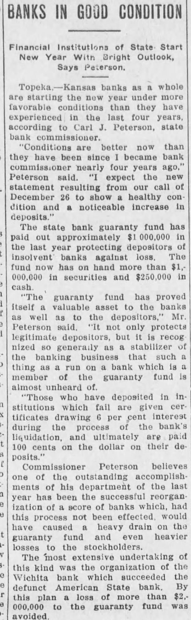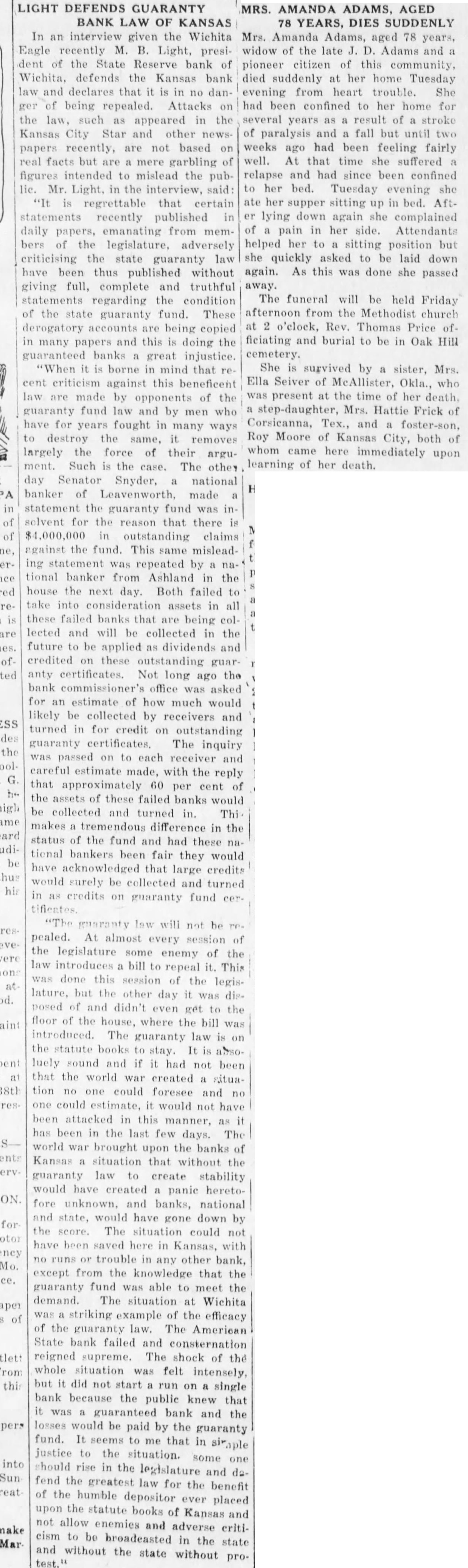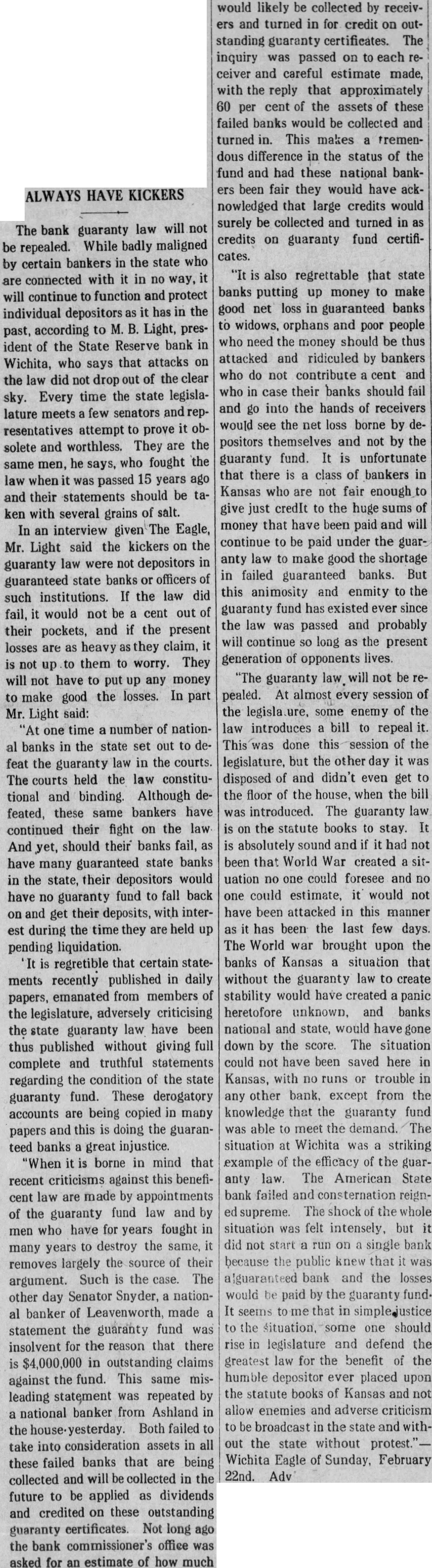 In an interview given the Wichita Eagle recently M. B. Light, president of the State Reserve bank of Wichita, defends the Kansas bank law and declares that it is in no danger of being repealed. Attacks on the law, such as appeared in the Kansas City Star and other newspapers recently, are not based on real facts but are mere garbling of figures intended to mislead the public. Mr. Light, in the interview, said: "It is regrettable that certain statements recently published in daily papers, emanating from members of the legislature, adversely criticising the state guaranty law have been thus published without giving full, complete and truthful statements regarding the condition of the state guaranty fund. These derogatory accounts are being copied in many papers and this is doing the guaranteed banks great injustice. "When it is borne in mind that criticism against this beneficent are made by opponents of the guaranty fund law and by men who have for years fought in many ways to destroy the same, it removes largely the force of their argument. Such is the case. The other day Senator Snyder, national banker of Leavenworth, made statement the guaranty fund was insolvent for the reason that there is $4,000,000 in outstanding claims against the fund. This same misleading statement was repeated by tional banker from Ashland in the house the next day. Both failed to take into consideration assets in all these failed banks that are being collected and will be collected in the future to be applied as dividends and credited on these outstanding guaranty certificates. Not long ago the bank commissioner's office was asked for an estimate of how much would likely be collected by receivers and turned in for credit on outstanding guaranty The inquiry was passed on to each receiver and careful estimate made, with the reply that approximately 60 per cent of the assets of these failed banks would be collected and turned in. Thi makes tremendous difference in the status of the fund and had these natienal bankers been fair they would have acknowledged that large credits would surely be collected and turned in credits on guaranty fund guaranty law will not be pealed. At almost every session of the legislature some enemy of the law introduces bill to repeal it. This was done this session of the legislature. but the other day it was disposed of and didn't even get to the floor of the house, where the bill was introduced. The guaranty law the statute books to stay. It is abso luely sound and if it had not been that the world war created situation no one could foresee and no one could estimate, it would not have been attacked in this manner, as it has been in the last few days. The world war brought upon the banks of Kansas situation that without the guaranty law to create stability would have created panic heretofore unknown, and banks, national and state, would have gone down by the score. The situation could not have been saved here in Kansas, with no runs or trouble in any other bank, except from the knowledge that the guaranty fund was able to meet the demand. The situation at Wichita was striking example of the efficacy of the guaranty law. The American State bank failed and consternation reigned supreme. The shock of the whole situation was felt intensely, but it did not start run on single bank because the public knew that it was guaranteed bank and the losses would be paid by the guaranty fund. It seems to me that in justice to the situation. some one should rise in the legislature and dafend the greatest law for the benefit of the humble depositor ever placed upon the statute books of Kansas and not allow enemies and adverse criticism to be broadeasted in the state test." and without the state without pro-