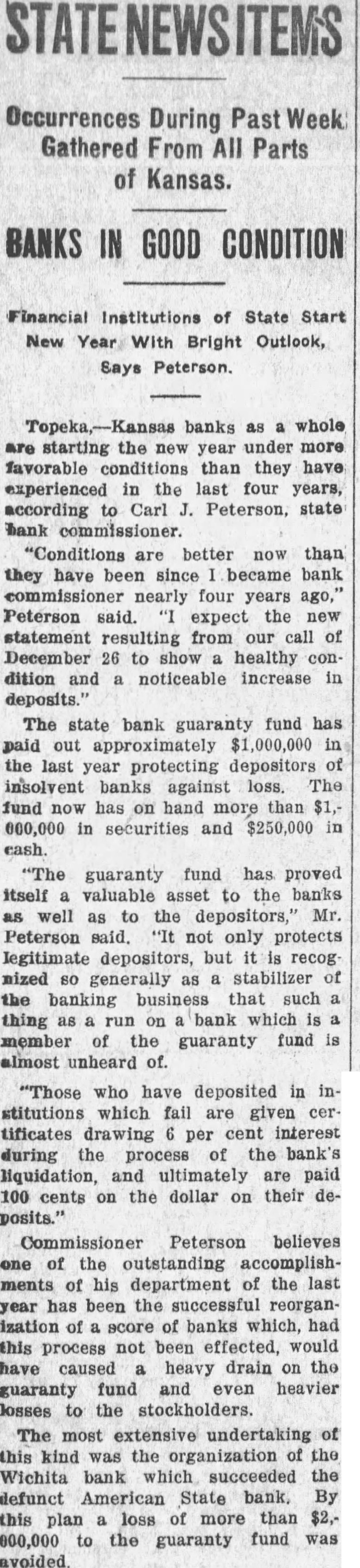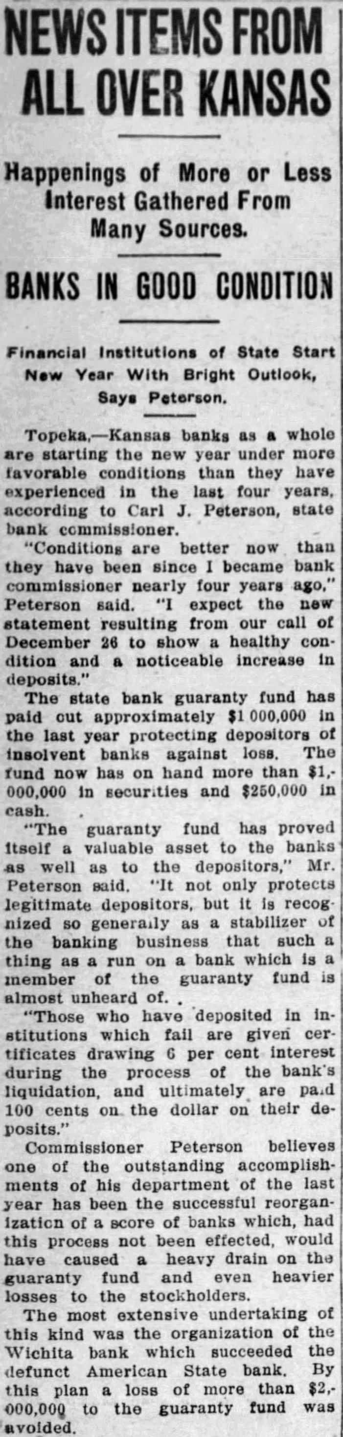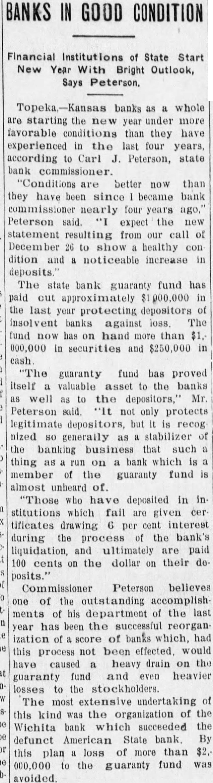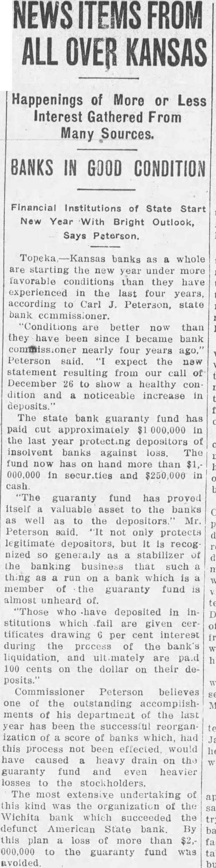 In an interview given the Wichita Eagle recently M. B. Light, president of the State Reserve bank of Wichita, defends the Kansas bank law and declares that it is in no danger of being repealed. Attacks on the law, such as appeared in the Kansas City Star and other newspapers recently, are not based on real facts but are mere garbling of figures intended to mislead the public. Mr. Light, in the interview, said: "It is regrettable that certain statements recently published in daily papers, emanating from members of the legislature, adversely criticising the state guaranty law have been thus published without giving full, complete and truthful statements regarding the condition of the state guaranty fund. These derogatory accounts are being copied in many papers and this is doing the guaranteed banks great injustice. "When it is borne in mind that criticism against this beneficent are made by opponents of the guaranty fund law and by men who have for years fought in many ways to destroy the same, it removes largely the force of their argument. Such is the case. The other day Senator Snyder, national banker of Leavenworth, made statement the guaranty fund was insolvent for the reason that there is $4,000,000 in outstanding claims against the fund. This same misleading statement was repeated by tional banker from Ashland in the house the next day. Both failed to take into consideration assets in all these failed banks that are being collected and will be collected in the future to be applied as dividends and credited on these outstanding guaranty certificates. Not long ago the bank commissioner's office was asked for an estimate of how much would likely be collected by receivers and turned in for credit on outstanding guaranty The inquiry was passed on to each receiver and careful estimate made, with the reply that approximately 60 per cent of the assets of these failed banks would be collected and turned in. Thi makes tremendous difference in the status of the fund and had these natienal bankers been fair they would have acknowledged that large credits would surely be collected and turned in credits on guaranty fund guaranty law will not be pealed. At almost every session of the legislature some enemy of the law introduces bill to repeal it. This was done this session of the legislature. but the other day it was disposed of and didn't even get to the floor of the house, where the bill was introduced. The guaranty law the statute books to stay. It is abso luely sound and if it had not been that the world war created situation no one could foresee and no one could estimate, it would not have been attacked in this manner, as it has been in the last few days. The world war brought upon the banks of Kansas situation that without the guaranty law to create stability would have created panic heretofore unknown, and banks, national and state, would have gone down by the score. The situation could not have been saved here in Kansas, with no runs or trouble in any other bank, except from the knowledge that the guaranty fund was able to meet the demand. The situation at Wichita was striking example of the efficacy of the guaranty law. The American State bank failed and consternation reigned supreme. The shock of the whole situation was felt intensely, but it did not start run on single bank because the public knew that it was guaranteed bank and the losses would be paid by the guaranty fund. It seems to me that in justice to the situation. some one should rise in the legislature and dafend the greatest law for the benefit of the humble depositor ever placed upon the statute books of Kansas and not allow enemies and adverse criticism to be broadeasted in the state test." and without the state without pro-
