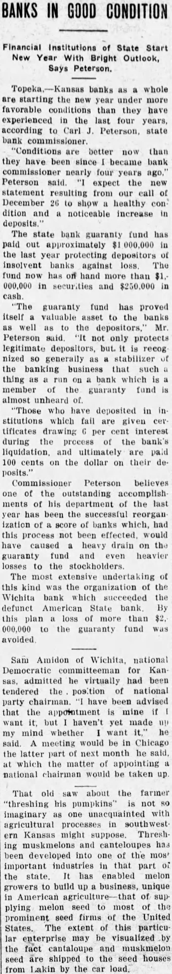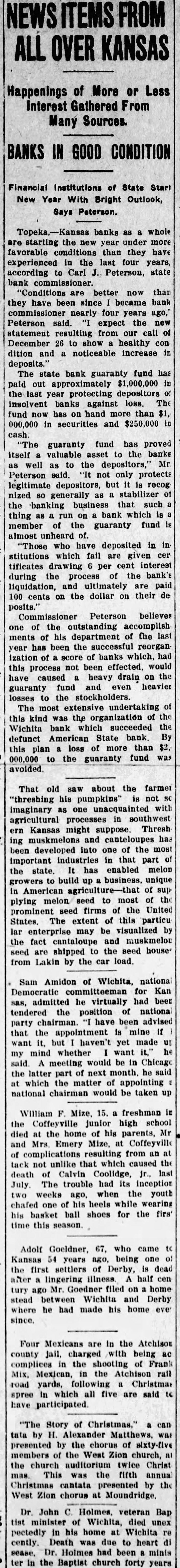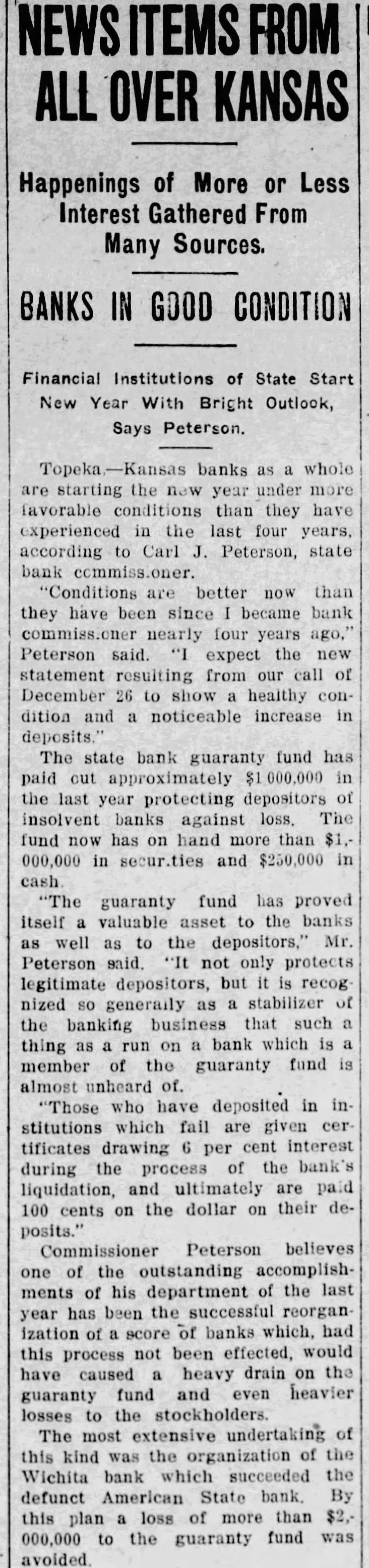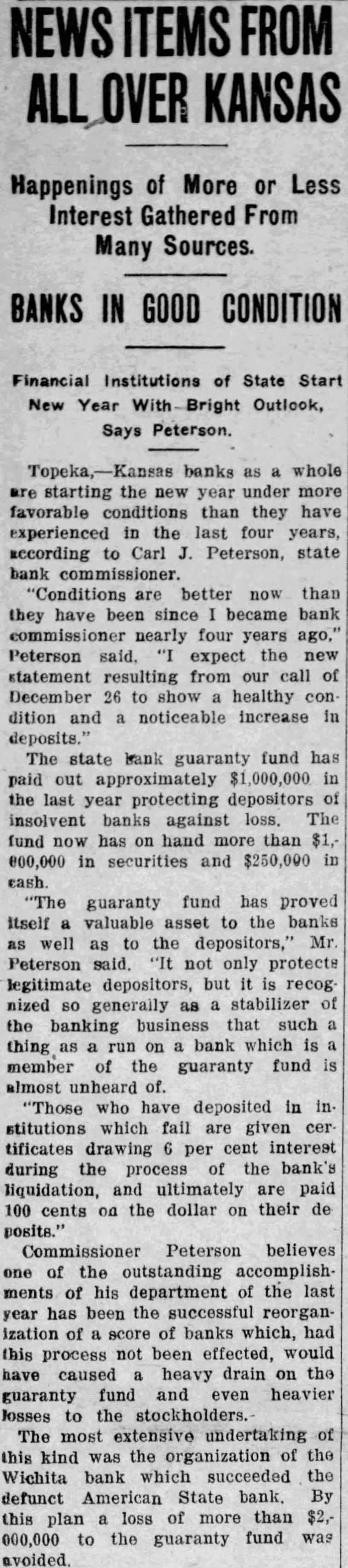 In an interview given the Wichita Eagle recently M. B. Light, president of the State Reserve bank of Wichita, defends the Kansas bank law and declares that it is in no danger of being repealed. Attacks on the law, such as appeared in the Kansas City Star and other newspapers recently, are not based on real facts but are mere garbling of figures intended to mislead the public. Mr. Light, in the interview, said: "It is regrettable that certain statements recently published in daily papers, emanating from members of the legislature, adversely criticising the state guaranty law have been thus published without giving full, complete and truthful statements regarding the condition of the state guaranty fund. These derogatory accounts are being copied in many papers and this is doing the guaranteed banks great injustice. "When it is borne in mind that criticism against this beneficent are made by opponents of the guaranty fund law and by men who have for years fought in many ways to destroy the same, it removes largely the force of their argument. Such is the case. The other day Senator Snyder, national banker of Leavenworth, made statement the guaranty fund was insolvent for the reason that there is $4,000,000 in outstanding claims against the fund. This same misleading statement was repeated by tional banker from Ashland in the house the next day. Both failed to take into consideration assets in all these failed banks that are being collected and will be collected in the future to be applied as dividends and credited on these outstanding guaranty certificates. Not long ago the bank commissioner's office was asked for an estimate of how much would likely be collected by receivers and turned in for credit on outstanding guaranty The inquiry was passed on to each receiver and careful estimate made, with the reply that approximately 60 per cent of the assets of these failed banks would be collected and turned in. Thi makes tremendous difference in the status of the fund and had these natienal bankers been fair they would have acknowledged that large credits would surely be collected and turned in credits on guaranty fund guaranty law will not be pealed. At almost every session of the legislature some enemy of the law introduces bill to repeal it. This was done this session of the legislature. but the other day it was disposed of and didn't even get to the floor of the house, where the bill was introduced. The guaranty law the statute books to stay. It is abso luely sound and if it had not been that the world war created situation no one could foresee and no one could estimate, it would not have been attacked in this manner, as it has been in the last few days. The world war brought upon the banks of Kansas situation that without the guaranty law to create stability would have created panic heretofore unknown, and banks, national and state, would have gone down by the score. The situation could not have been saved here in Kansas, with no runs or trouble in any other bank, except from the knowledge that the guaranty fund was able to meet the demand. The situation at Wichita was striking example of the efficacy of the guaranty law. The American State bank failed and consternation reigned supreme. The shock of the whole situation was felt intensely, but it did not start run on single bank because the public knew that it was guaranteed bank and the losses would be paid by the guaranty fund. It seems to me that in justice to the situation. some one should rise in the legislature and dafend the greatest law for the benefit of the humble depositor ever placed upon the statute books of Kansas and not allow enemies and adverse criticism to be broadeasted in the state test." and without the state without pro-