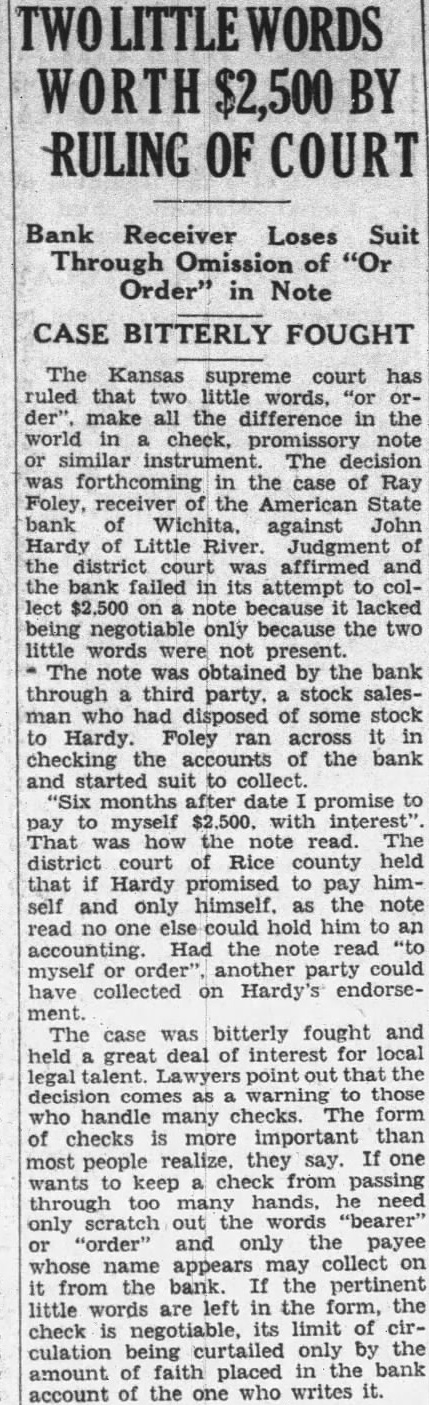 WORTH RULING OF COURT Bank Receiver Loses Suit Through Omission of "Or Order" in Note CASE BITTERLY FOUGHT The Kansas supreme court has ruled that two little words. der". make all the difference in the world in check, promissory note or similar instrument. The decision was forthcoming in the case of Ray Foley, receiver the American State bank of Wichita. against John Hardy Little River. Judgment of the district was affirmed and the bank in its attempt col$2.500 on note because lacked being negotiable only because the two little words not present. The note was obtained by the bank through third party. stock salesdisposed of some stock to Hardy. Foley ran in the the bank started suit to collect. 'Six months after date promise to pay to myself with interest" That how the note read. The district court of Rice county held that Hardy promised to pay himself and only himself. as the note read no could hold him to an accounting. Had the note read "to myself or order", another party could have collected on Hardy's endorsement. The case was bitterly fought and held great deal interest for local legal talent. point those who handle checks. form of checks more important than most people realize. they say. If one wants keep passing through hands. he need only scratch out the words "bearer" "order" and only the payee whose name appears may collect on from the bank. If the pertinent little words left in the form, the check negotiable, its limit of cirbeing curtailed by the culation only of faith placed in the bank amount account of the one who writes it.