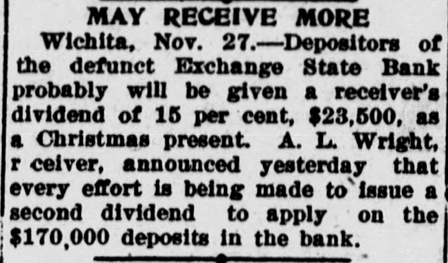 STATE CONTROLS TEN BANKS B. V. Curry Is Official Receiver for All Institutions. Ten state banks are now closed and under control of the state bank commissioner. B. V. Curry, an assistant bank commissioner, is the official receiver of all ten of these institutions. In addition to the ten, there are nine banks in the state now operating under individual receivers. The ten banks under state control and of which Mr. Curry is receiver: Farmers' State bank, Washington. State Savings bank, Leavenworth. Farmers' State bank, Quenemo. C. M. Condon & Co., State bank, Oswego. Traders' State bank, Arkansas City. Citizens State bank, Geuda Springs. Exchange State bank, Wichita, State bank of Hope. Citizens' State bank, Harper. Farmers State Bank, Belmont. Mr. Curry has just been appointed receiver of the Citizens State Bank of Harper, the last bank to be closed by State Bank Commissioner Foster. Following -are the institutions now operating under private receivers: Citizens State Bank, Manhattan. People's State Bank. Salina. Broeker-Lefferdink Bank, Salina. Farmers and Merchants Bank, Pawnee Rock. Farmers State Bank, McCune. Viola State Bank, Viola. Aulne State Bank, Aulne. Hanover State Bank, Hanover. Farmers State Bank, Spring Hill.