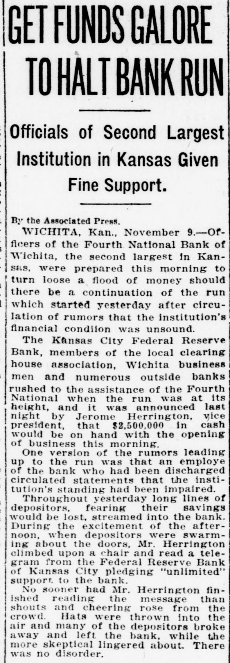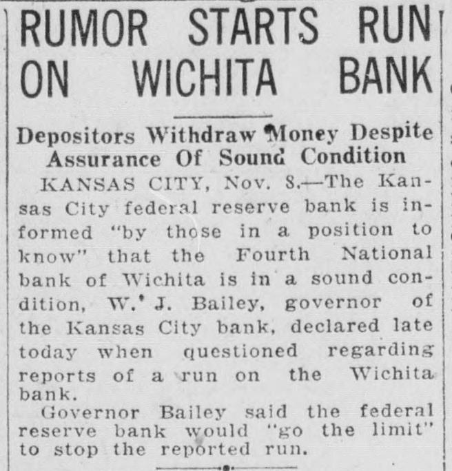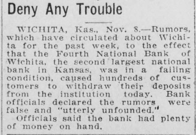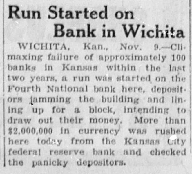 Dale Critser, teller at the Fourth National bank and renowned basketball official, has had some warm minutes in his work on the courts, but Dale never saw so many people clamoring for attention at the same time as he did in the bank Saturday noon. Since the consolidation of the Wichita State Bank and the Fourth National, the crowd cashing paychecks fills the entire lobby of the building It looks almost like a run on the bank.