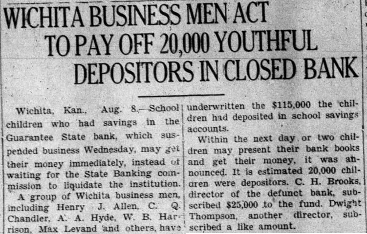 WICHITA BUSINESS MEN ACT TO PAY OFF 20,000 YOUTHFUL DEPOSITORS IN CLOSED BANK Wichita, Kan., Aug. School children who had savings in the Guarantee State bank, which suspended business Wednesday, may get their money immediately, instead of waiting for the State Banking commission to liquidate the institution. A group of Wichita business men, including Henry J. Allen, C. Q Chandler, A. A. Hyde, W. B. Harrison, Max Levand and others, have underwritten the $115,000 the children had deposited in school savings accounts. Within the next day or two children may present their bank books and get their money, it was ahnounced. It is estimated 20,000 chilaren were depositors. C. H. Brooks, director of the defunct bank, subscribed $25,000 to the fund. Dwight Thompson, another director, subscribed a like amount.
