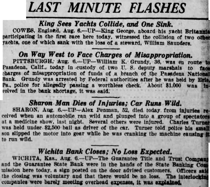 LAST MINUTE FLASHES King Sees Yachts Collide, and One Sink. COWES. England. Aug. George, aboard his yacht Britannia participating the first race here today. witnessed the collision other yachts, one of which sank with the steward, William Saunders. On Way West to Face Charges of Misappropriation. PITTSBURGH, Aug. Grundy, was Pasadena, Calif., today custody of deputy marshals charges of misappropriation of funds of branch of the Pasadena National Grundy was Federal authorities after by Erie, police for allegedly passing check. About $1,000 was volved in the bank shortage, it was said. Sharon Man Dies of Injuries; Car Runs Wild. SHARON, Aug. Penman, 52, died today from injuries ceived when an automobile ran wild and plunged into spectators night. Several others were injured. Charles Turner held $2,500 driver the car. his police small son slipped the motor into gear while he was cranking the machine causing run wild. Wichita Bank Closes; No Loss Expected. WICHITA, Kas., Aug. Guarantee Title and Trust Company and the Guarantee State Bank were in the hands the State Banking here sign posted on the customers. Officers the closing was voluntary and that there would be no loss. interlocking companies were barely meeting overhead expenses, it was explained.