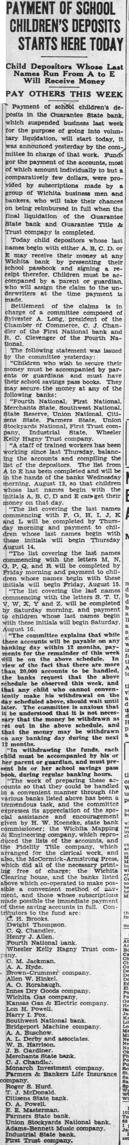 PAYMENT OF SCHOOL CHILDREN'S DEPOSITS STARTS HERE TODAY Child Depositors Whose Last Names Run From A to E Will Receive Money PAY OTHERS THIS WEEK Payment of school children's deposits in the Guarantee State bank. which suspended business last week for the purpose of going into voluntary liquidation, will start today, it was announced yesterday by the committee in charge of that work. Funds gor the payment of the accounts, most of which amount individually to but comparatively few dollars, were provided by subscriptions made by group of Wichita business men and bankers, who will take their chances on being reimbursed in full when the final liquidation of the Guarantee State bank and Guarantee Title & Trust company is completed. Today child depositors whose last names begin with either A, C. or may receive their money at any Wichita bank by presenting their school passbook and signing receipt therefor. Children must be accompaned by parent or guardian, who will the claim to the underwriters at the time payment is made. Settlement of the claims is in charge of composed of Sylvester A. Long, of the Chamber of C. Chandler of the First National bank and R. Clevenger of the Fourth NaThe following statement was issued by the committee yesterday "Children who wish to secure their money must be by parents or guardians and must have their school savings pass books. They may secure the money at any of the following banks: "Fourth National, First National. Merchants State. National, State Reserve, Union National. Citizens State. Farmers State, Union Stockyards National, First Trust company, Industrial State, Wheeler Kelly Hagny Trust company. staff of trained workers has been working since last Thursday, balancing the accounts and compiling the list of the depositors. The list from to has been completed and will be in the hands of the banks Wednesday morning, August 13, so that children whose last names begin with the initials A, C, and E can their money on that day. "The list covering the last names with G, H. J, and L will be completed by Thursday morning and payment to children whose last names begin with these initials will begin Thursday August 14. "The list covering the last names commencing with the letters M. N, O. P, Q. and R will be completed by Friday and payment to children whose names begin with these initials will begin Friday, August 15. "The list covering the last names commencing with the letters S. V. W. and z. will be completed by Saturday morning, and payment to children whose names begin with these initials will begin Saturday, August 16. committee explains that while these accounts will payable on any banking day within 12 months, payments for the remainder this week will be on the above schedule. In view of the fact that there are than 20,000 accounts to handled, the banks request that the above schedule observed this week, and that any child who cannot conveniently make his withdrawal on the day scheduled above, should wait until later. The committee is that it be that it is necessary that the money be withdrawn set out in the above schedule, and that the money may be withdrawn any banking day during the next 12 withdrawing the funds, each child must be accompanied by his or her parent guardian, must present his or her school savings pass book. during regular banking hours. "The work of preparing these counts so that they could be handled in convenient manner through the various banks listed above has been tremendous task, and the committee expresses its appreciation of the special assistance and given by H. Koeneke, state bank commissioner; the Wichita Mapping & Engineering which reproduced the lists of the accounts, and the Fidelity Title which for the clerical work, and also, the Armstrong Press, which did all of the necessary printing free of charge; the Wichita Clearing house, and the banks listed above which co-operated to make possible convenient method of gavment, and those whose subscriptions made possible the immediate payment of these saving accounts in full. Contributors to the fund are: H. Brooks. Dwight Thompson. Q. Chandler. Henry Allen. Fourth National bank. Wheeler Kelly Hagny Trust comJackman. Hyde. company. Allen Hinkel. A. Rorabaugh. Innes Goods company. Wichita Gas company. Kansas Gas & Electric company. Lon H. Powell. Harry Fox. Southwest National bank. Bridgeport Machine company. A. A. Buschow. Derby associates. Harrison. B. Gardiner. State bank. Monarch Investment company. Farmers & Bankers Life Insurance company. Roger Hurd. Citizens State Powell. Masterman. Farmers State bank. Union Stockyards National bank. Music company. Industrial State bank. First Trust company.