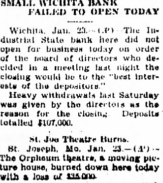 WICHITA BANK FAILED OPEN TODAY Wichita Jan. The dustrial State bank here not for business today order directors deelded night the closing would the Interthe Heavy Saturday given the directors reason closing Deposits totalled $107,000. St. house, down here