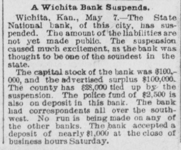 A Wichita Bank Suspends. Wichita, Kan., May 7.-The State National bank, of this city, has suspended. The amount of the liabilities are not yet made public. The suspension caused much excitement, as the bank was thought to be one of the soundest in the state. The capital stock of the bank was $100.000, and the advertised surplus $100,000. The county has $28,000 tied up by the suspension. The police fund of $2,500 is also on deposit in this bank. The bank had correspondents all over the southwest. No run is being made on any of the other banks. The bank accepted a deposit of nearly $1,000 at the close of business hours Saturday.