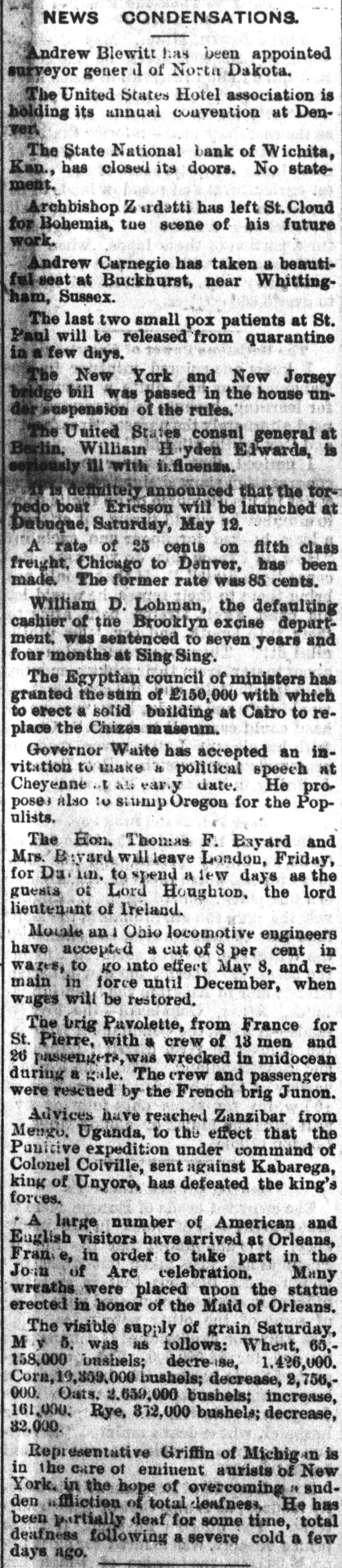 NEWS CONDENSATIONS Andrew Blewitt has been appointed surveyor gener il of Norta Dakota. The United States Hotel association is holding its annual convention at Denvert The State National bank of Wichita, Kan., has closed its doors. No statement. Archbishop Z urdetti has left St. Cloud for Bohemia, tue scene of his future work. Andrew Carnegie has taken a beautiful seat at Buckhurst, near Whittingham, Sussex. The last two small pox patients at St. Paul will be released from quarantine in a few days. The New York and New Jersey bridge bill was passed in the house under suspension of the rules. The United States consul general at Berlin, William yden Eiwards, is seriously ill with influenza. dennitely announced that the torpedo boat Eriesson will be launched at Dabuque, Saturday, May 12. A rate of 25 cents on fifth class freight, Chicago to Denver, has been made. The former rate was 85 cents. William D. Lohman, the defaulting cashier of the Brooklyn excise department. was sentenced to seven years and four months at Sing Sing. The Egyptian council of ministers has granted the sum of £150,000 with which to erect a solid building at Cairo to replace the Chizes museum. Governor Waite has accepted an invitation to make a political speech at Cheyenne at all early date. He propose) also to stump Oregon for the Populists. The Hon. Thomas F. Bayard and Mrs. Biyard willieave London, Friday, for Da. in. to spend a few days as the guests of Lord Houghton, the lord lientenant of Ireland. Motale and Ohio locomotive engineers have accepted a cut of 8 per cent in wazes, to go into effect May 8, and remain in force until December, when wages will be restored. The brig Pavolette, from France for St. Pierre, with a crew of 13 men and 26 passengers, was wrecked in midocean during a gale. The crew and passengers were rescued by the French brig Junon. Advices have reached Zanzibar from Mengo. Uganda, to the effect that the Pauitive expedition under command of Colonel Colville, sent against Kabarega, king of Unyoro, has defeated the king's forces. A large number of American and English visitors have arrived at Orleans, Fran e, in order to take part in the Join of Arc celebration. Many wreaths were placed upon the statue erected in honor of the Maid of Orleans. The visible supply of grain Saturday, M 5. was as follows: Whent, 65,158,000 bushels; decre-ise, 1.426,000. Corn,19,369,000 bushels; decrease, 2,756,000. Oats. 2,659,000 bushels; increase, 161,000. Rye, 372,000 bushels; decrease, 32.000. Representative Griffin of Michig in is in the care of emiuent aurists of New York. in the hope of overcoming a sudden iffiction of total leafness. He has been partially deaf for some time, total deafness following a severe cold a few days ago.