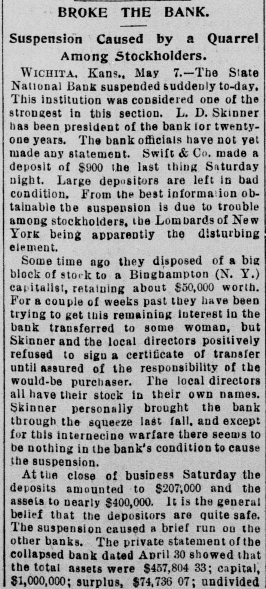 BROKE THE BANK. Suspension Caused by a Quarrel Among Stockholders. WICHITA, Kans., May 7.-The State National Bank suspended suddenly to-day. This institution was considered one of the strongest in this section. L. D. Skinner has been president of the bank for twentyone years. The bank officials have not yet made any statement. Swift & Co. made a deposit of $900 the last thing Saturday night. Large depositors are left in bad condition. From the best information obtainable the suspension is due to trouble among stockholders, the Lombards of New York being apparently the disturbing element. Some time ago they disposed of a big block of stock to a Bingbampton (N. Y.) capitalist, retaining about $50,000 worth. For a couple of weeks past they have been trying to get this remaining interest in the bank transferred to some woman, but Skinner and the local directors positively refused to sign a certificate of transfer until assured of the responsibility of the would-be purchaser. The local directors all have their stock in their own names. Skinner personally brought the bank through the squeeze last fall, and except for this internecine warfare there seems to be nothing in the bank's condition to cause the suspension. At the close of business Saturday the deposits amounted to $207,000 and the asseis to nearly $400,000. It is the general belief that the depositors are quite safe. The suspension caused a brief run ou the other banks. The private statement of the collapsed bank dated April 30 showed that the total assets were $457,804 33; capital, $1,000,000; surplus, $74,736 07; undivided